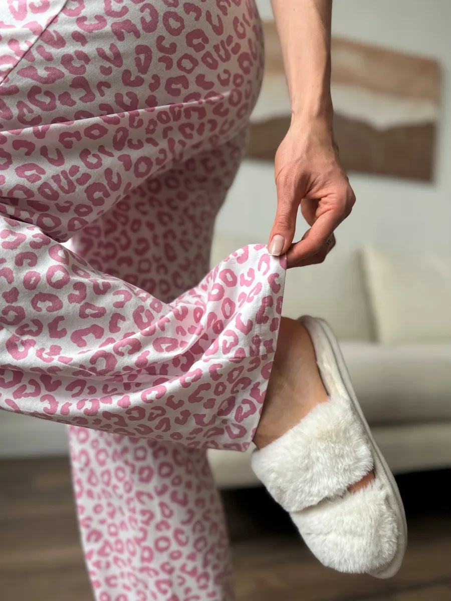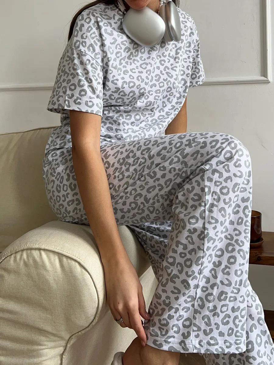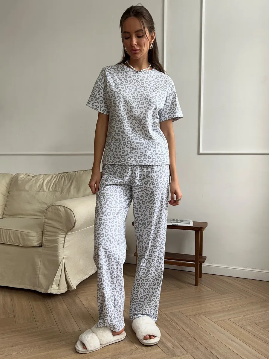 유럽과 미국 스타일의 잠옷 여름 2025 새로운 국경 간 대외 무역 인기 표범 인쇄 소녀 간단한 캐주얼 정장 바지스토어 가기