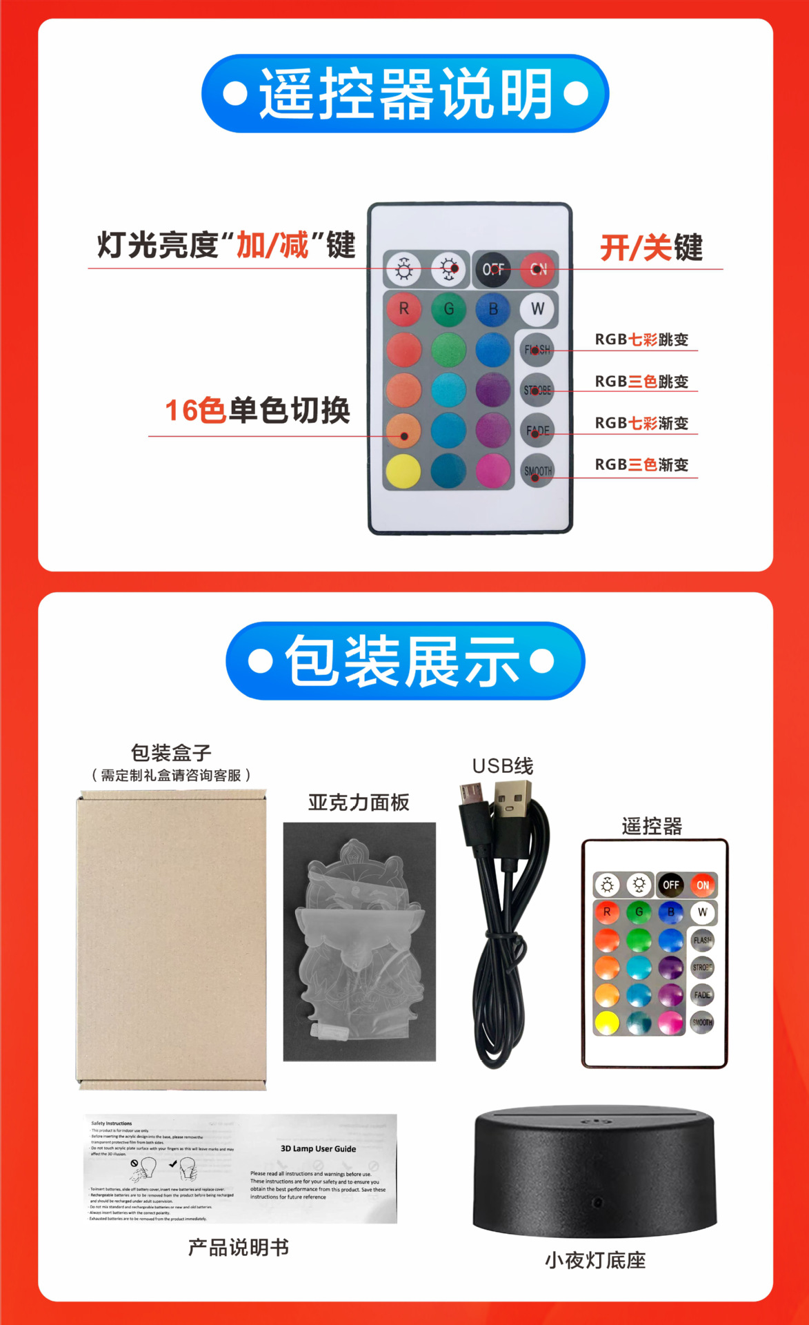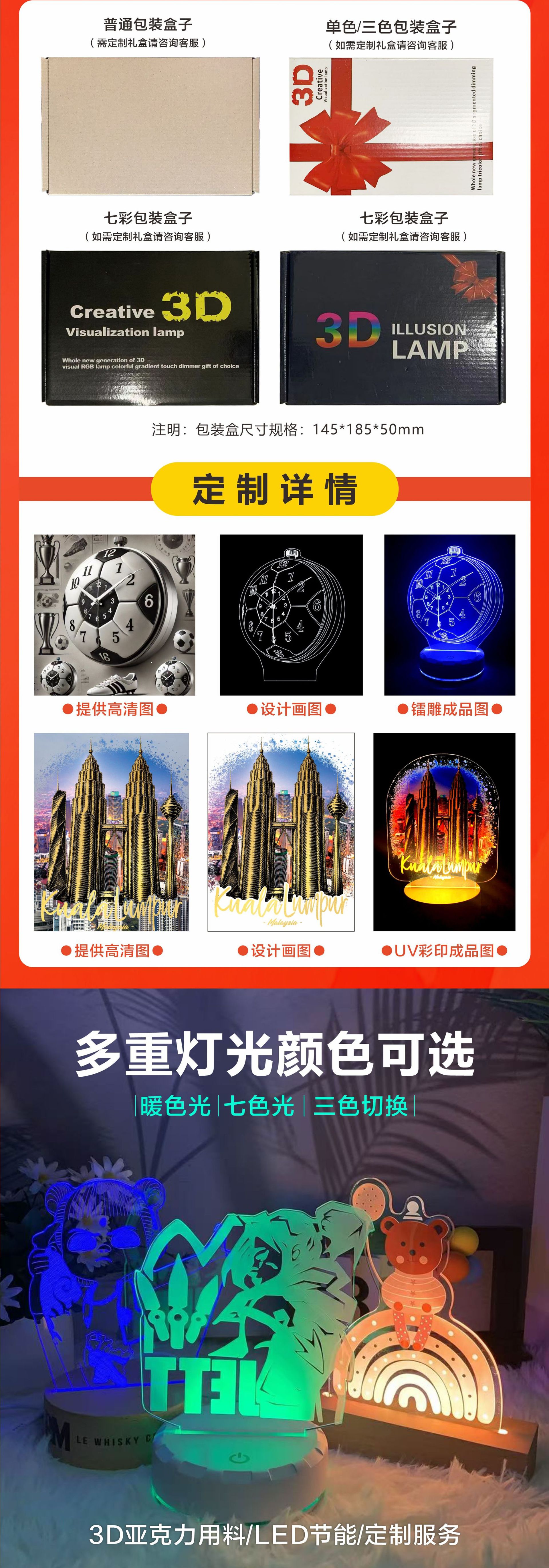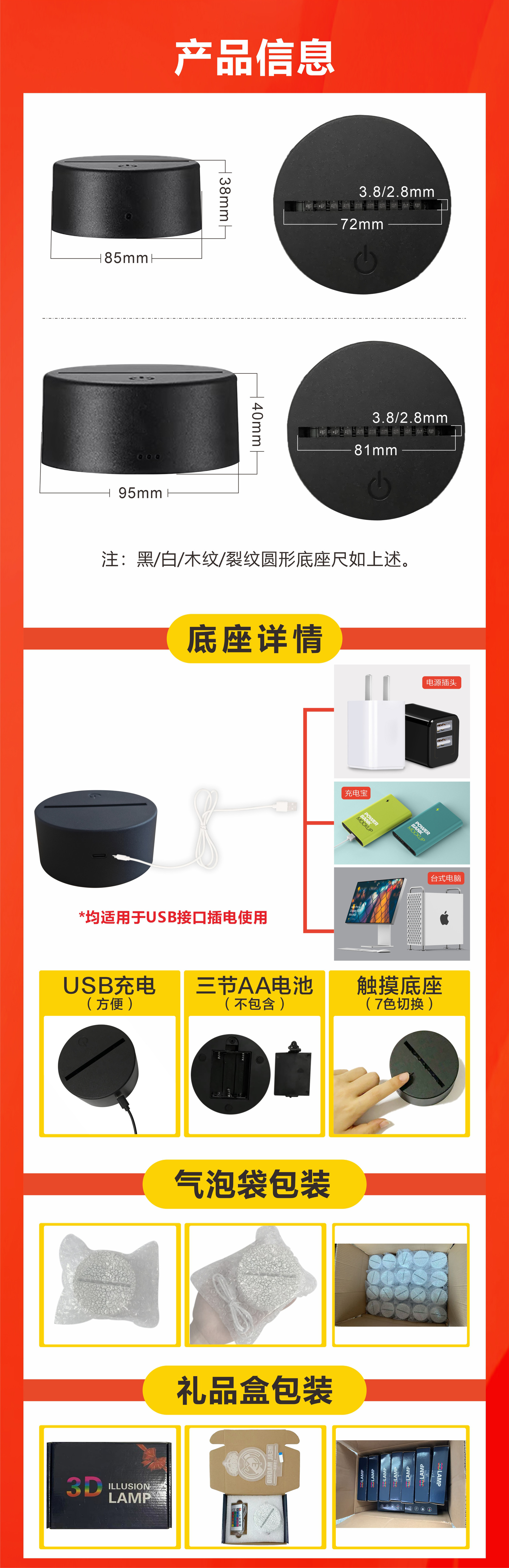 공장 직접 판매 3d 야간 조명베이스 usb 3색 단색 균열 다채로운 터치 원격 제어 배터리 충전 나뭇결스토어 가기