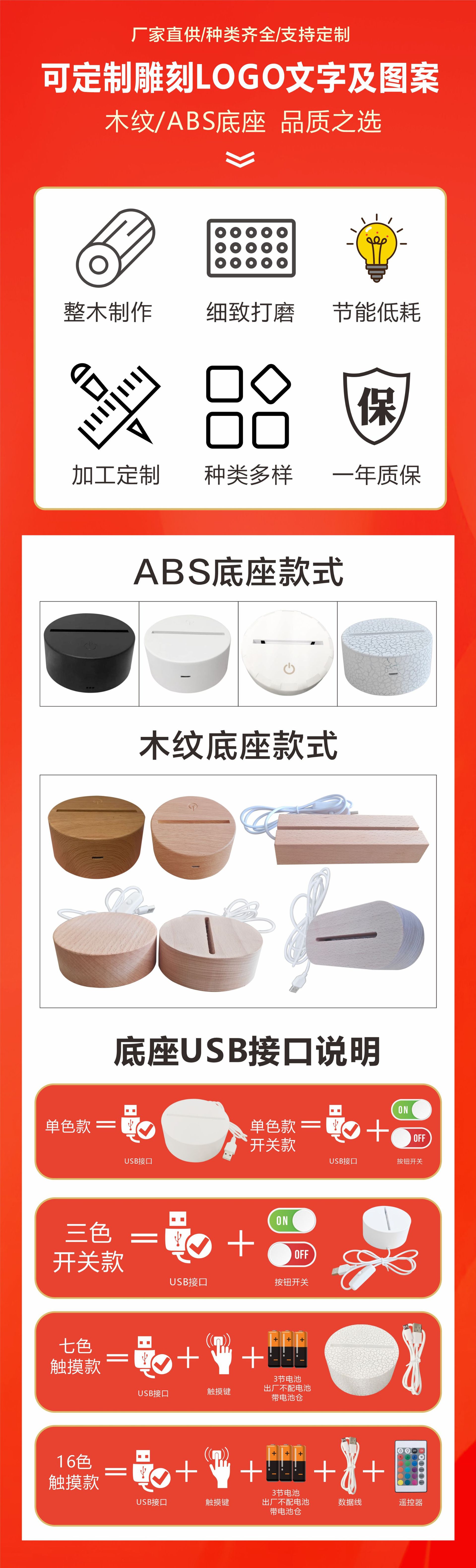 공장 직접 판매 3d 야간 조명베이스 usb 3색 단색 균열 다채로운 터치 원격 제어 배터리 충전 나뭇결