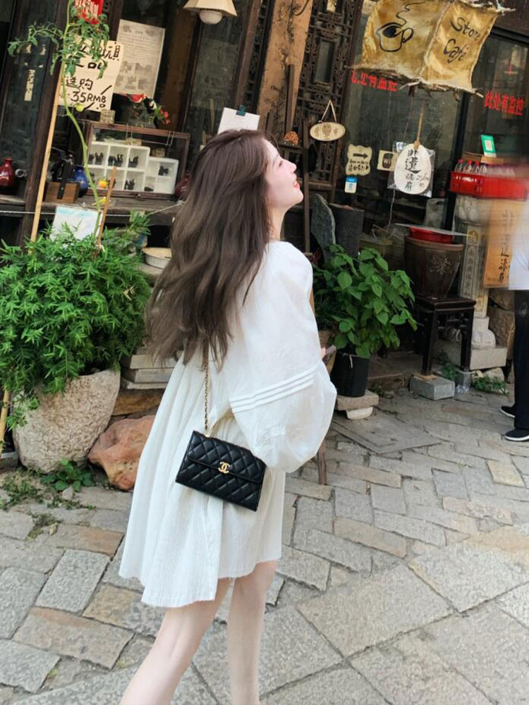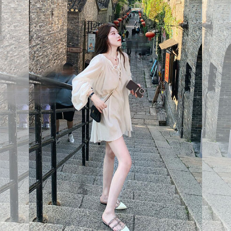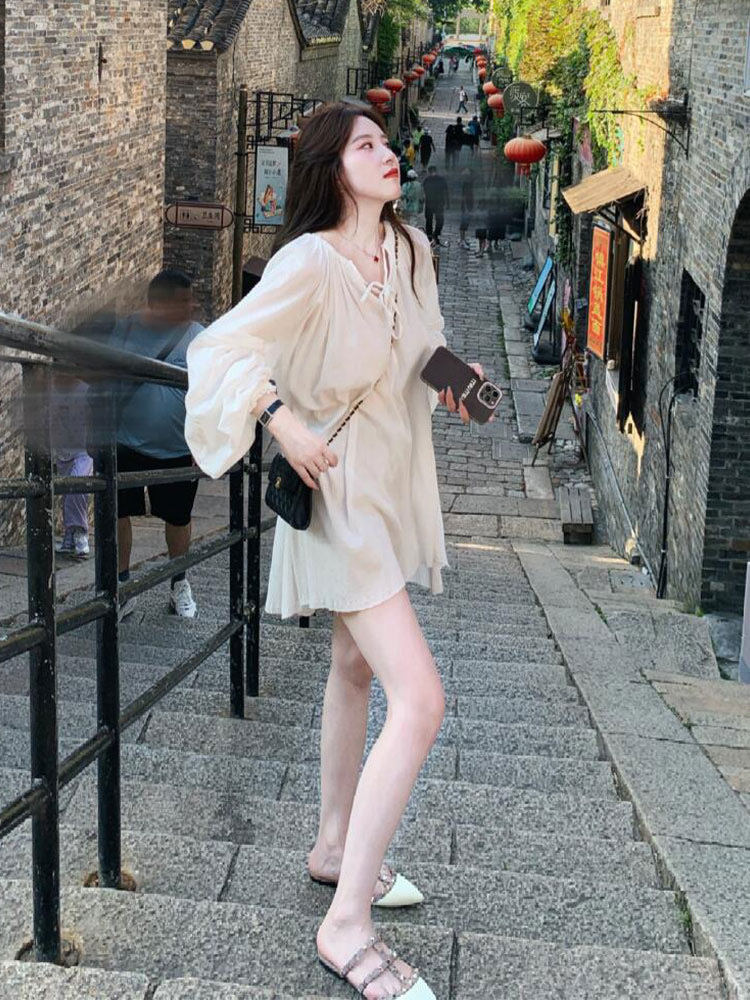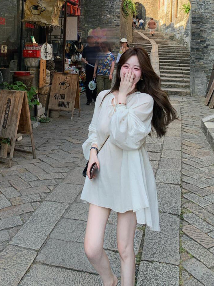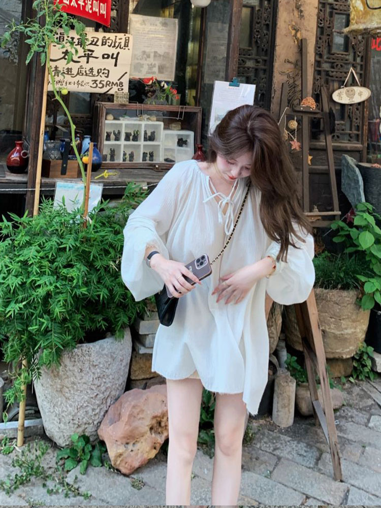 OK-169 중간 길이 엉덩이 커버 퍼프 슬리브 탑 봄 스타일 연령 감소 화이트 브이넥 셔츠 여성 쉬폰 셔츠스토어 가기