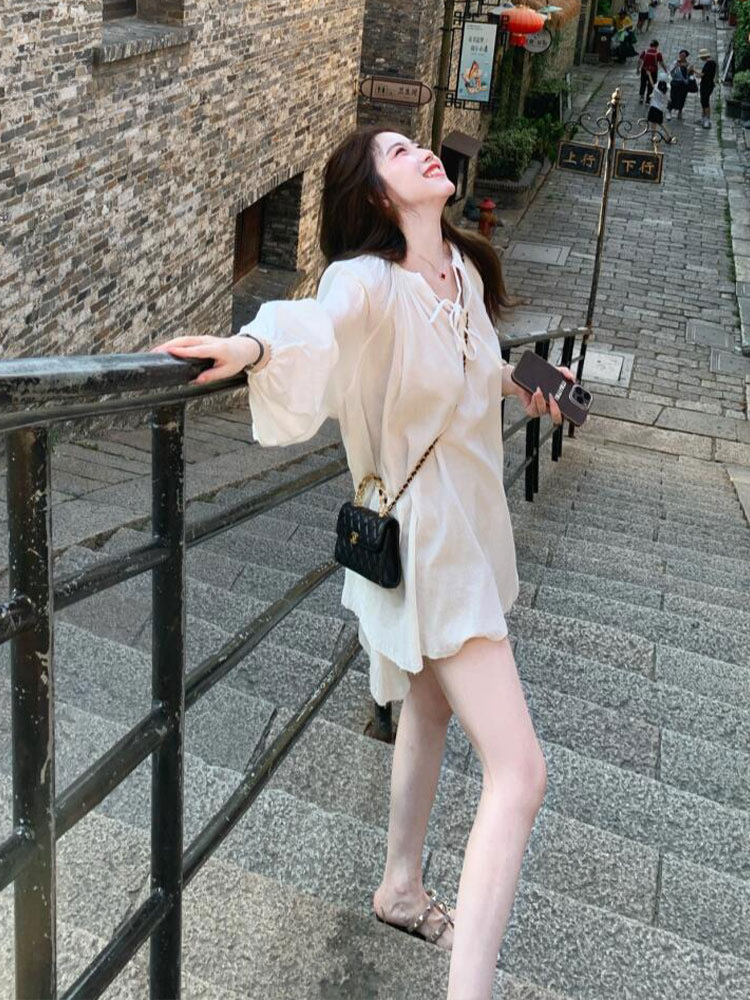 OK-169 중간 길이 엉덩이 커버 퍼프 슬리브 탑 봄 스타일 연령 감소 화이트 브이넥 셔츠 여성 쉬폰 셔츠