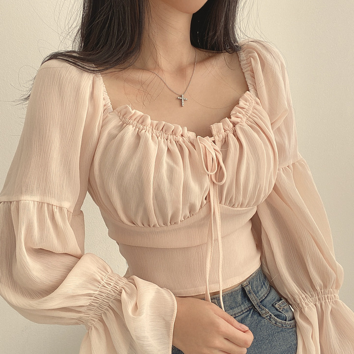 대외 무역 국경 간 여성 의류 도매 한국 버섯 레이스 업 스퀘어 넥 허리 벨 슬리브 쉬폰 셔츠 여성용 짧은 셔츠