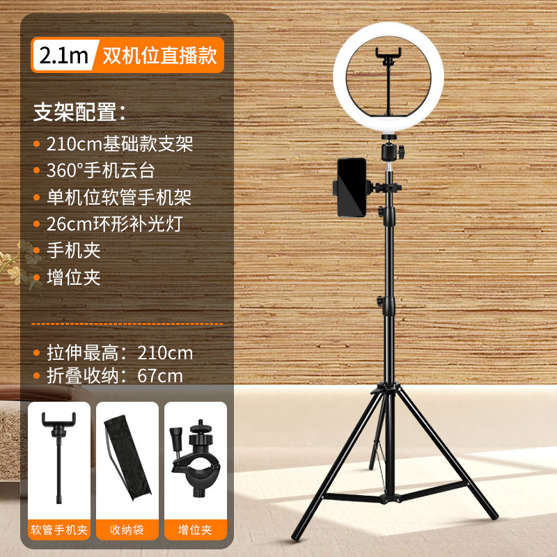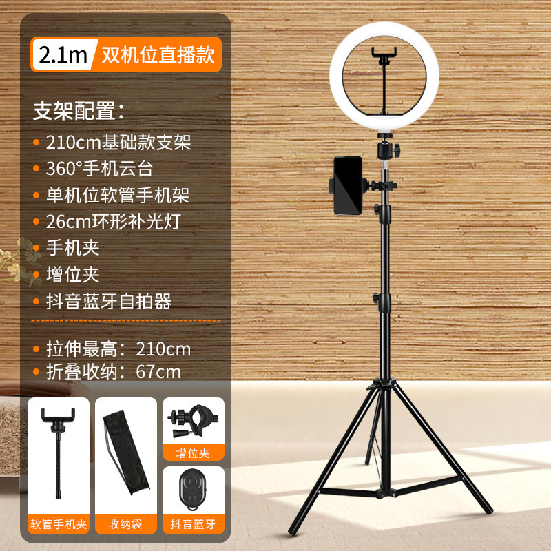 • 2.1m 휴대폰 홀더 + 26cm 링 라이트 [업그레이드 및 강화] 단일 카메라 + Douyin 셀카 + 무료 보관 가방
