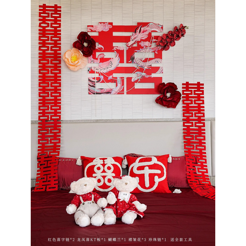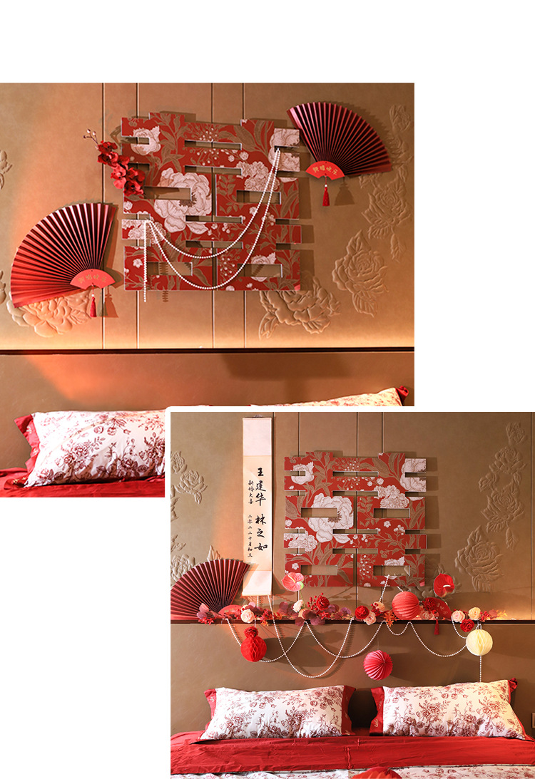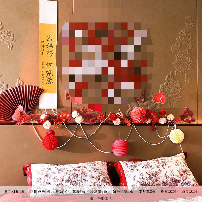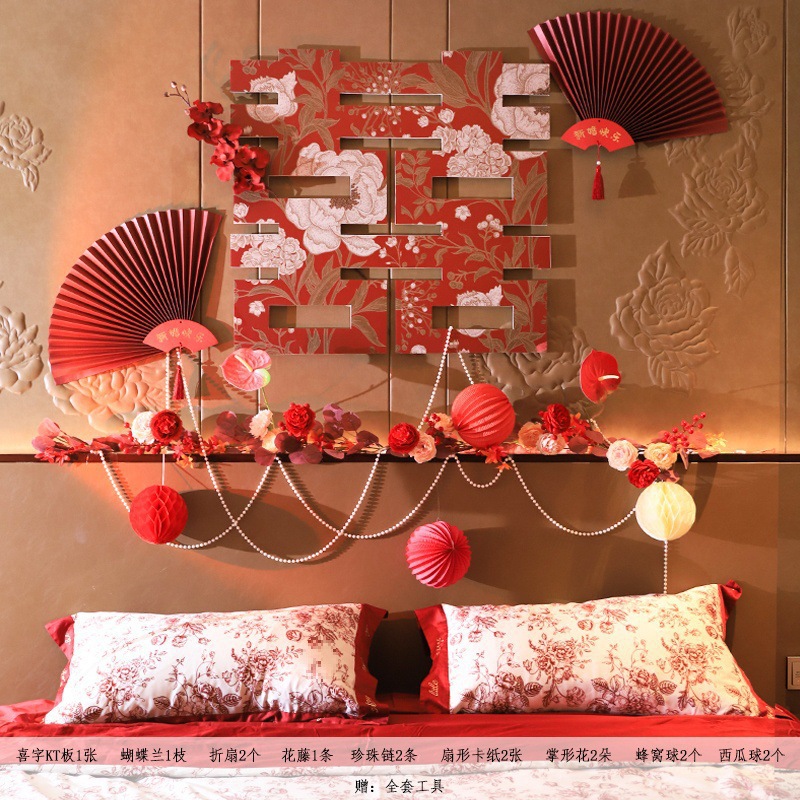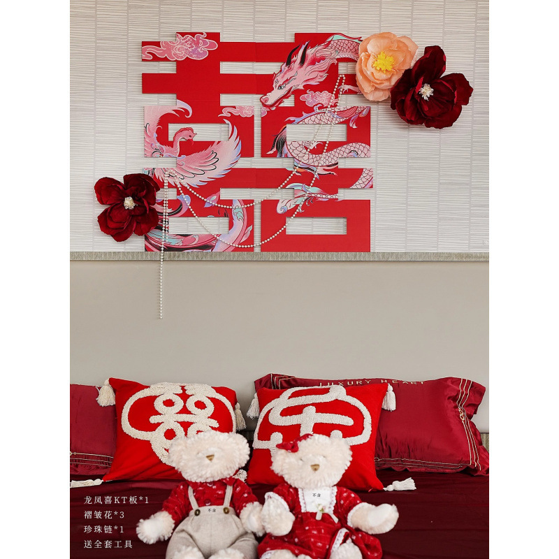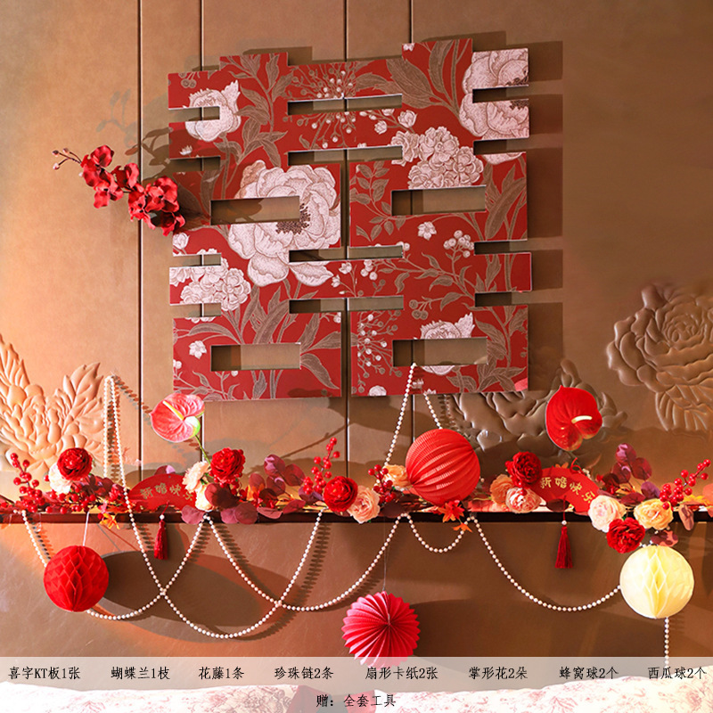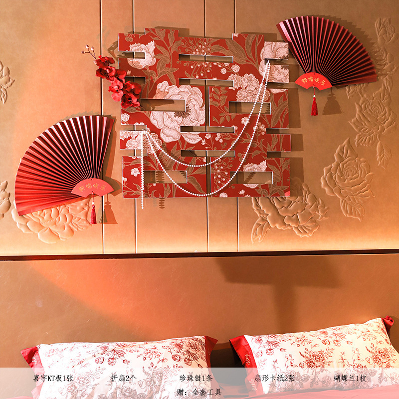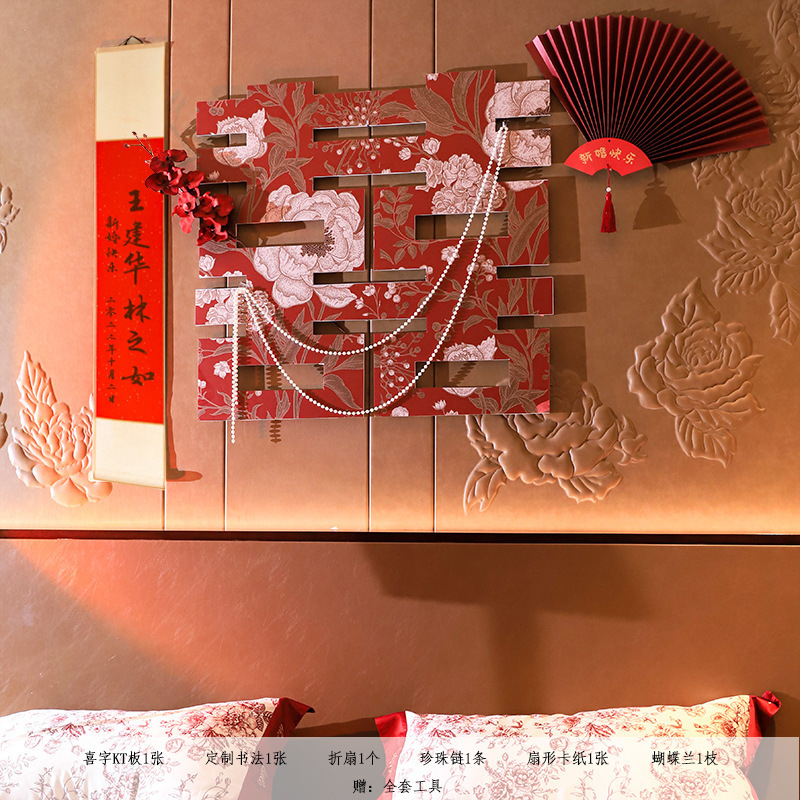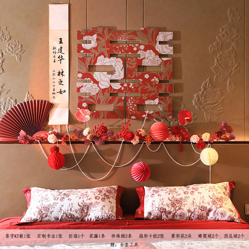 여성의 꽃 매듭 호텔 침대 옆 배경 벽 웨딩 용품 행복한 단어 웨딩 룸 레이아웃 세트 침실 장식 새 집스토어 가기