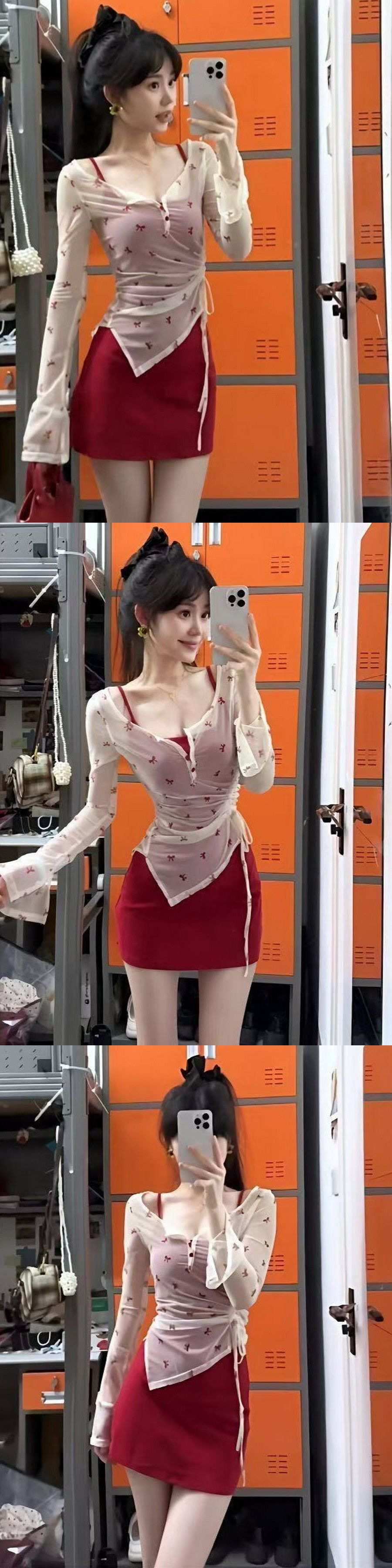 • 흰색 블라우스 + 빨간색 서스펜더 스커트 정장
