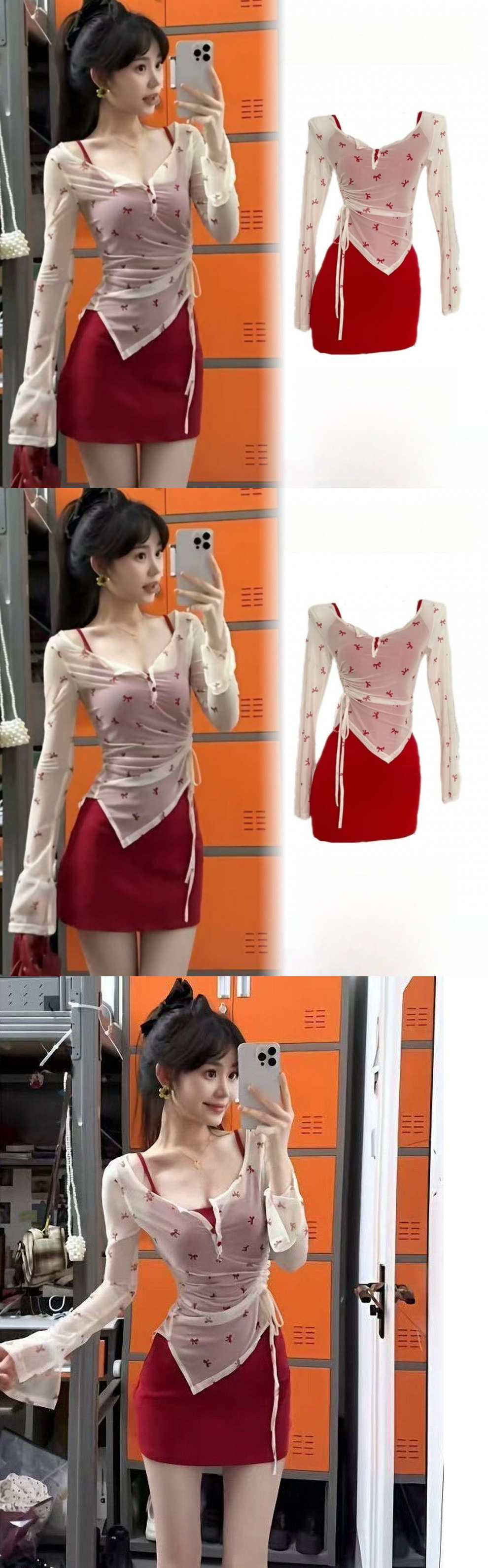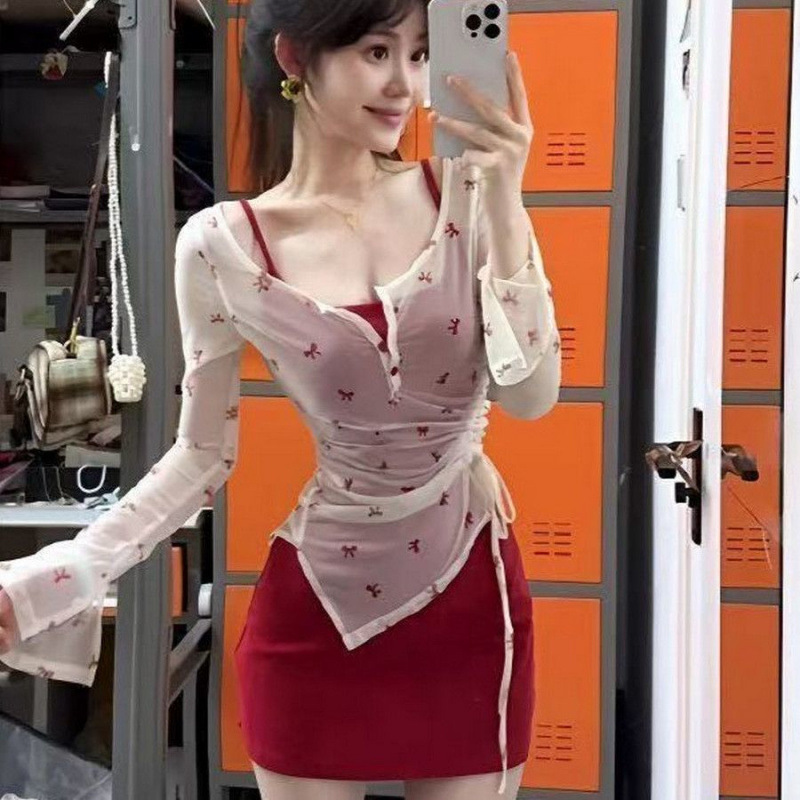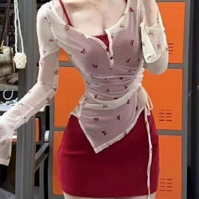 봄 여름 의상, 독특하고 아름다운 여성용 작은 양복, 순수한 섹시 스타일의 긴팔 자외선 차단 블라우스, 서스펜더 스커트 투피스 세트스토어 가기