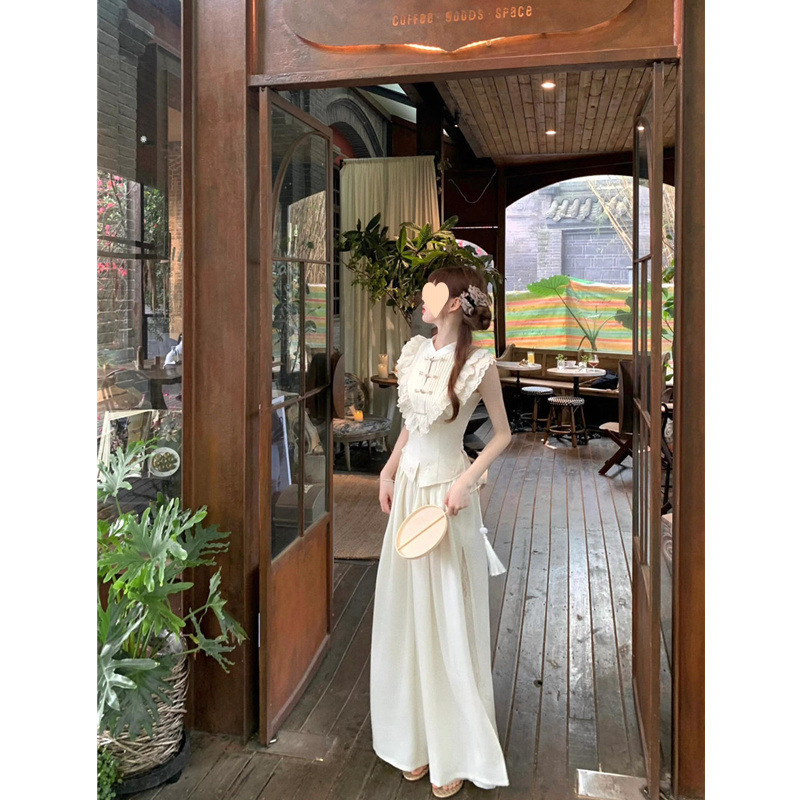 새로운 중국 스타일의 고급 불규칙한 플라잉 슬리브 탑 여름 달콤한 핫 소녀 슬리밍 바지 정장 여성용스토어 가기