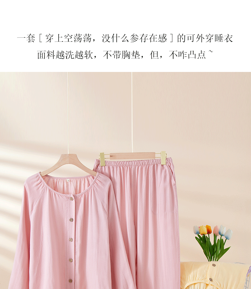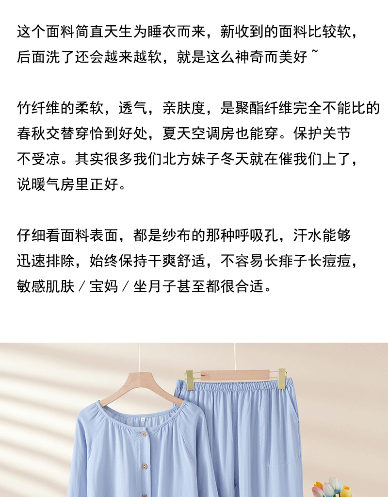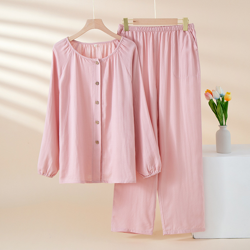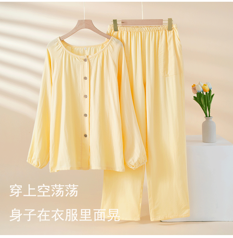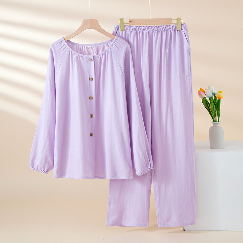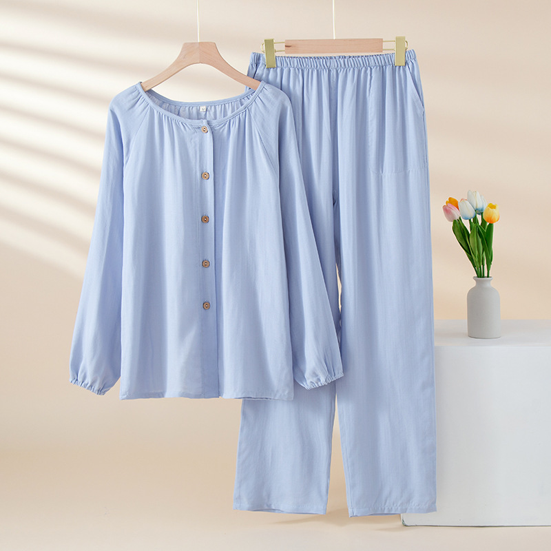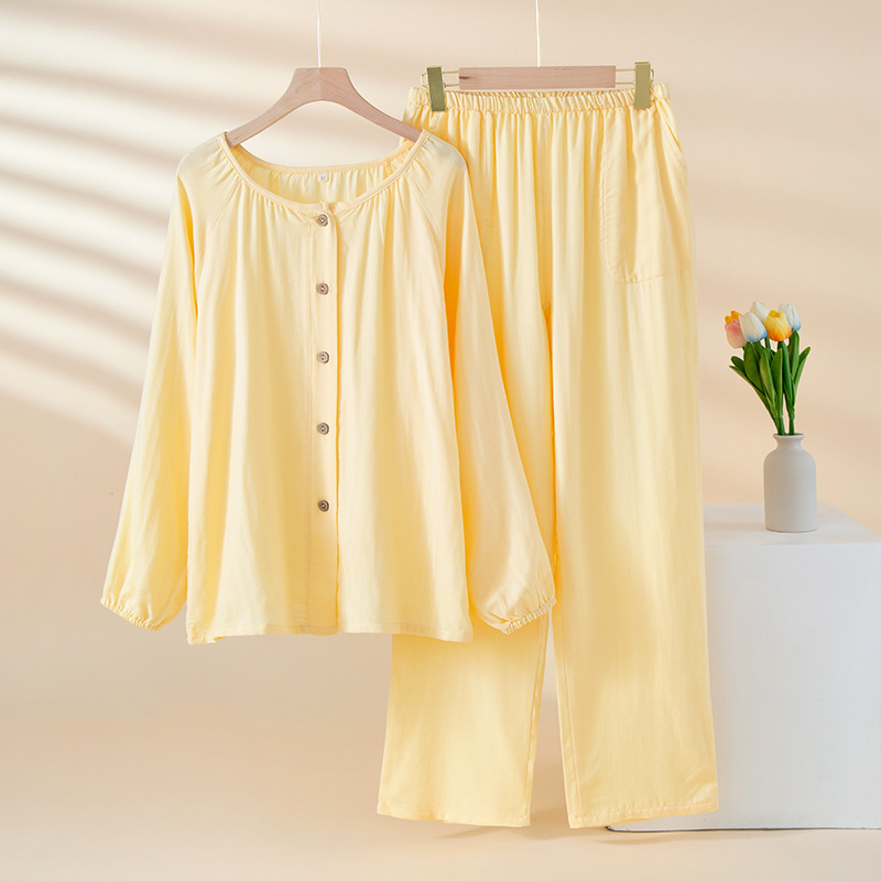 여성을위한 대나무 섬유 라운드 넥 잠옷 봄, 가을 얇은 에어컨 룸 코튼 카디건 긴팔 바지 통기성 솔리드 컬러 홈웨어 세트