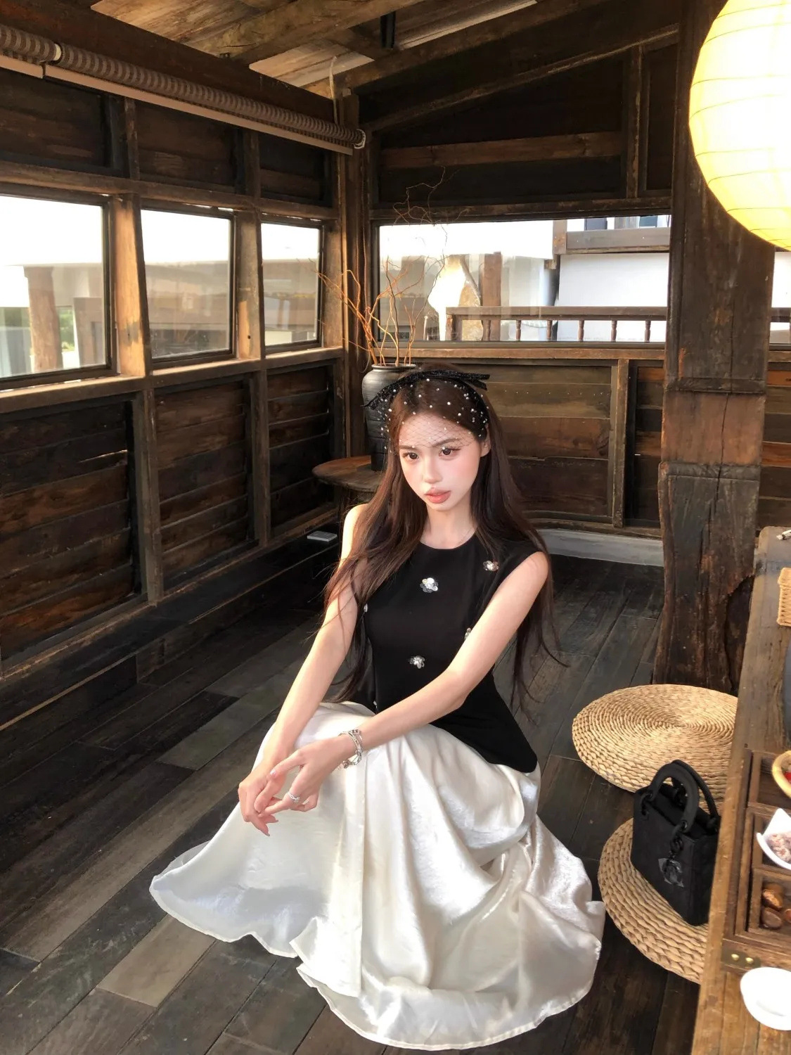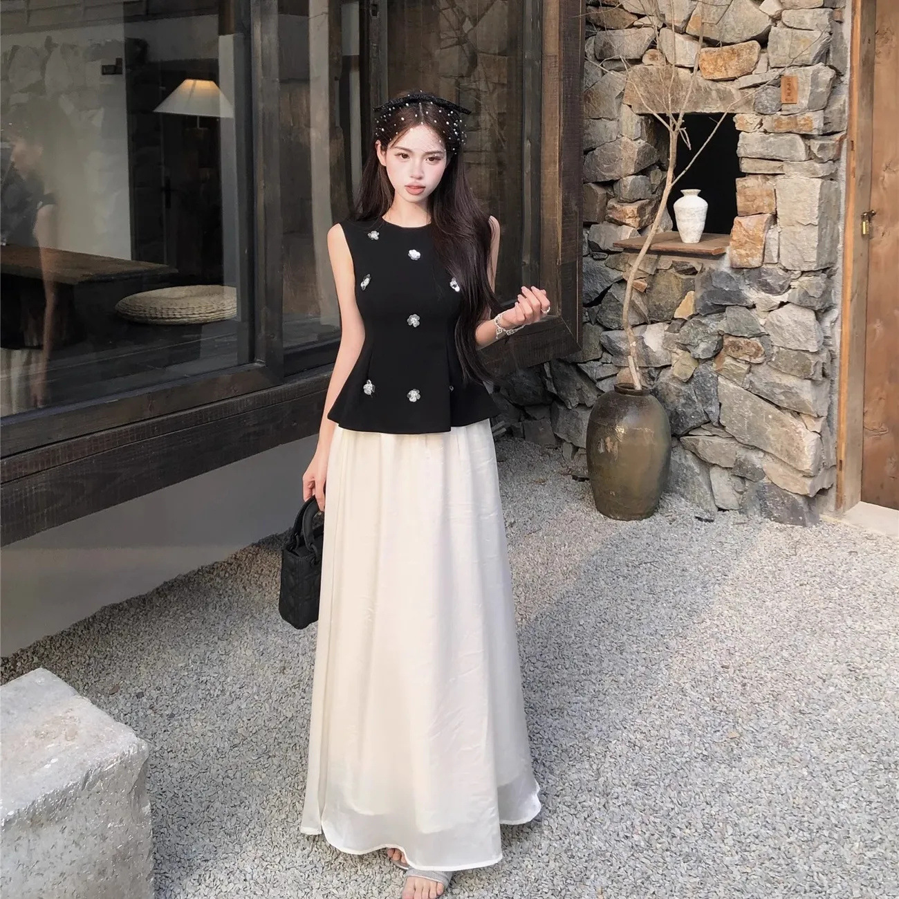 여름용 여성용 검은색 입체 꽃조끼, 민소매 하의, 디자인 라운드넥, 슬림한 허리, 기질 슈트