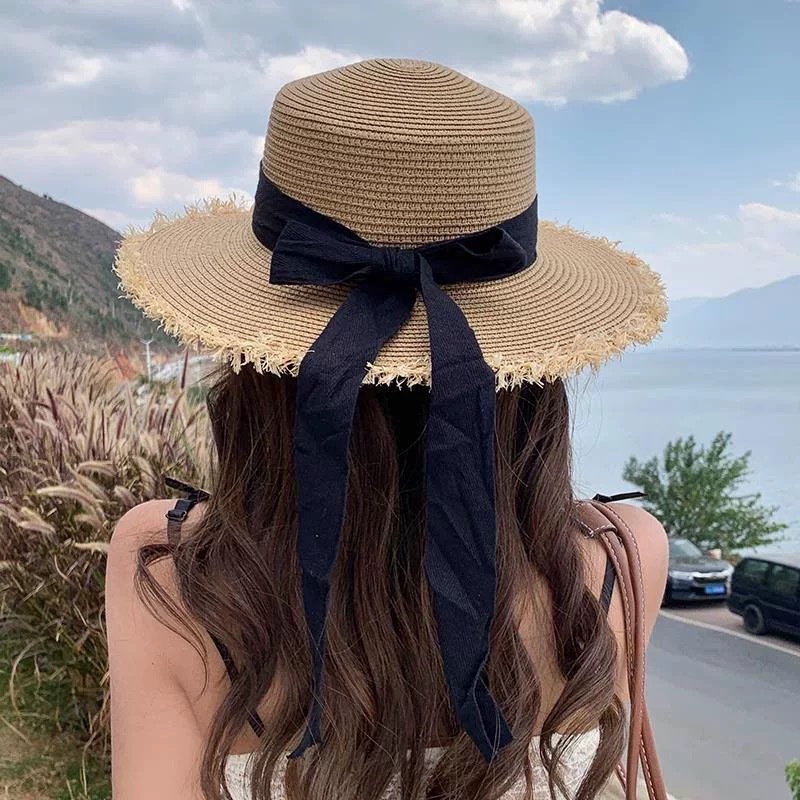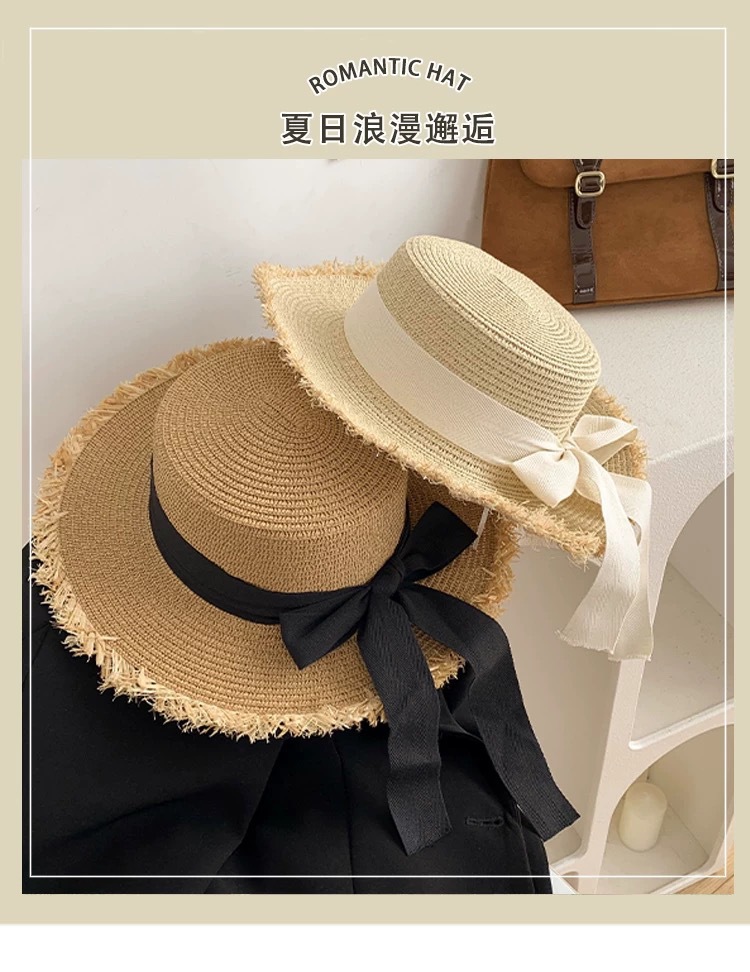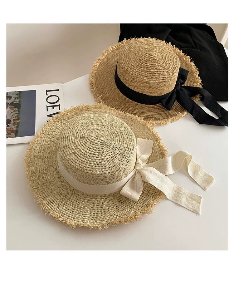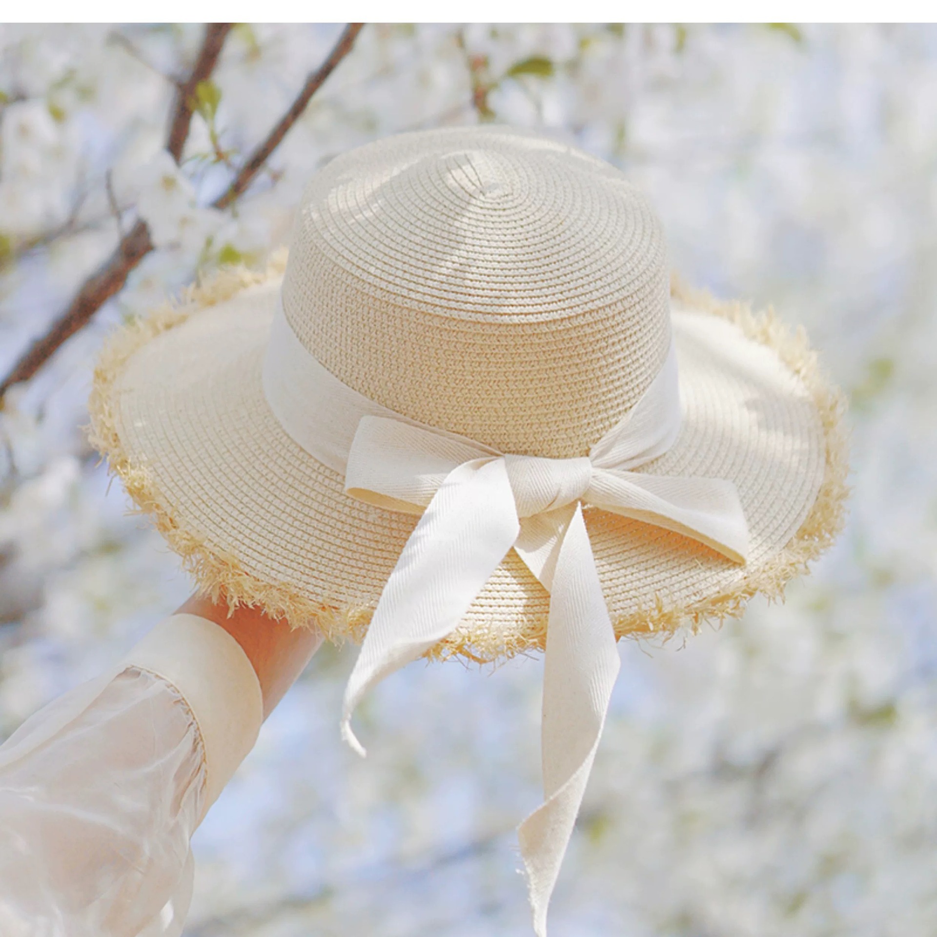 여성을위한 Bowknot Raw Edge 플랫 탑 밀짚 모자 여름 해변 해변 휴가 일본 하와이 태양 직조 태양 모자