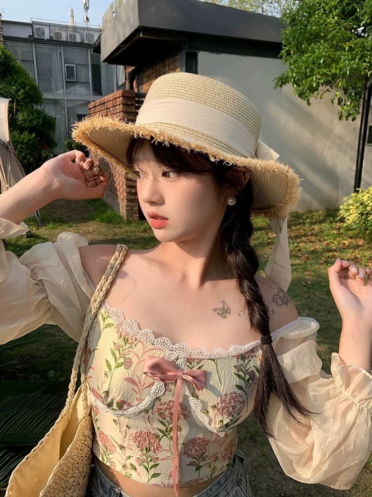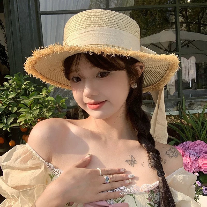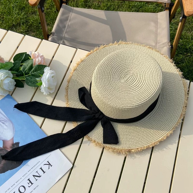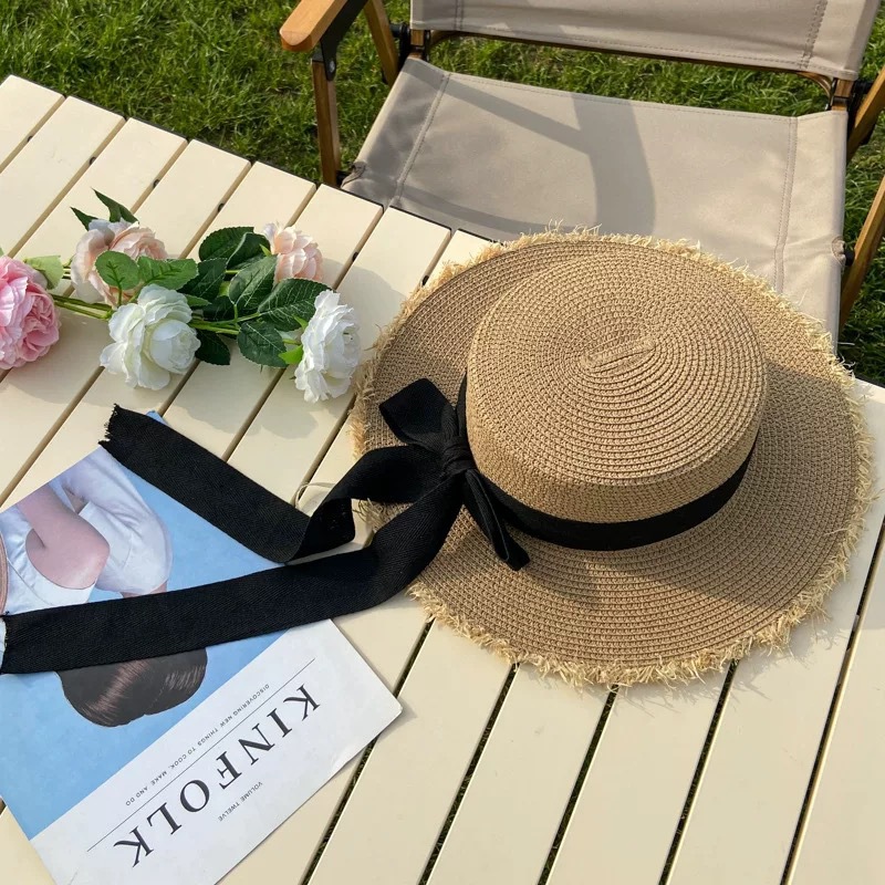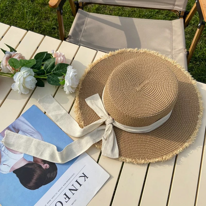 여성을위한 Bowknot Raw Edge 플랫 탑 밀짚 모자 여름 해변 해변 휴가 일본 하와이 태양 직조 태양 모자