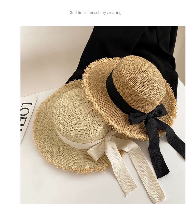여성을위한 Bowknot Raw Edge 플랫 탑 밀짚 모자 여름 해변 해변 휴가 일본 하와이 태양 직조 태양 모자스토어 가기