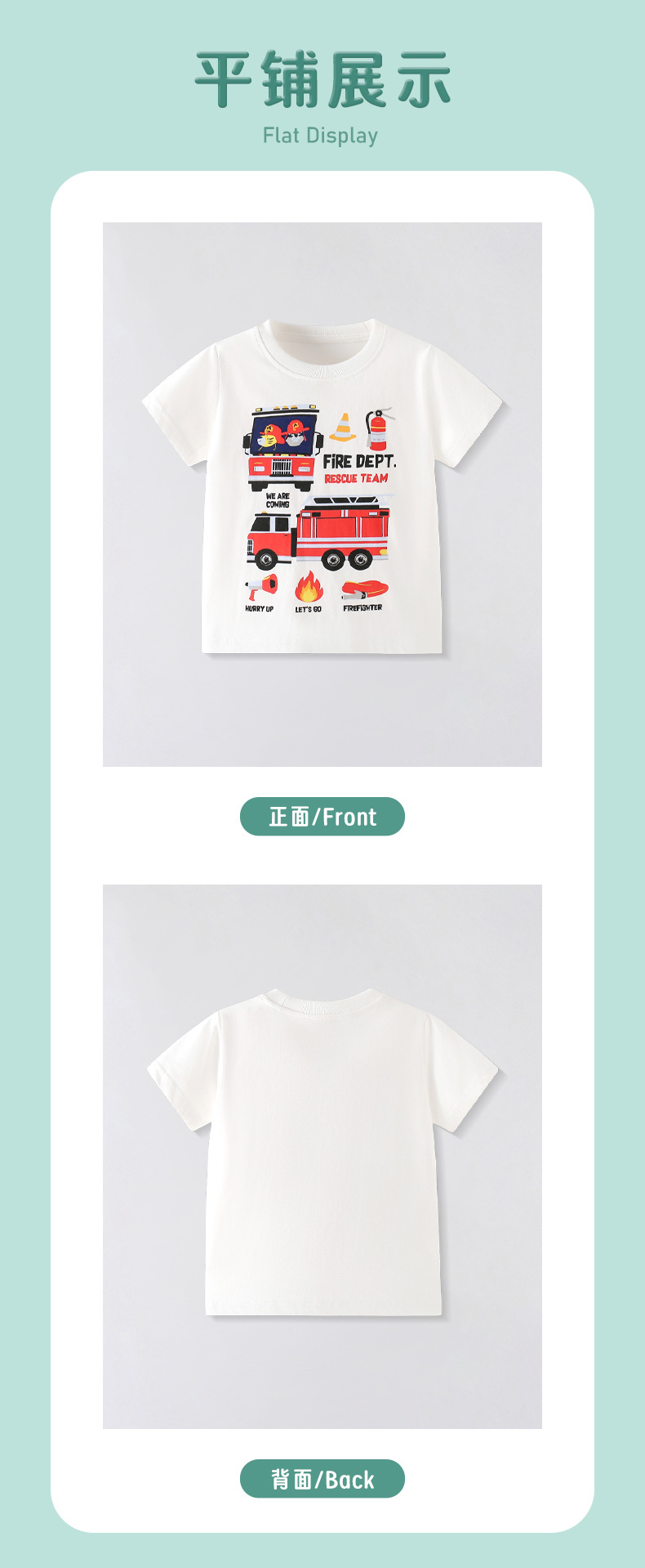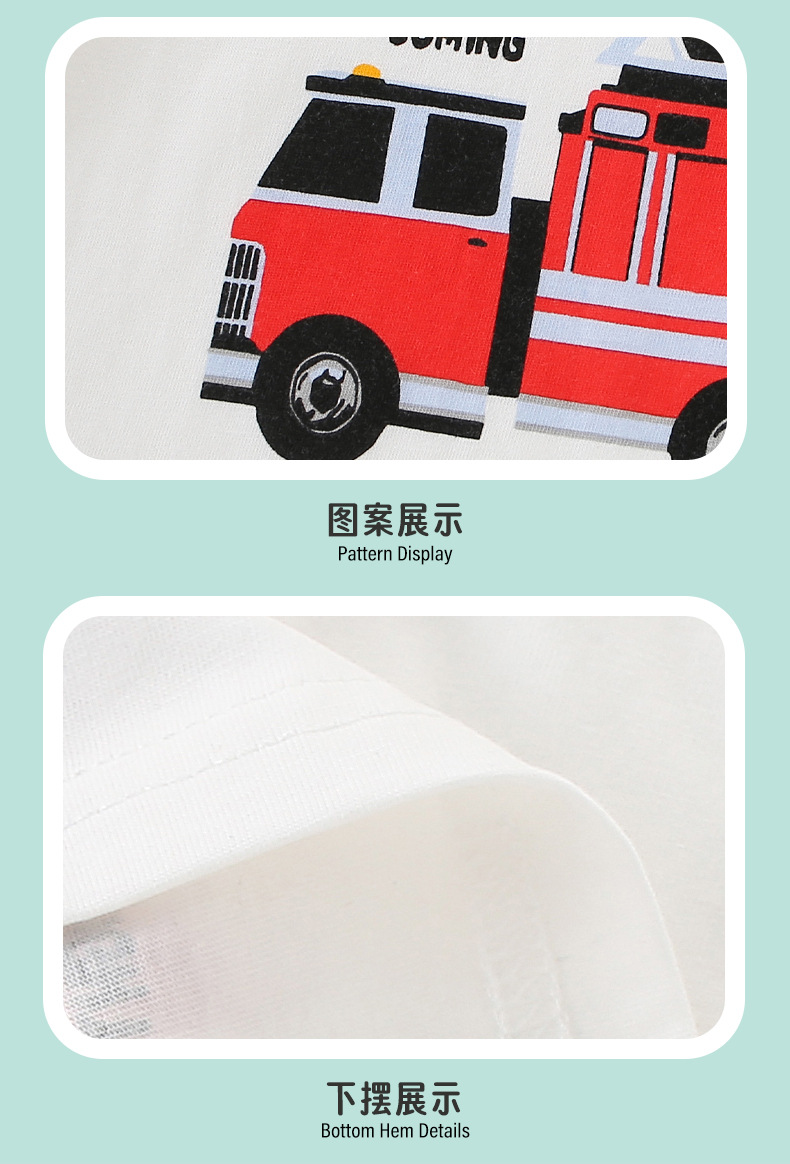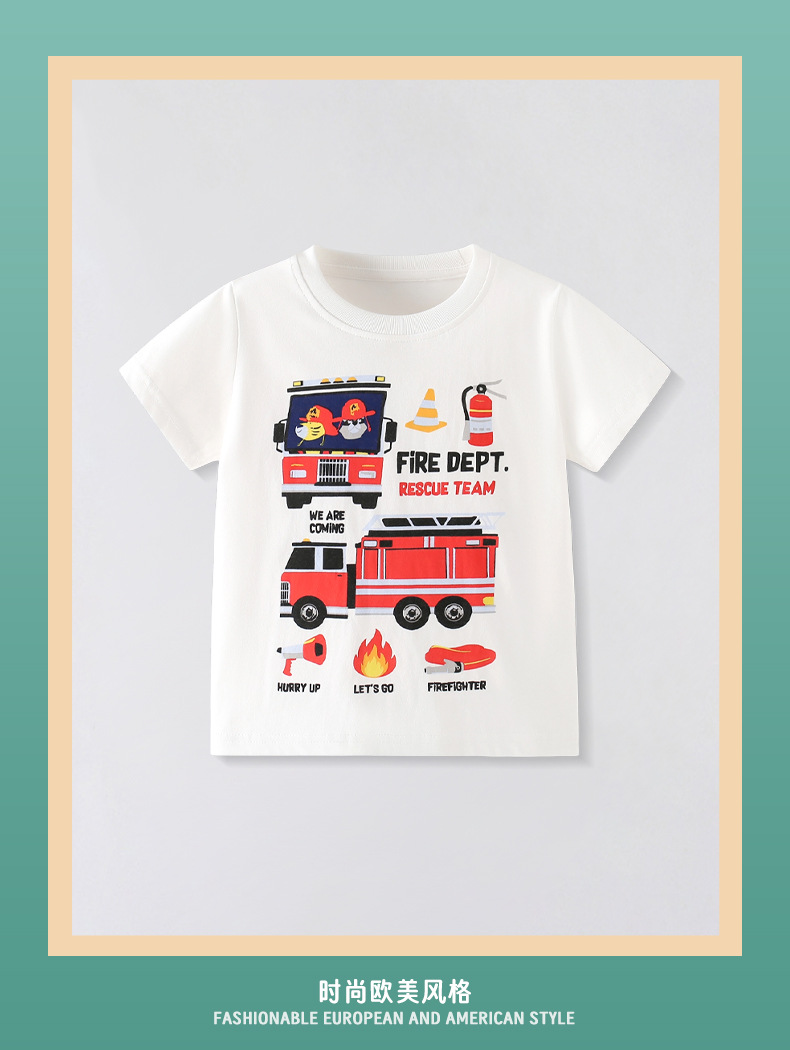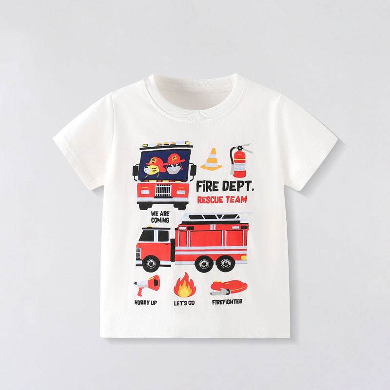 2025년 여름 새로운 어린이 캐주얼 패션 반팔 티셔츠 소년 만화 소방차 순수 코튼 탑 의류스토어 가기