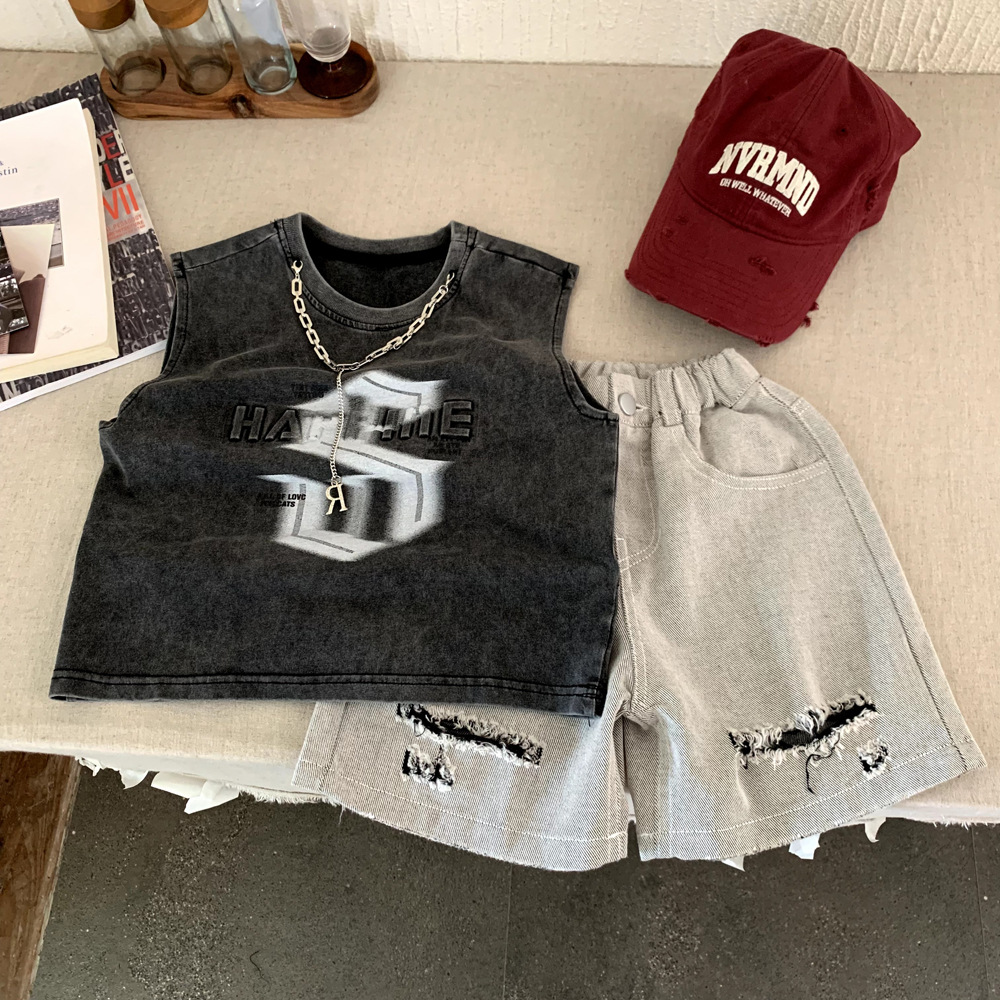 남아용 조끼 정장, 패셔너블한 아동용 한국 스타일 스포츠 여름 옷 2025 새로운 스타일의 어린 소년 유행 아동복 민소매