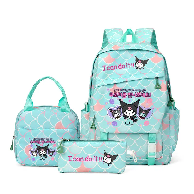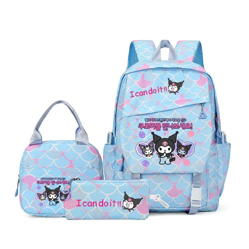 초등학생을위한 새로운 만화 패턴 Kuromi 3 피스 세트 대용량 학교 가방 점심 가방 연필 가방 야외 여행 가방