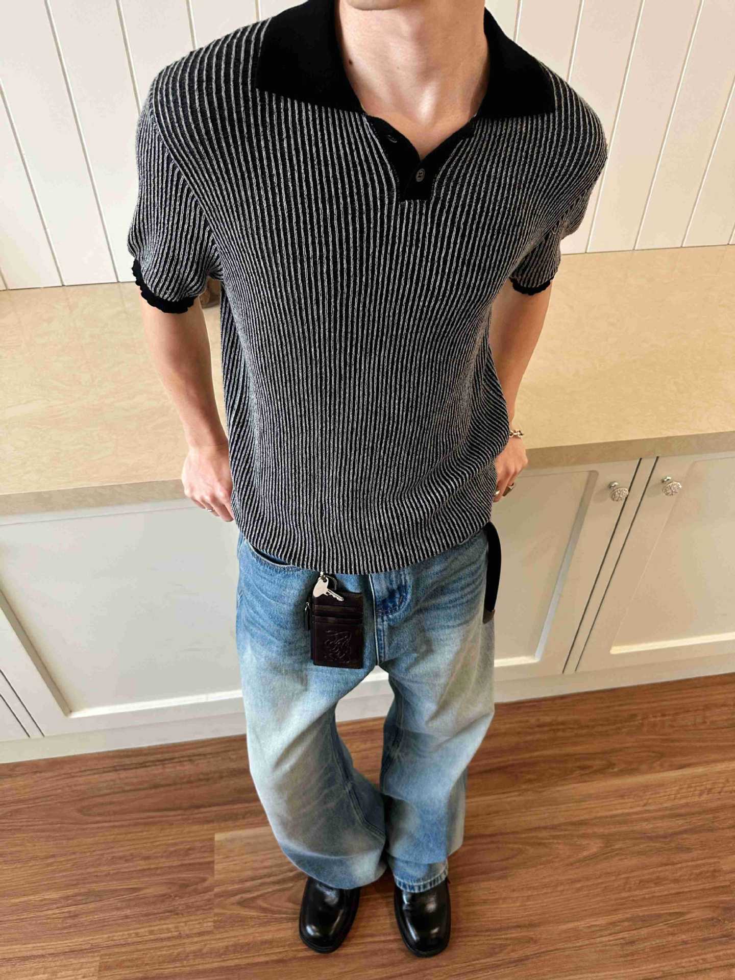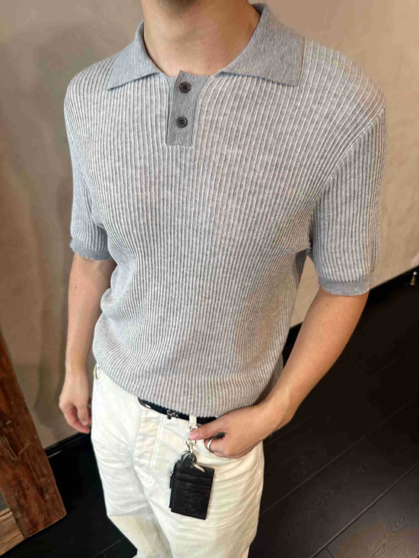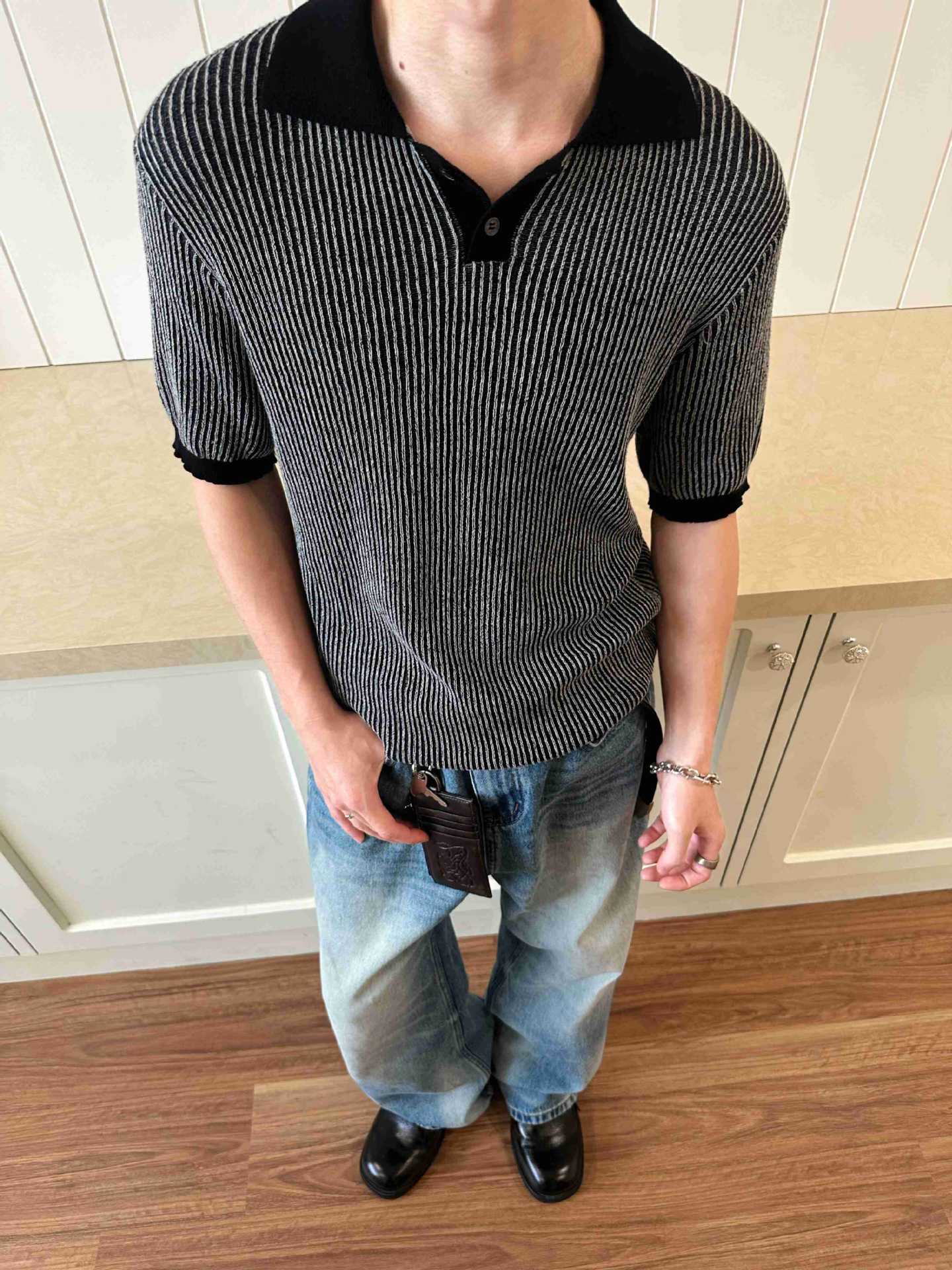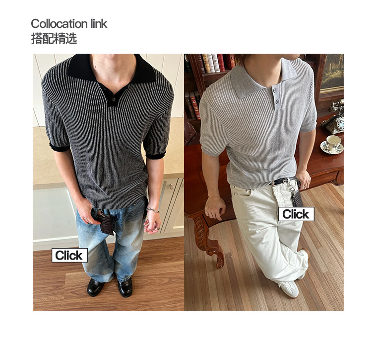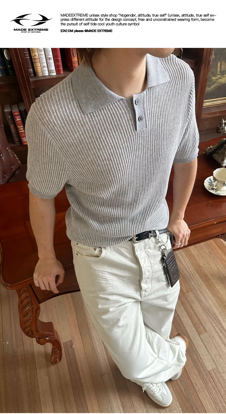 EME 남성 의류 올드 머니 스타일 레트로 갈매기 칼라 파인 핏 스트립 스트레치 반팔 여름 캐주얼 스웨터 티셔츠스토어 가기