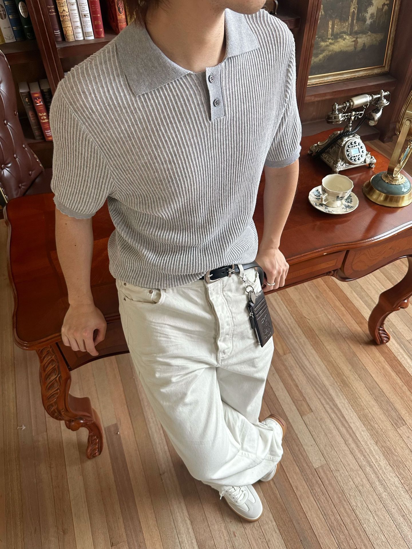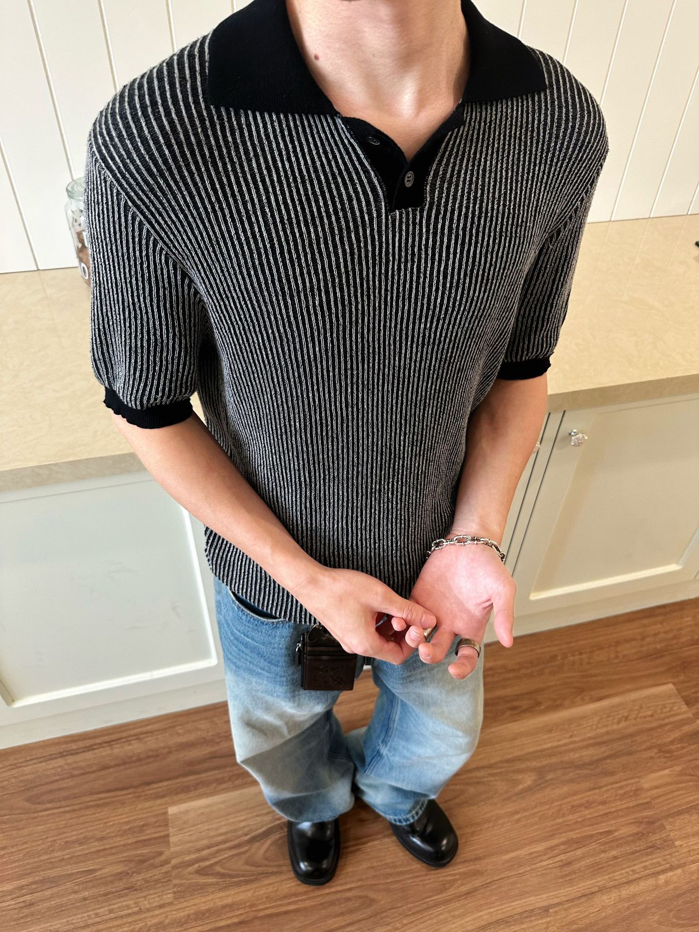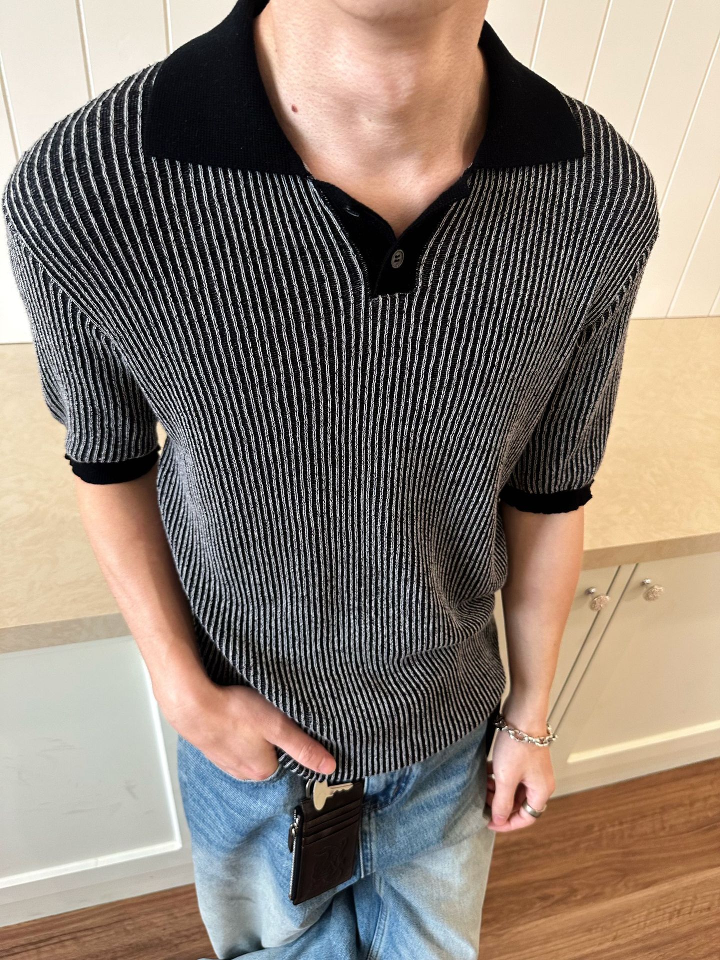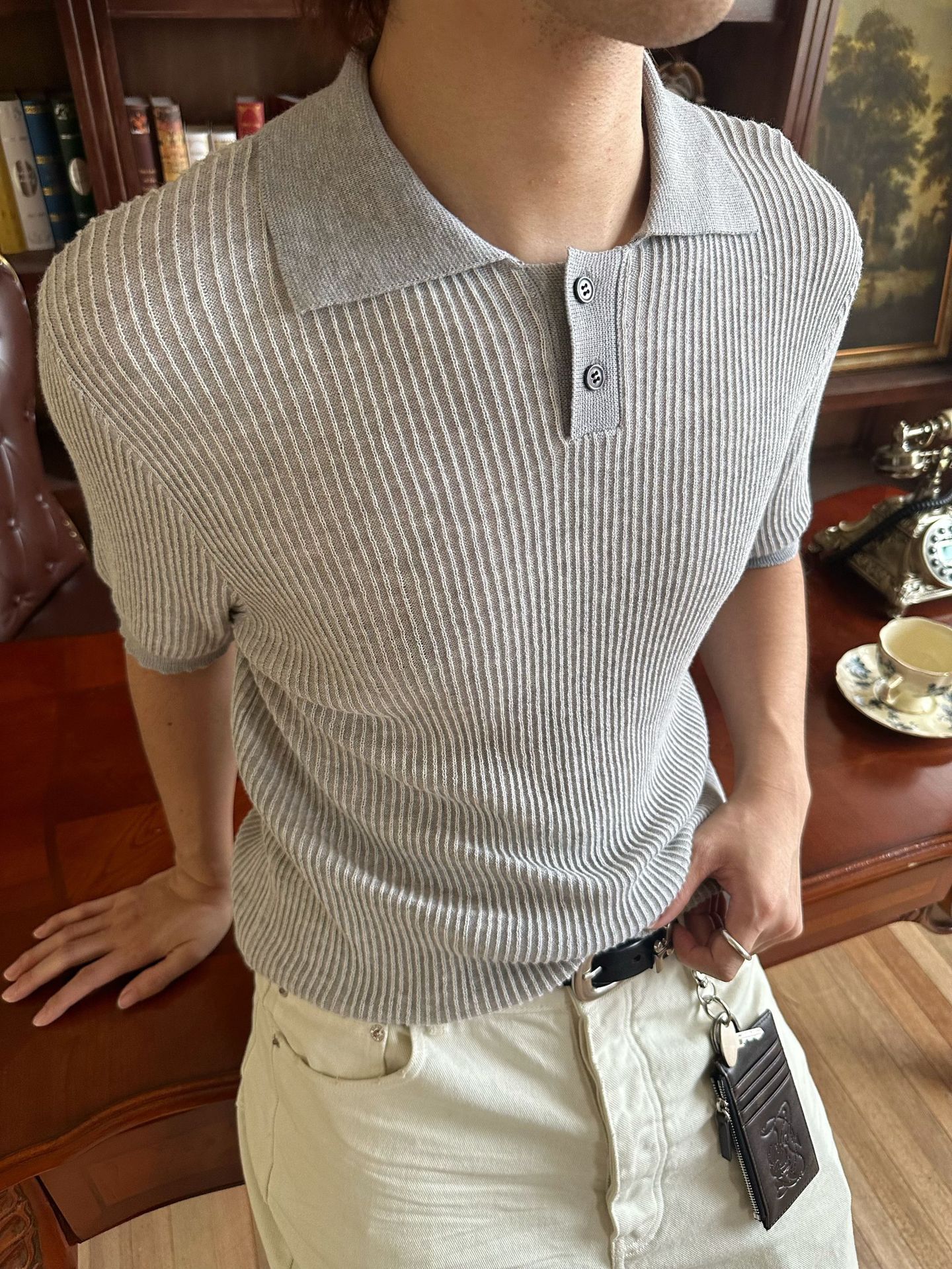 EME 남성 의류 올드 머니 스타일 레트로 갈매기 칼라 파인 핏 스트립 스트레치 반팔 여름 캐주얼 스웨터 티셔츠스토어 가기