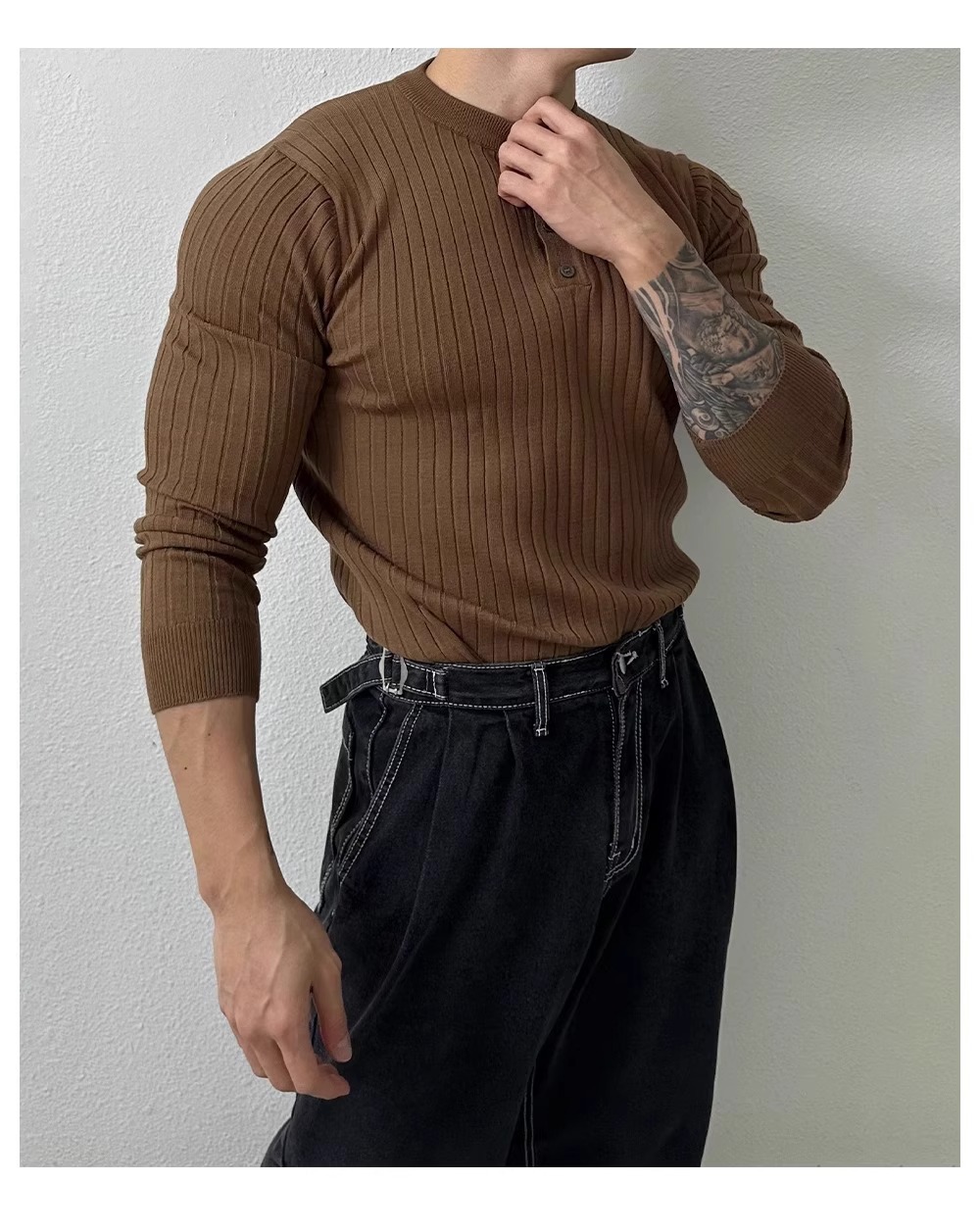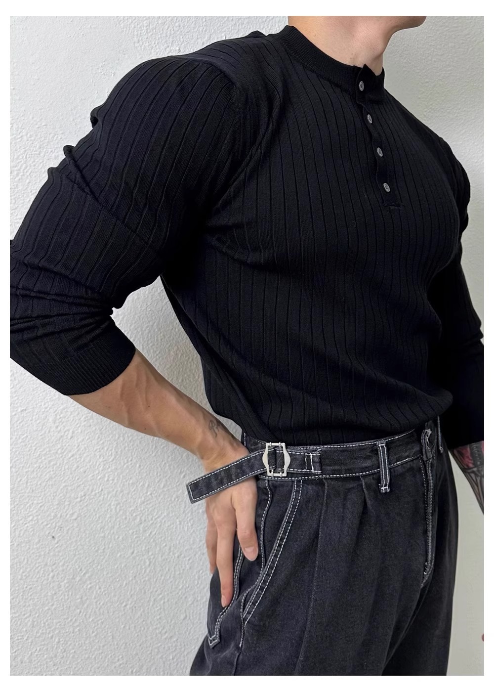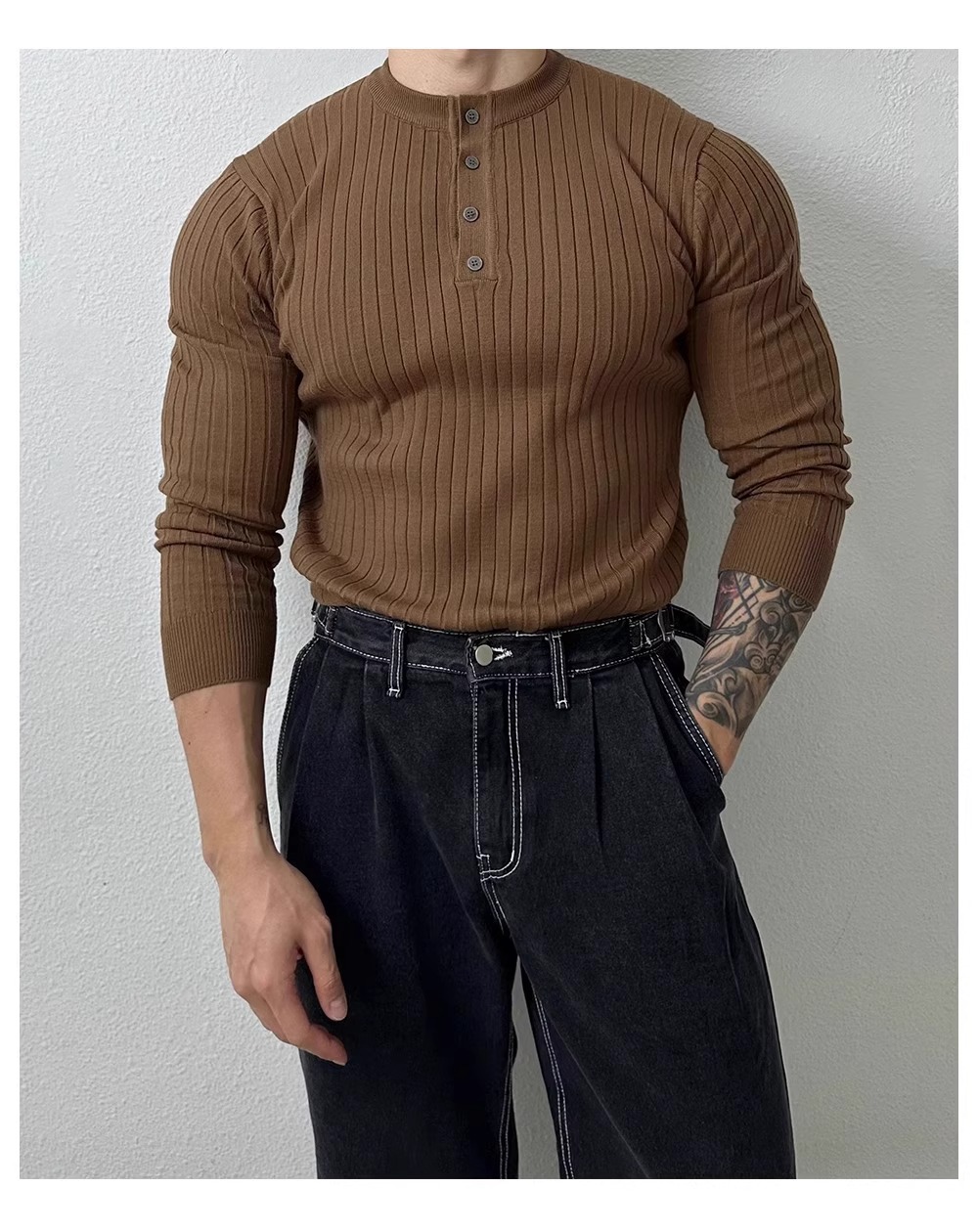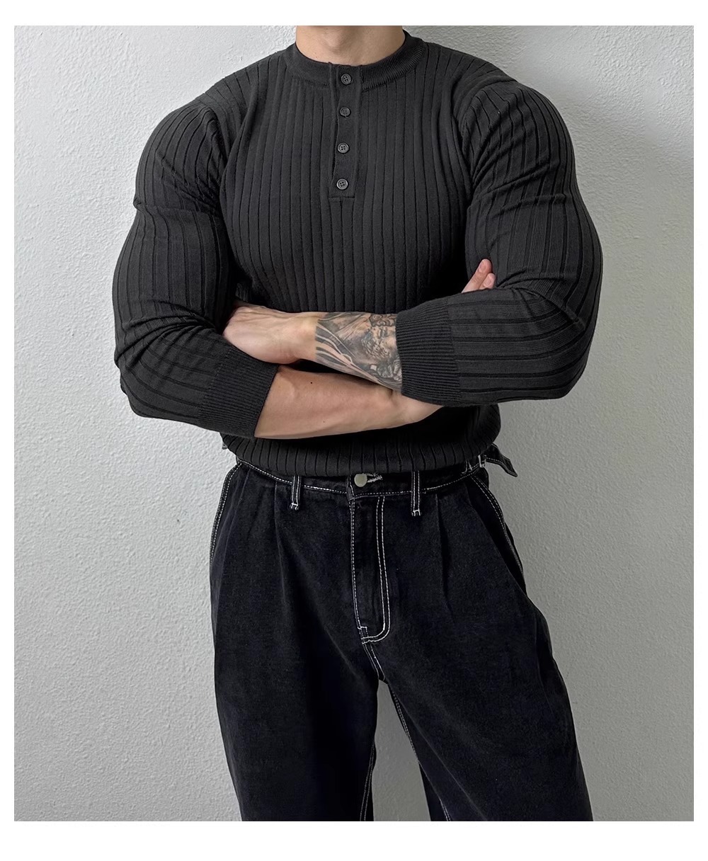 봄과 가을 새로운 스타일 헨리 칼라 긴팔 스웨터 남성 가볍고 성숙한 슬림 비즈니스 티셔츠 유행 대외 무역 국경 간 도매