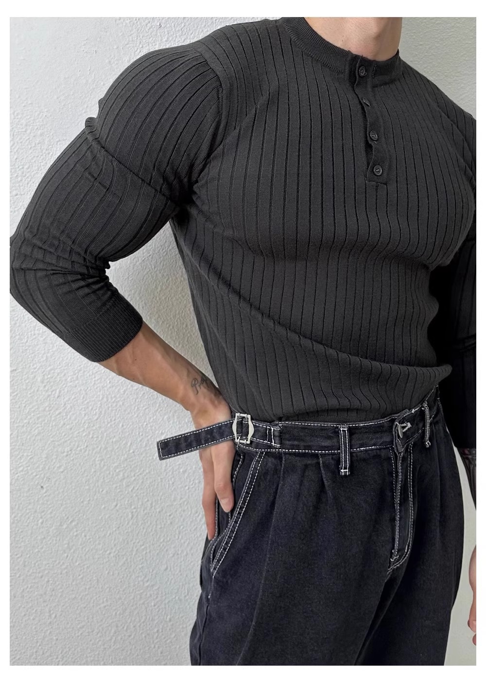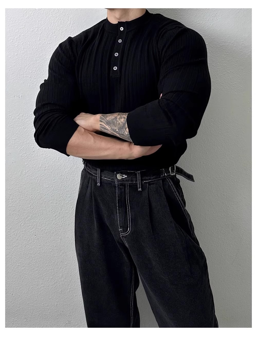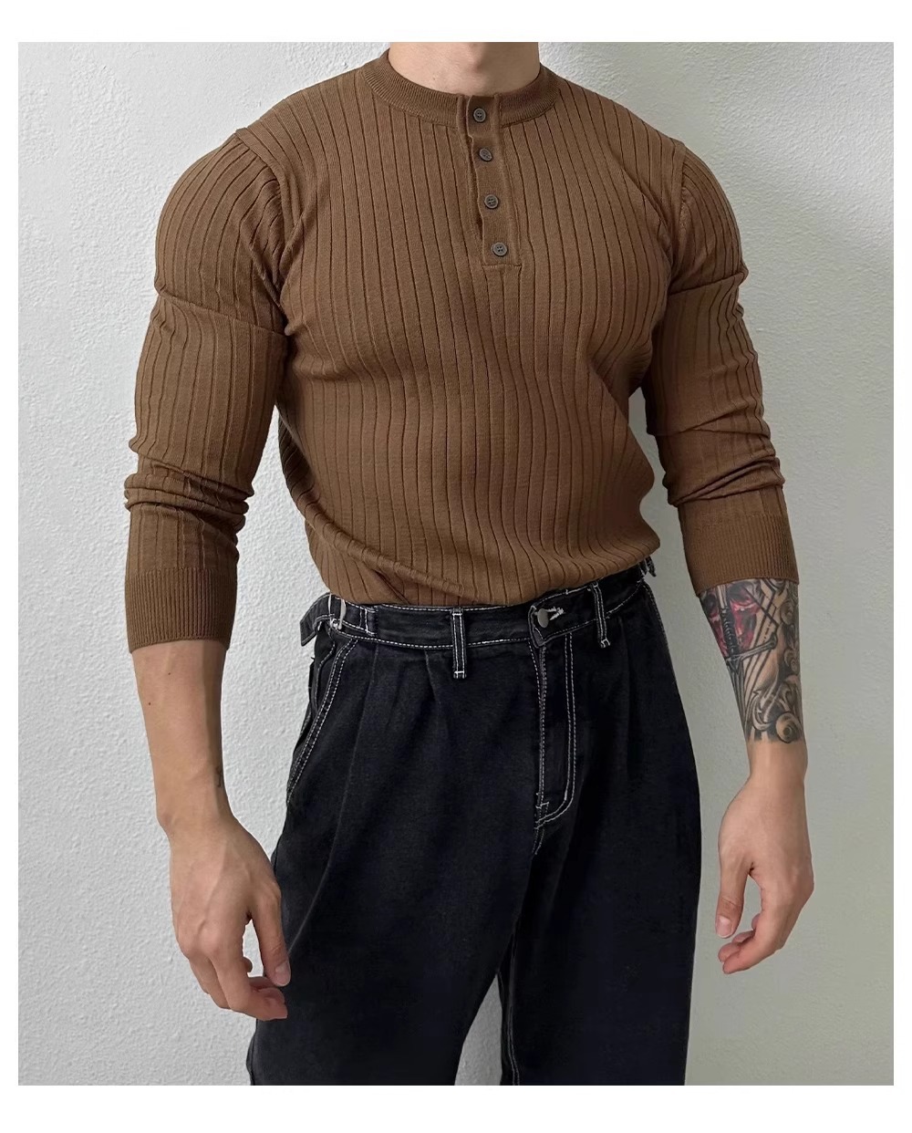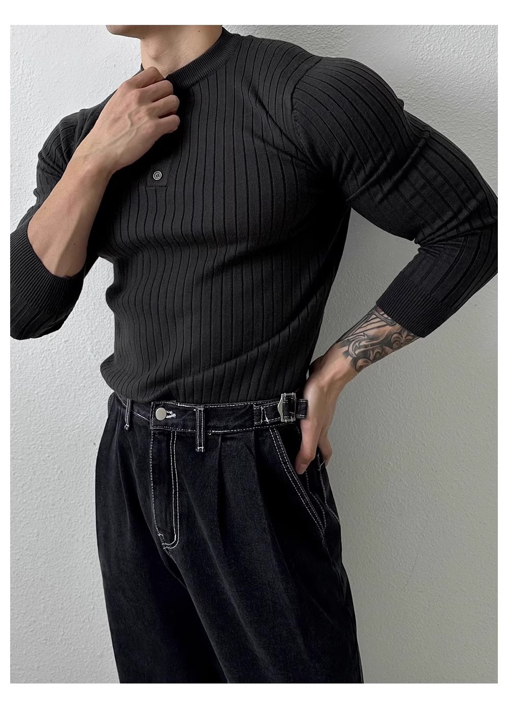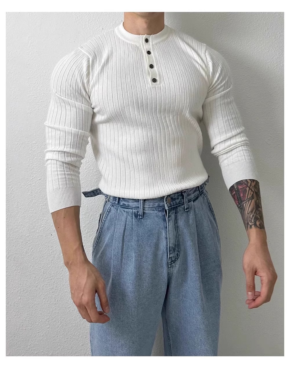 봄과 가을 새로운 스타일 헨리 칼라 긴팔 스웨터 남성 가볍고 성숙한 슬림 비즈니스 티셔츠 유행 대외 무역 국경 간 도매