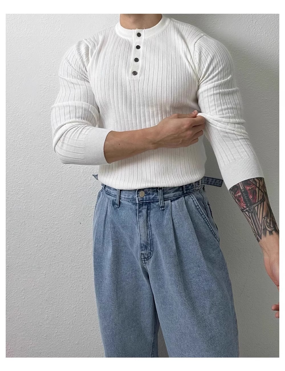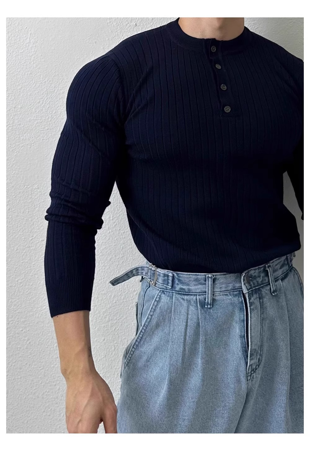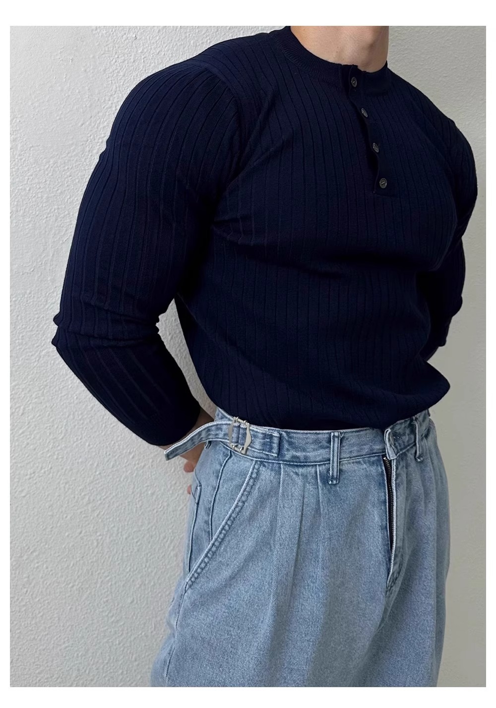 봄과 가을 새로운 스타일 헨리 칼라 긴팔 스웨터 남성 가볍고 성숙한 슬림 비즈니스 티셔츠 유행 대외 무역 국경 간 도매스토어 가기