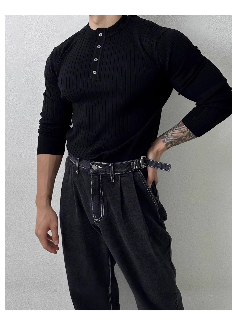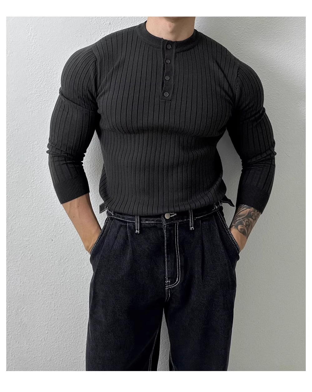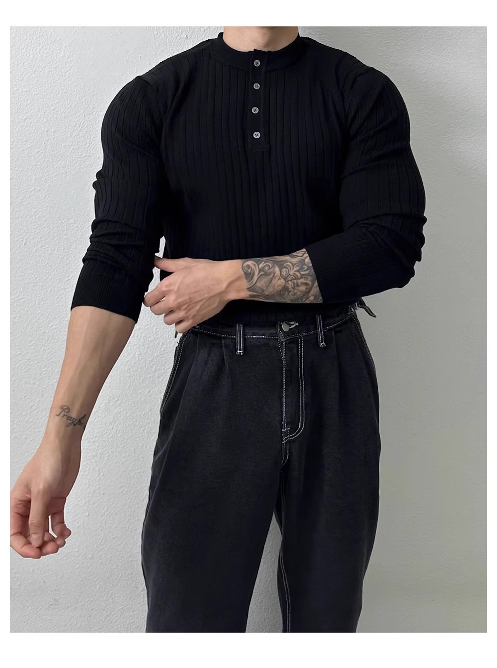 봄과 가을 새로운 스타일 헨리 칼라 긴팔 스웨터 남성 가볍고 성숙한 슬림 비즈니스 티셔츠 유행 대외 무역 국경 간 도매스토어 가기