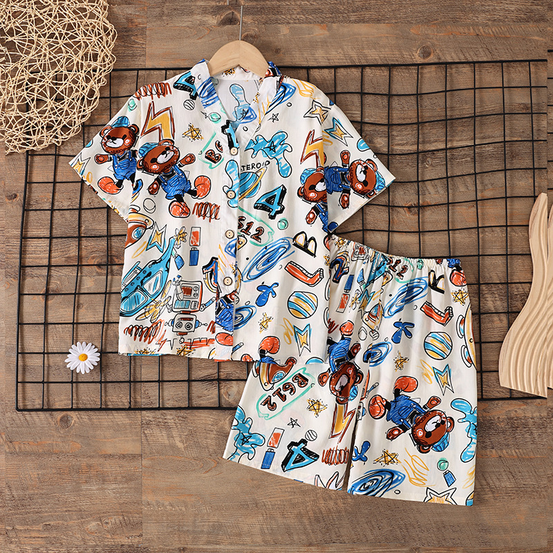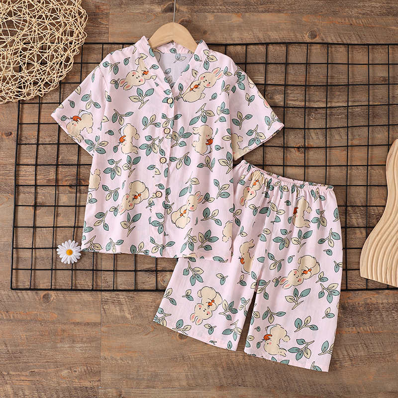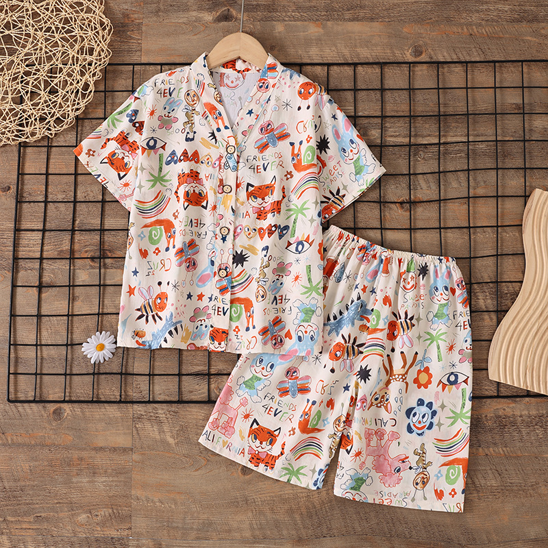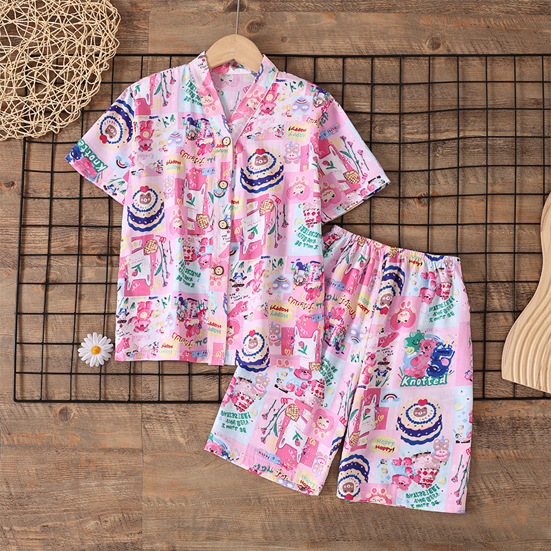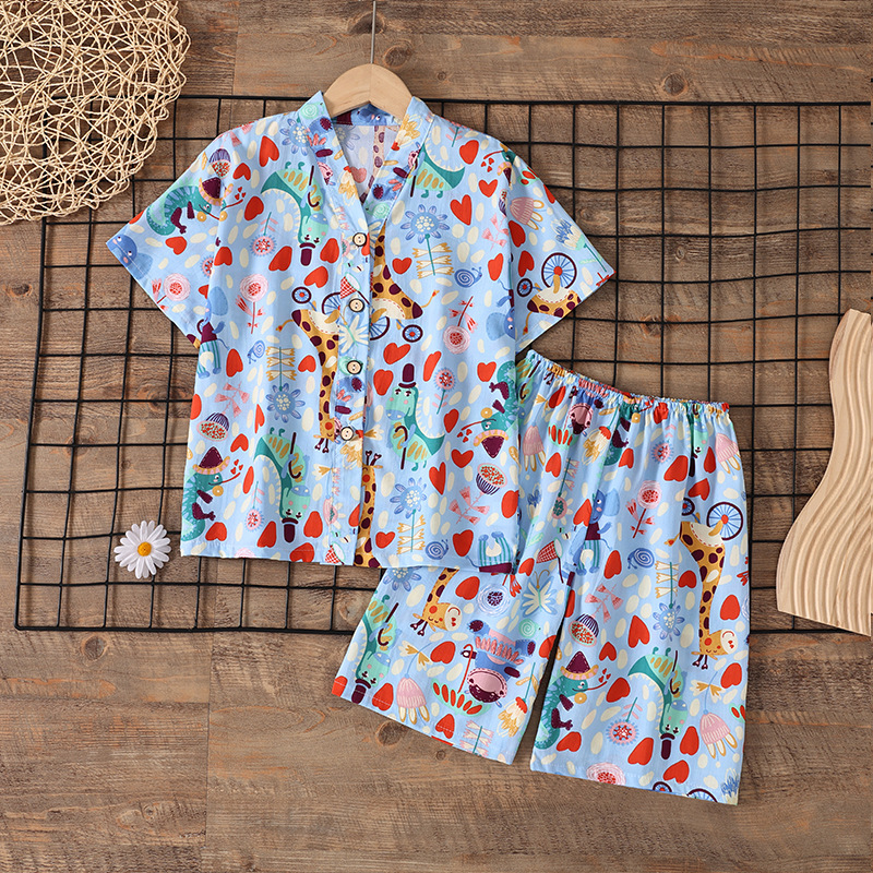 여름 소년 얇은 잠옷 어린이 소녀 청소년 면화 실크 가정 의류 소녀 아기 반팔 면화 실크 양복