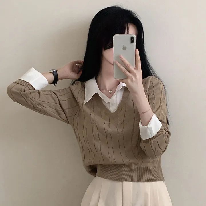 한국 스타일 ins 셔츠 칼라 스플 라이스 가짜 투피스 스웨터 2025 가을 새로운 허리 짧은 풀오버 여성상의스토어 가기
