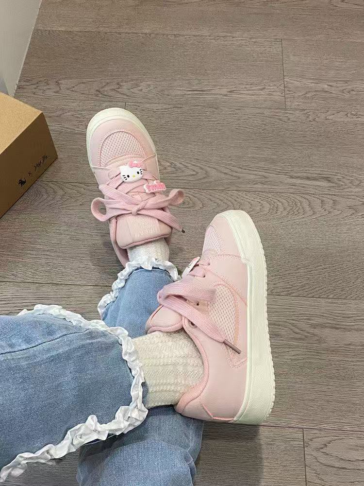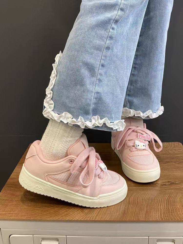 여성용 오루오펑 스니커즈 핑크 헬로키티 여성화 페어리 스타일 화이트 슈즈 두꺼운 밑창으로 높이 증가 2025 핫 스타일
