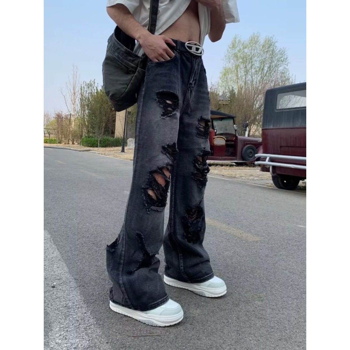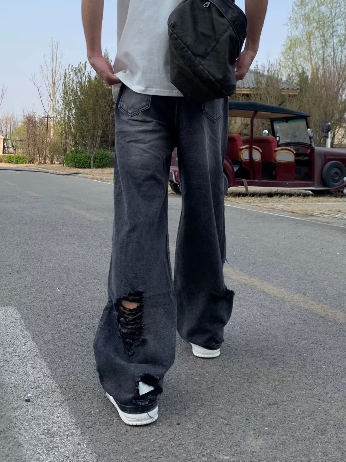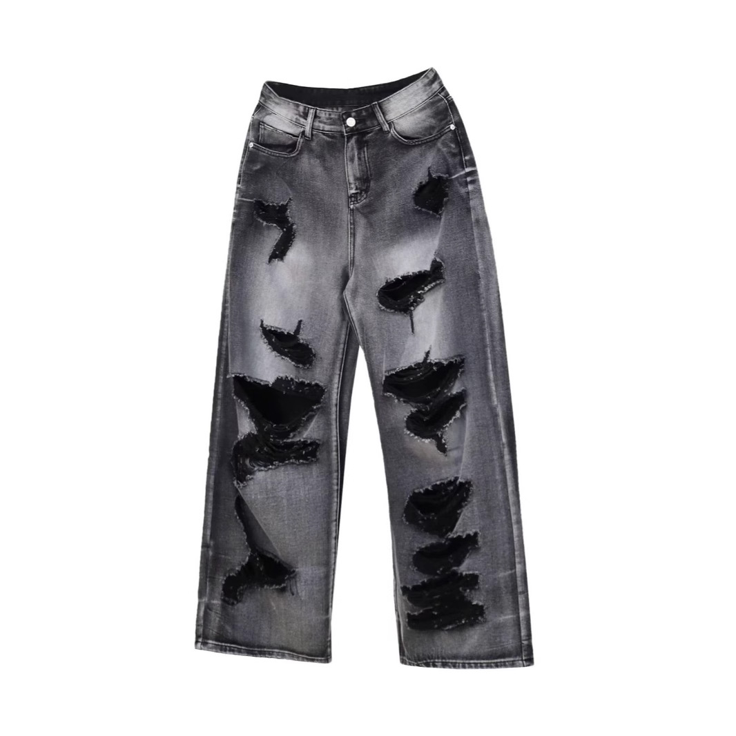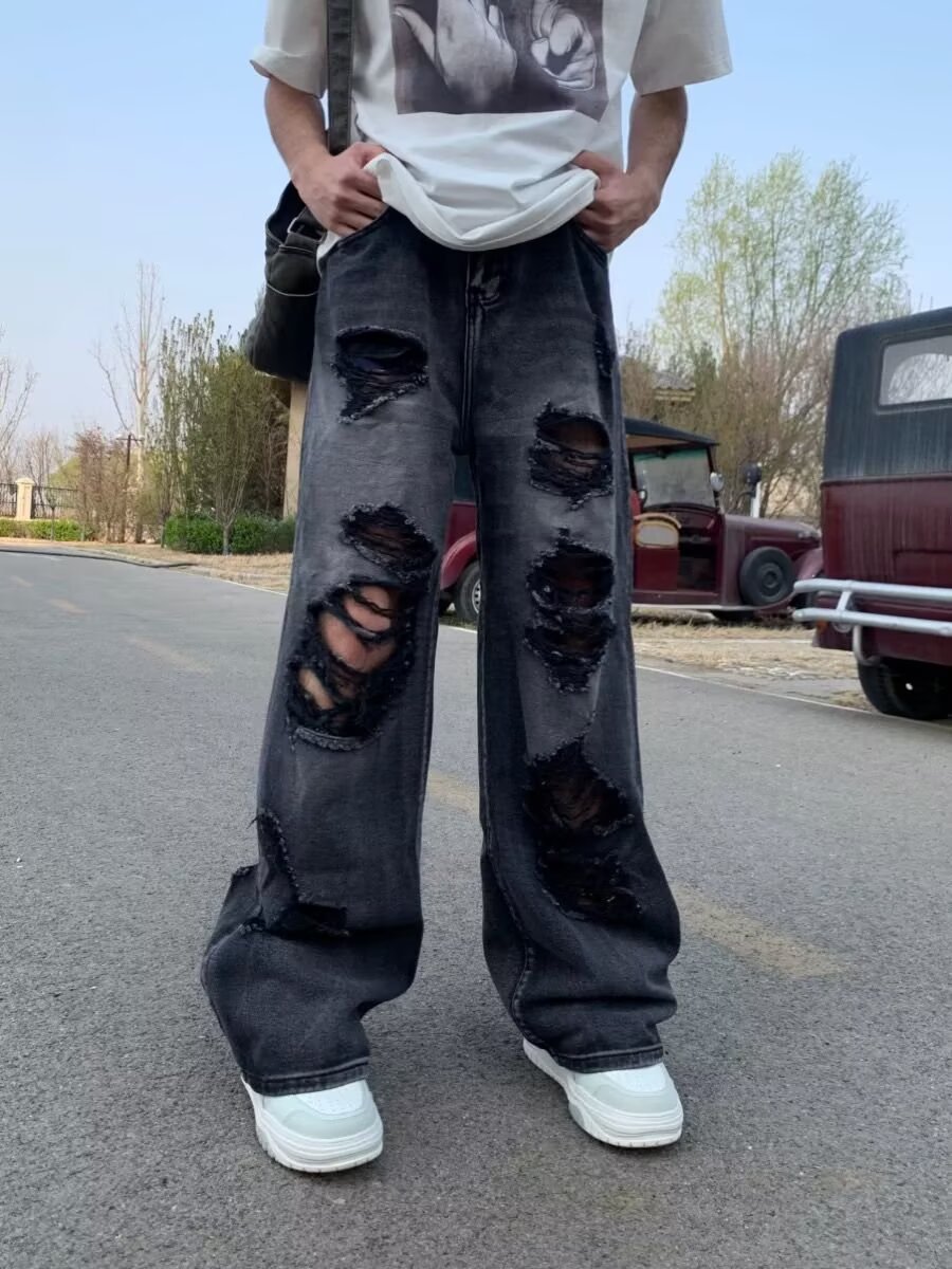아메리칸 스트리트 찢어진 청바지 남성 바이브 하이 스트리트 루즈 베이비 팬츠 힙합 트렌디 브랜드 핸섬 스트레이트 팬츠스토어 가기
