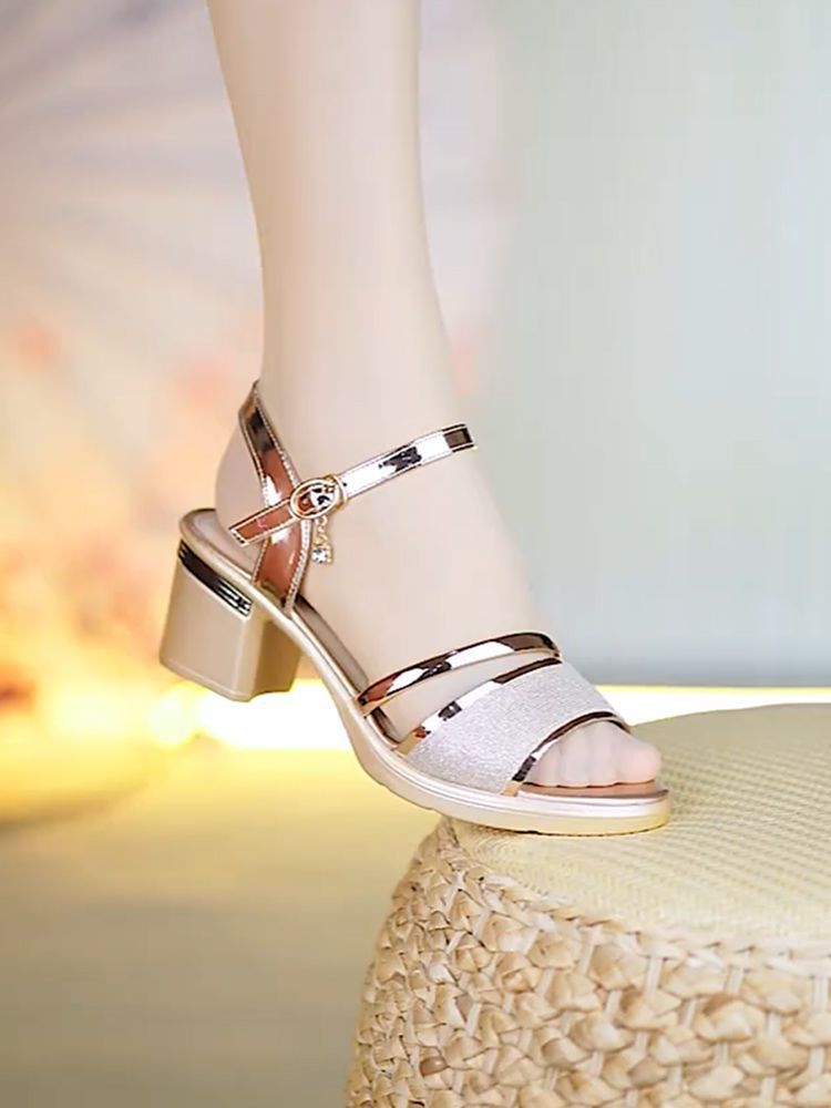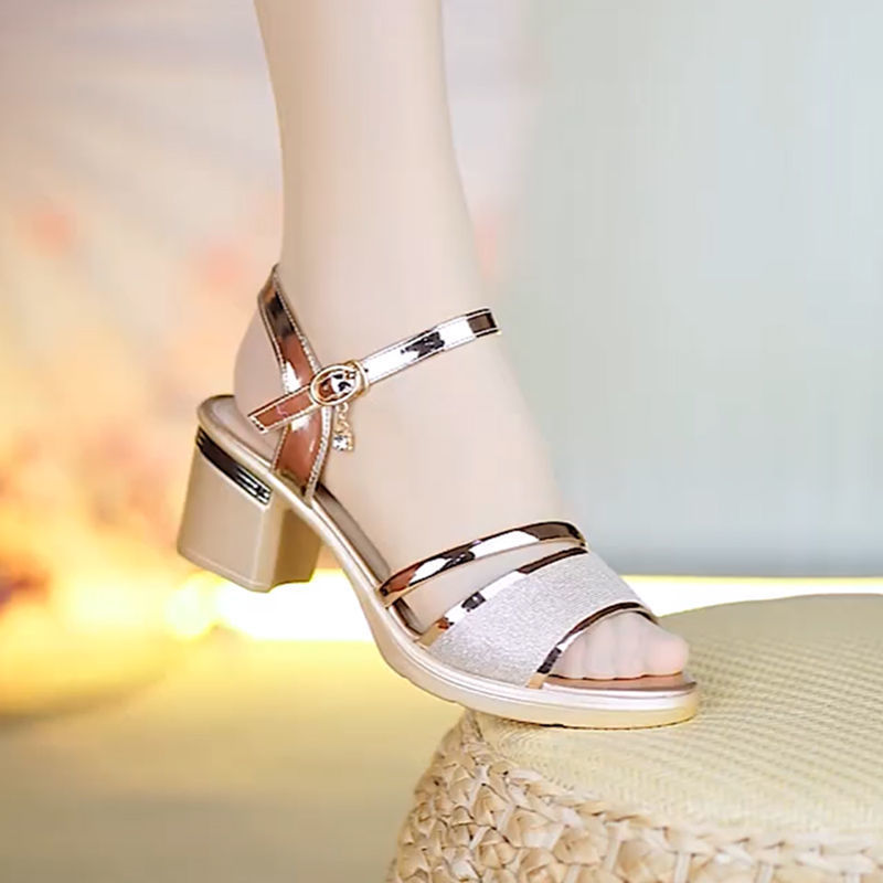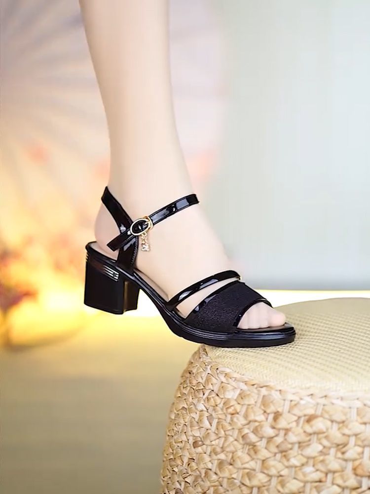 부드러운 가죽 여성용 하이힐, 오픈 토, 미끄럼 방지, 2025년 여름 신작 패셔너블하고 다재다능한 미드 힐 버클 샌들스토어 가기