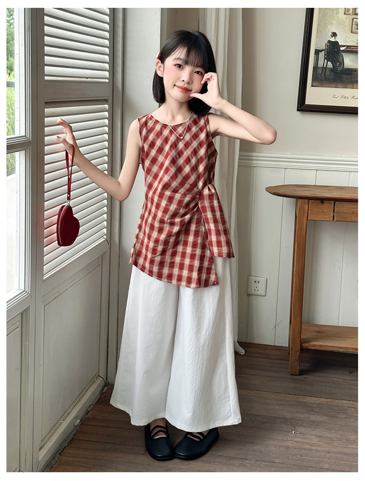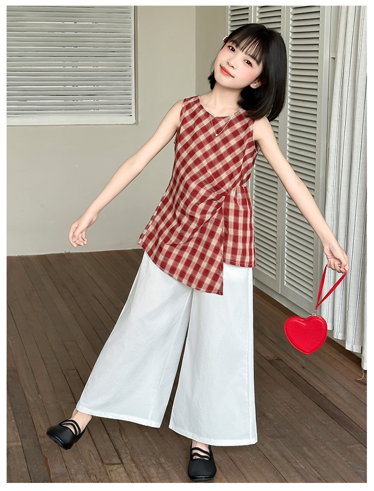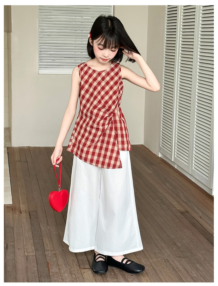 여아 패션 여름 정장 2025 새로운 큰 어린이 불규칙한 격자 무늬 조끼 탑 와이드 레그 팬츠 스커트 투피스 세트