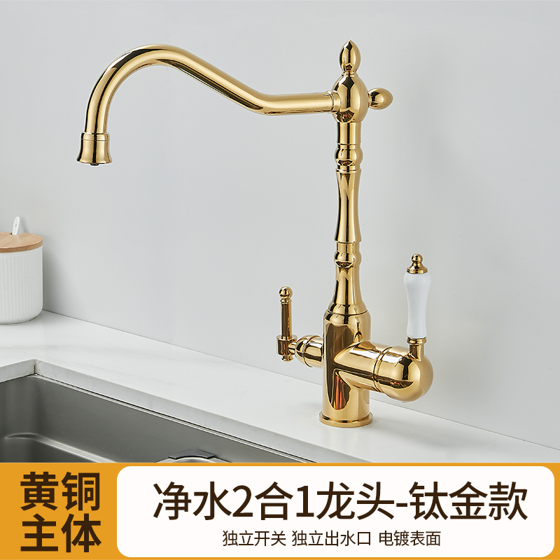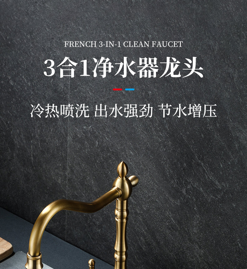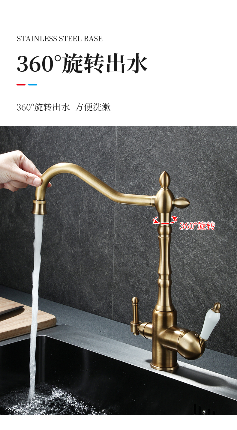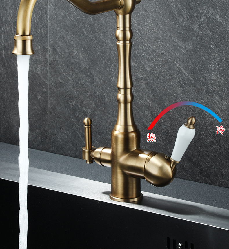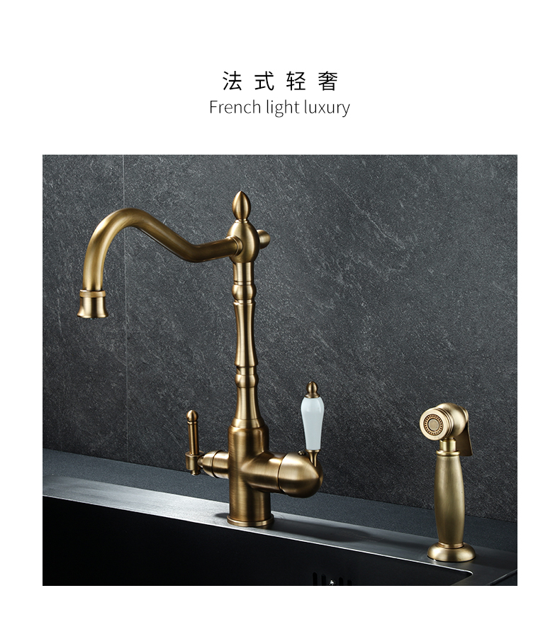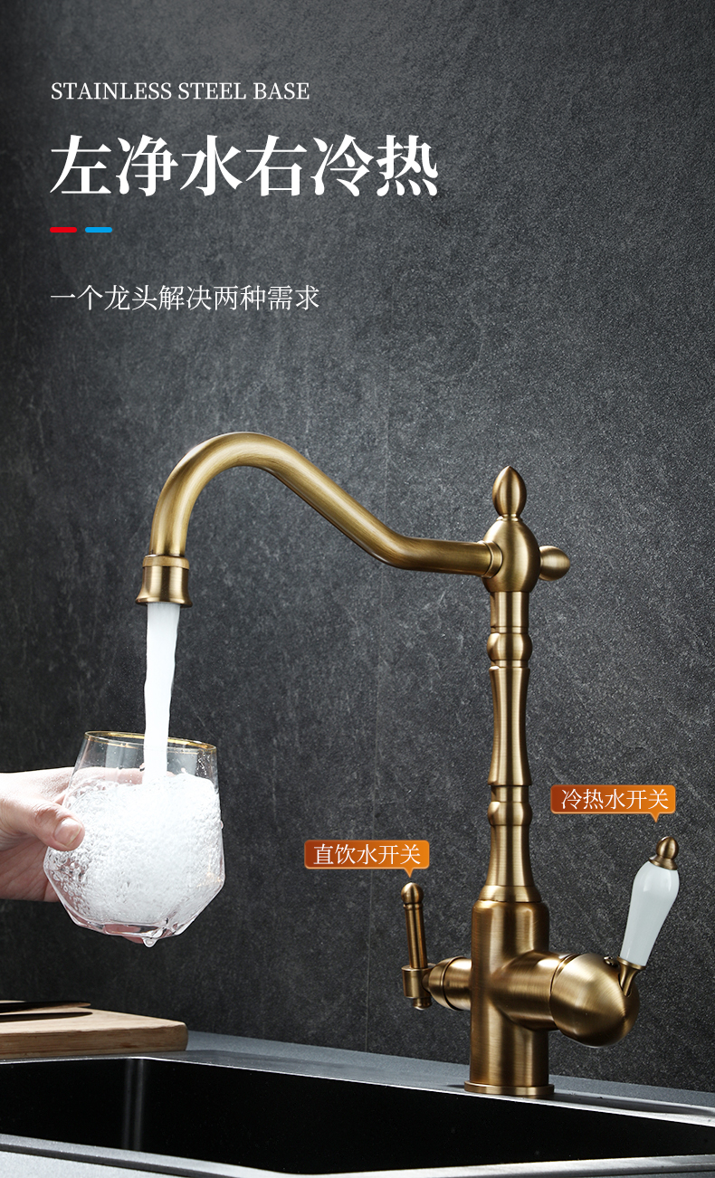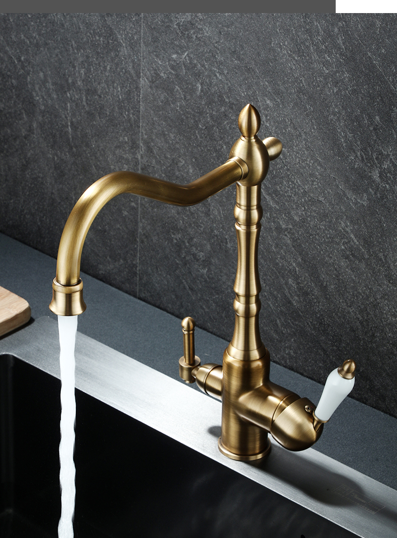 프랑스 복고풍 주방 수도꼭지, 냉온수, 전체 구리 정수기, 직접 마시는 3-in-1 식기 세척대, 회전식 스플래시 방지