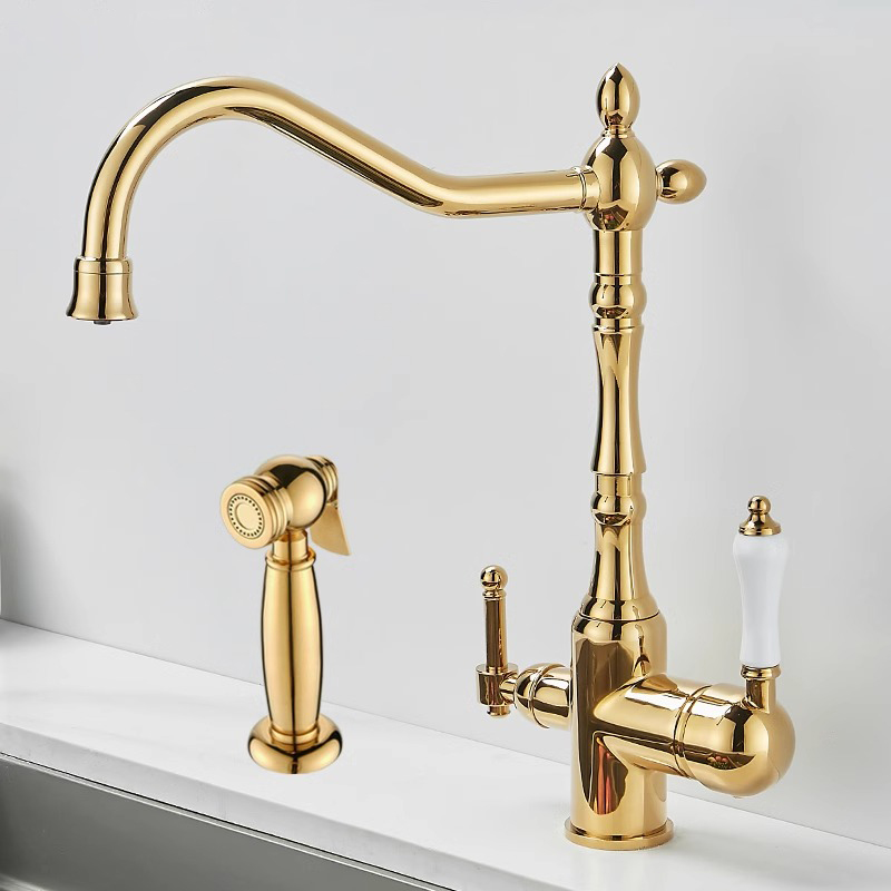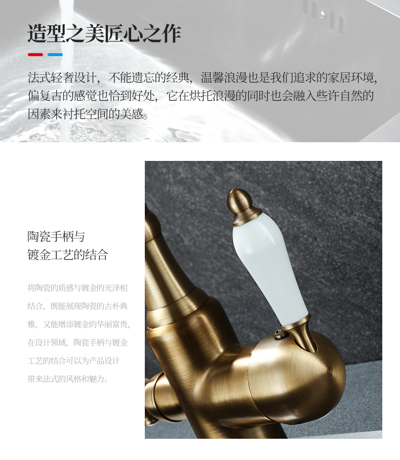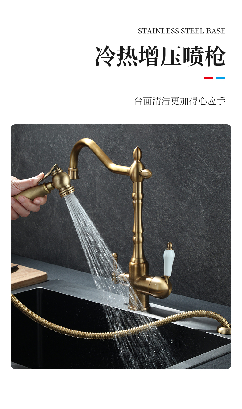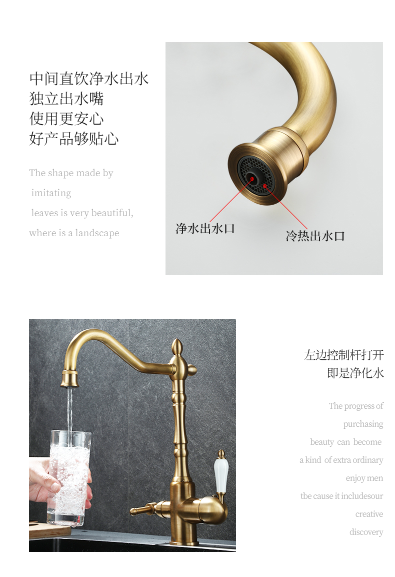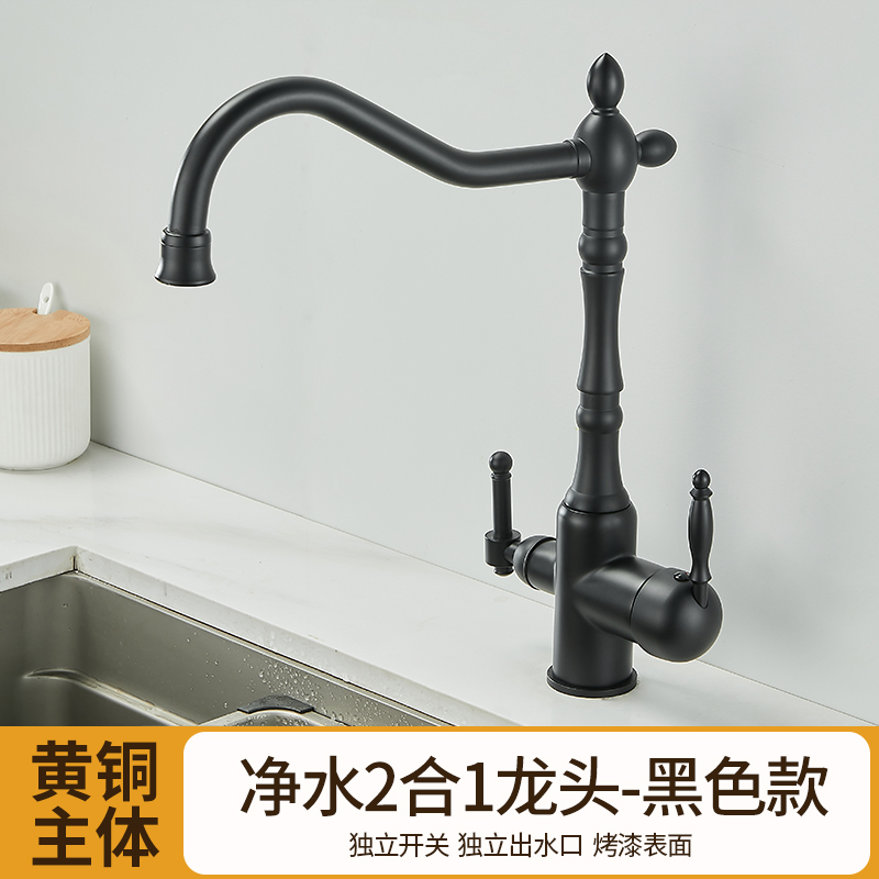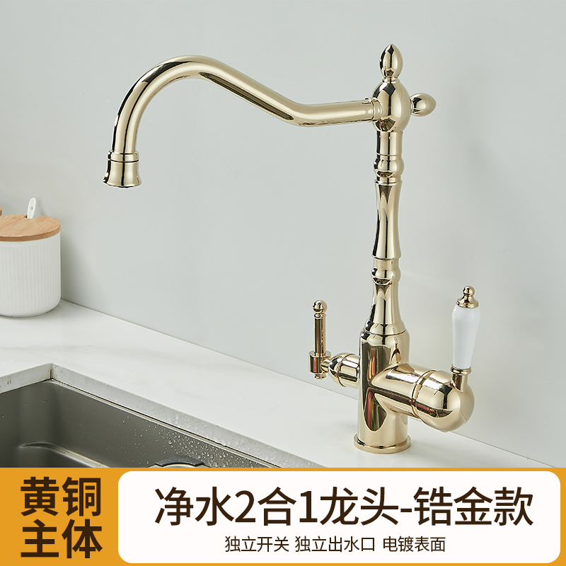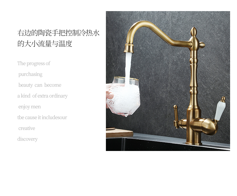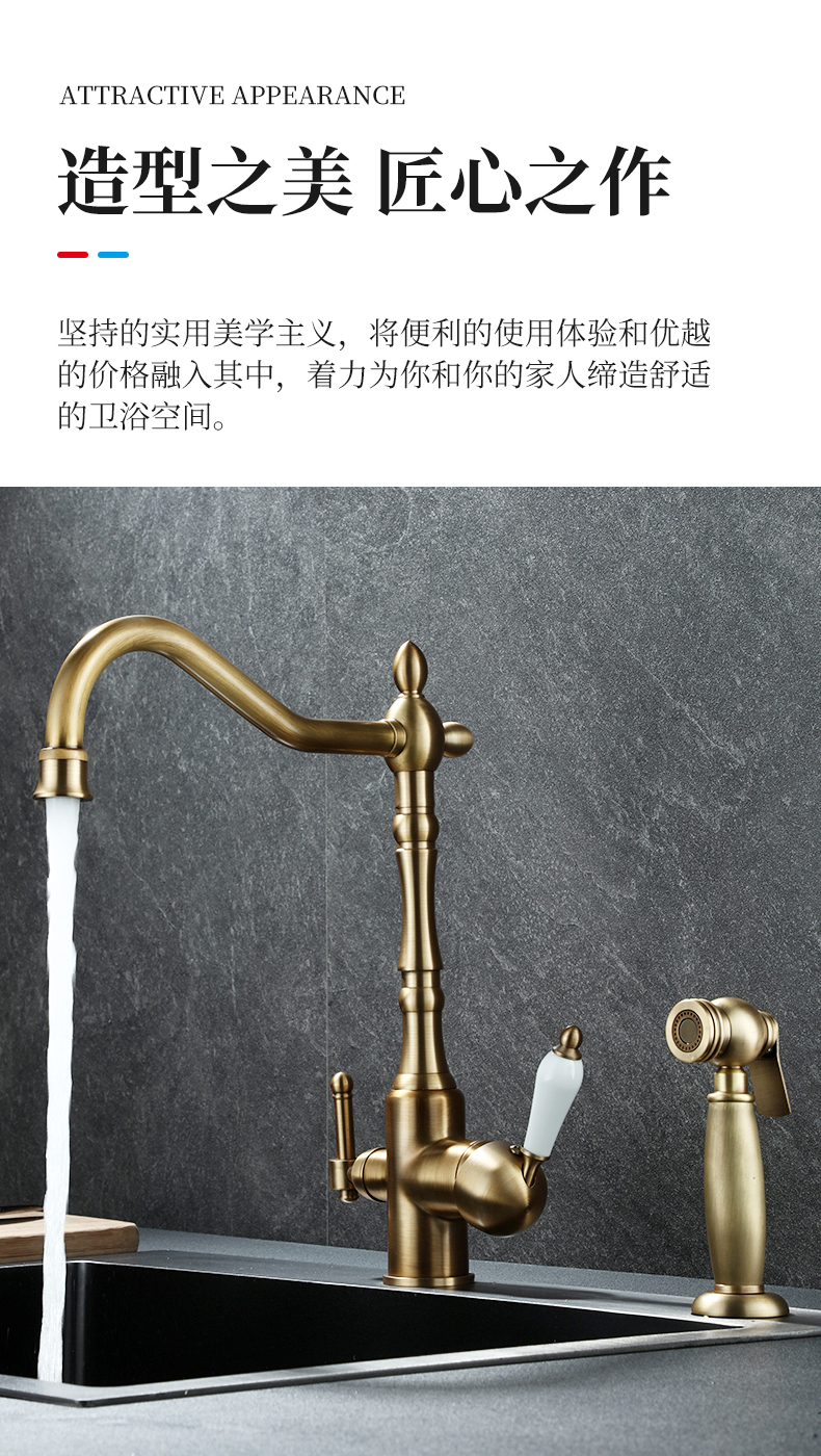 프랑스 복고풍 주방 수도꼭지, 냉온수, 전체 구리 정수기, 직접 마시는 3-in-1 식기 세척대, 회전식 스플래시 방지