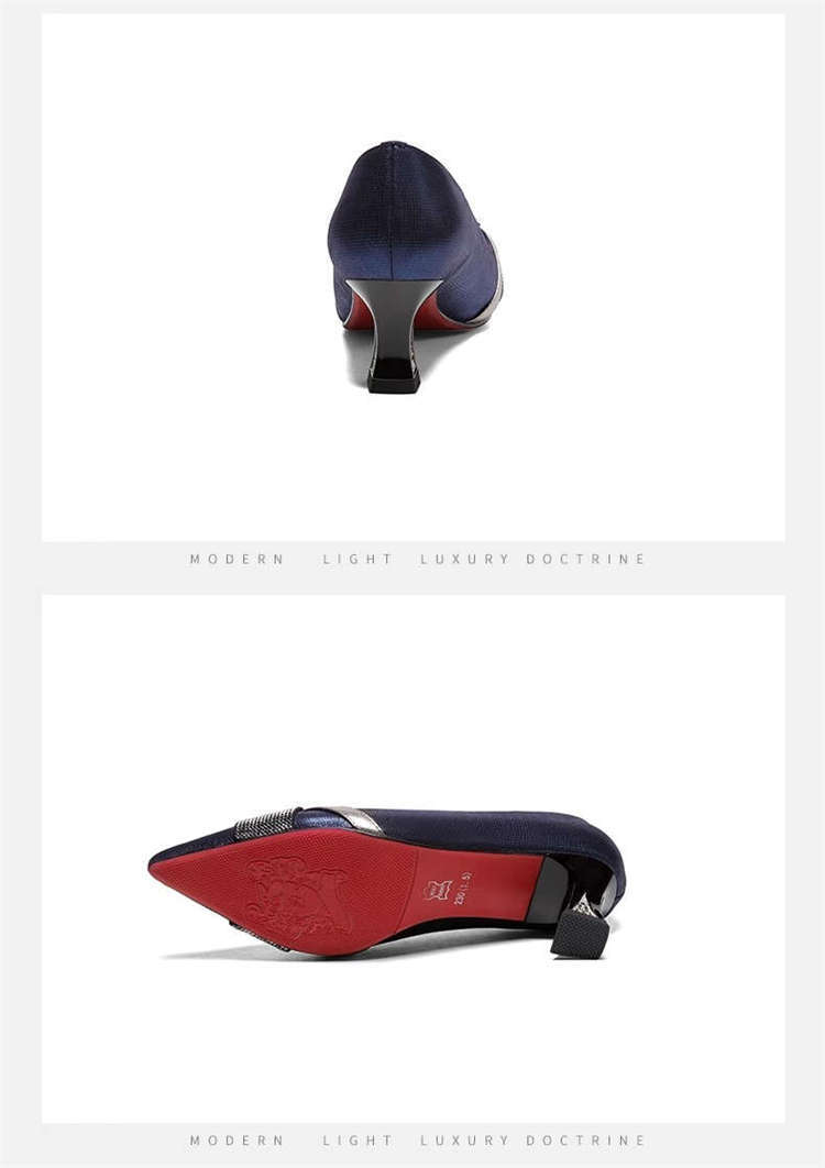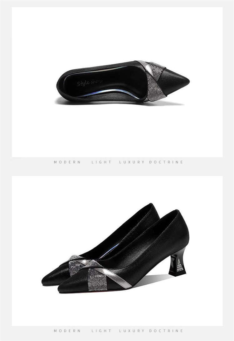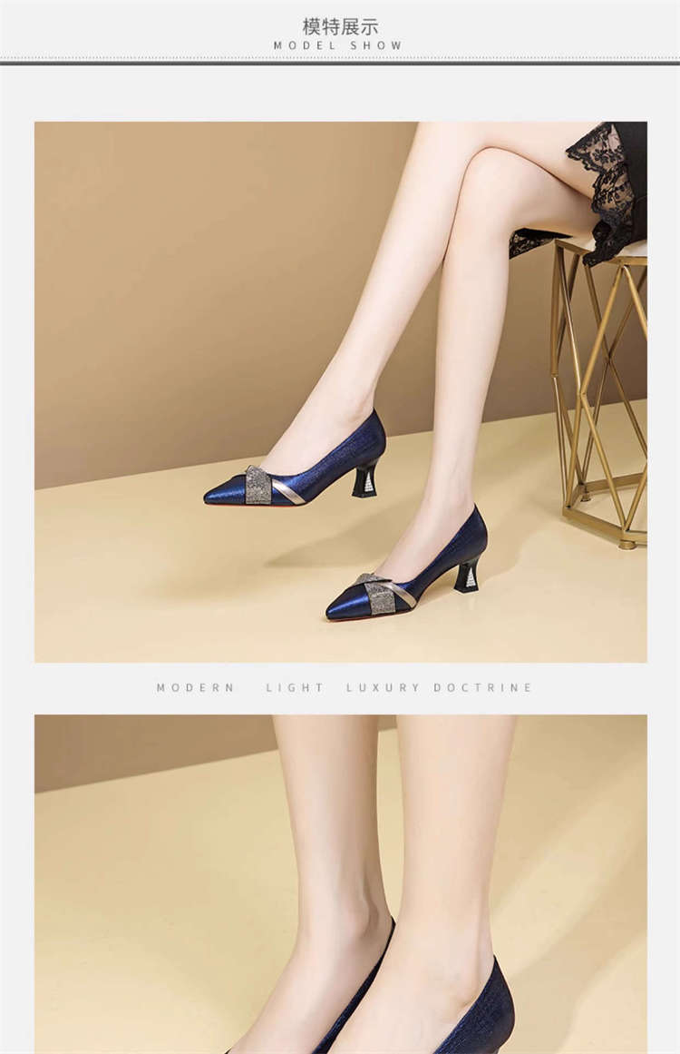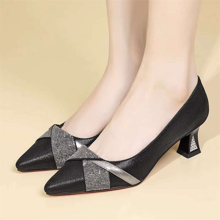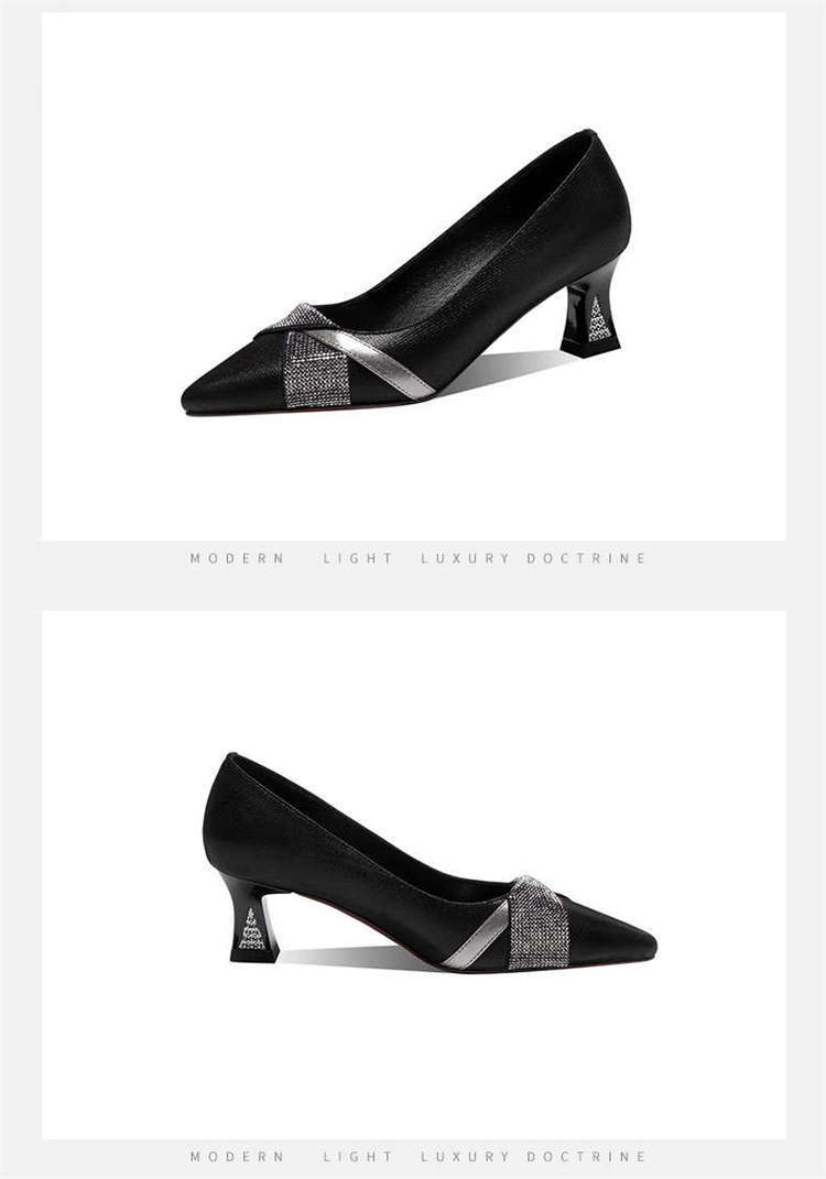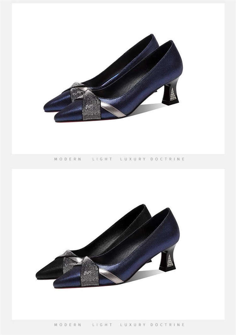 다재다능하고 우아한 미드 힐 플로팅 슈즈, 두꺼운 굽 여성화, 여성용 작업화, 2025 봄 가을 신상 뾰족한 부드러운 가죽 라인스톤 슈즈