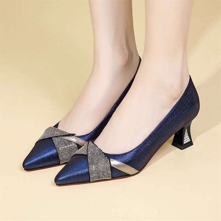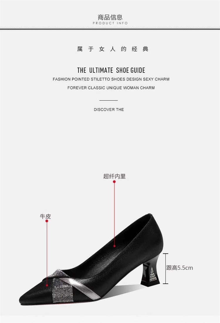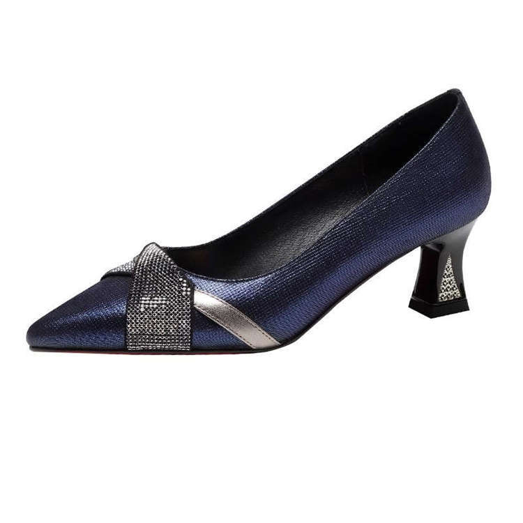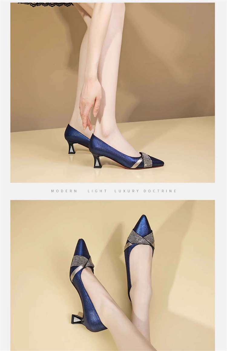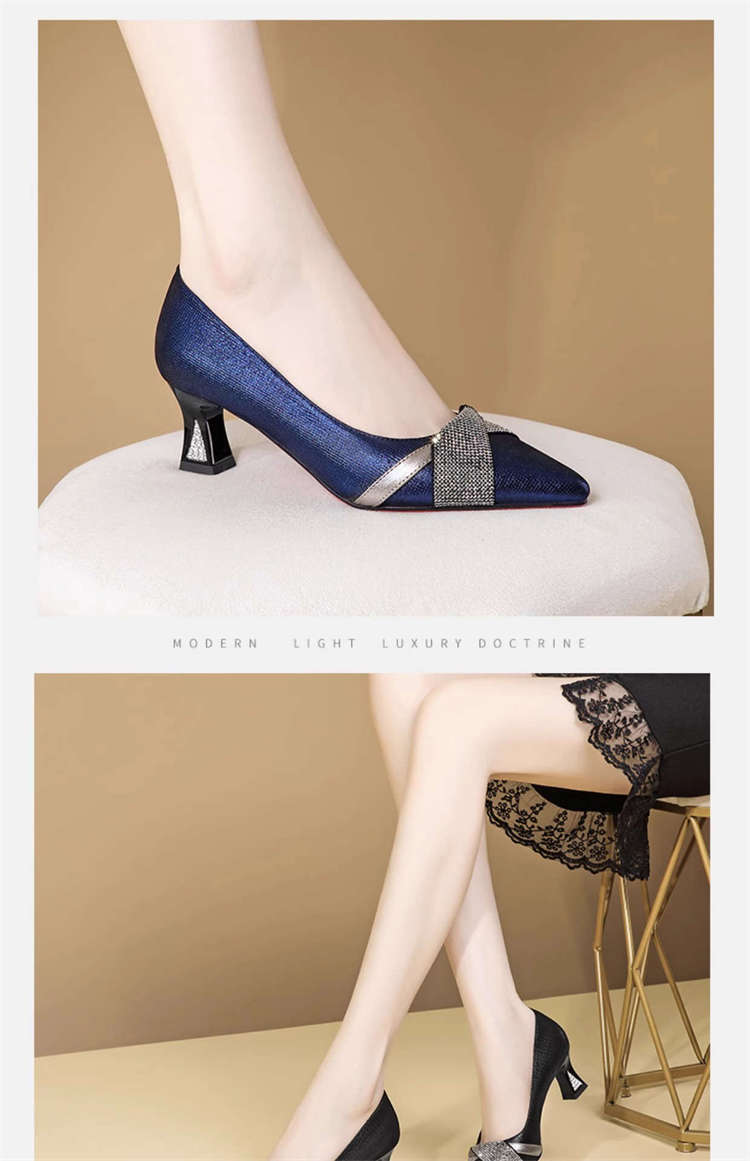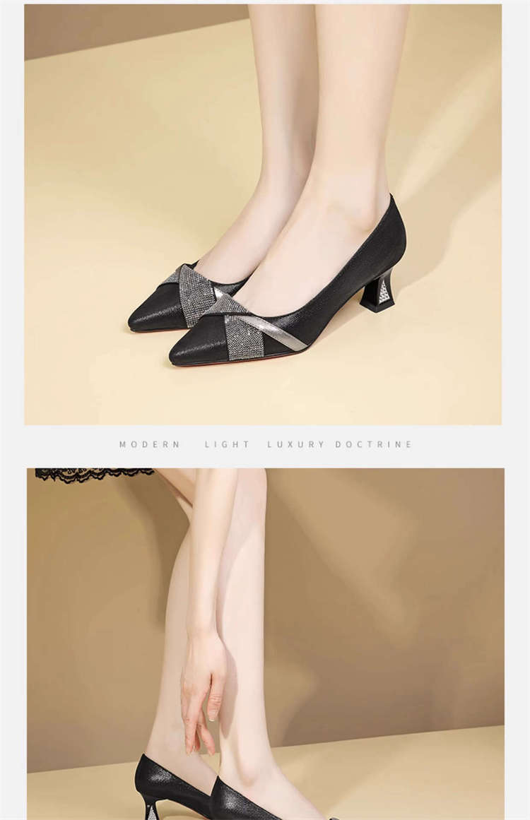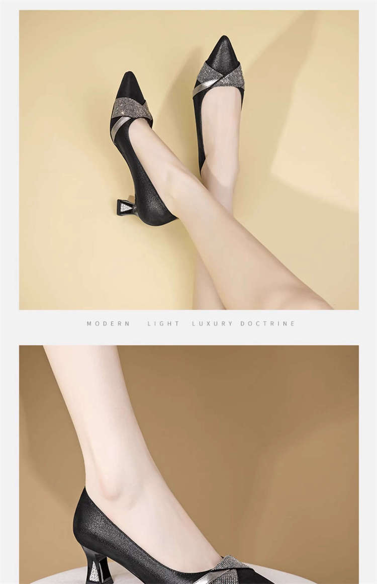 다재다능하고 우아한 미드 힐 플로팅 슈즈, 두꺼운 굽 여성화, 여성용 작업화, 2025 봄 가을 신상 뾰족한 부드러운 가죽 라인스톤 슈즈스토어 가기
