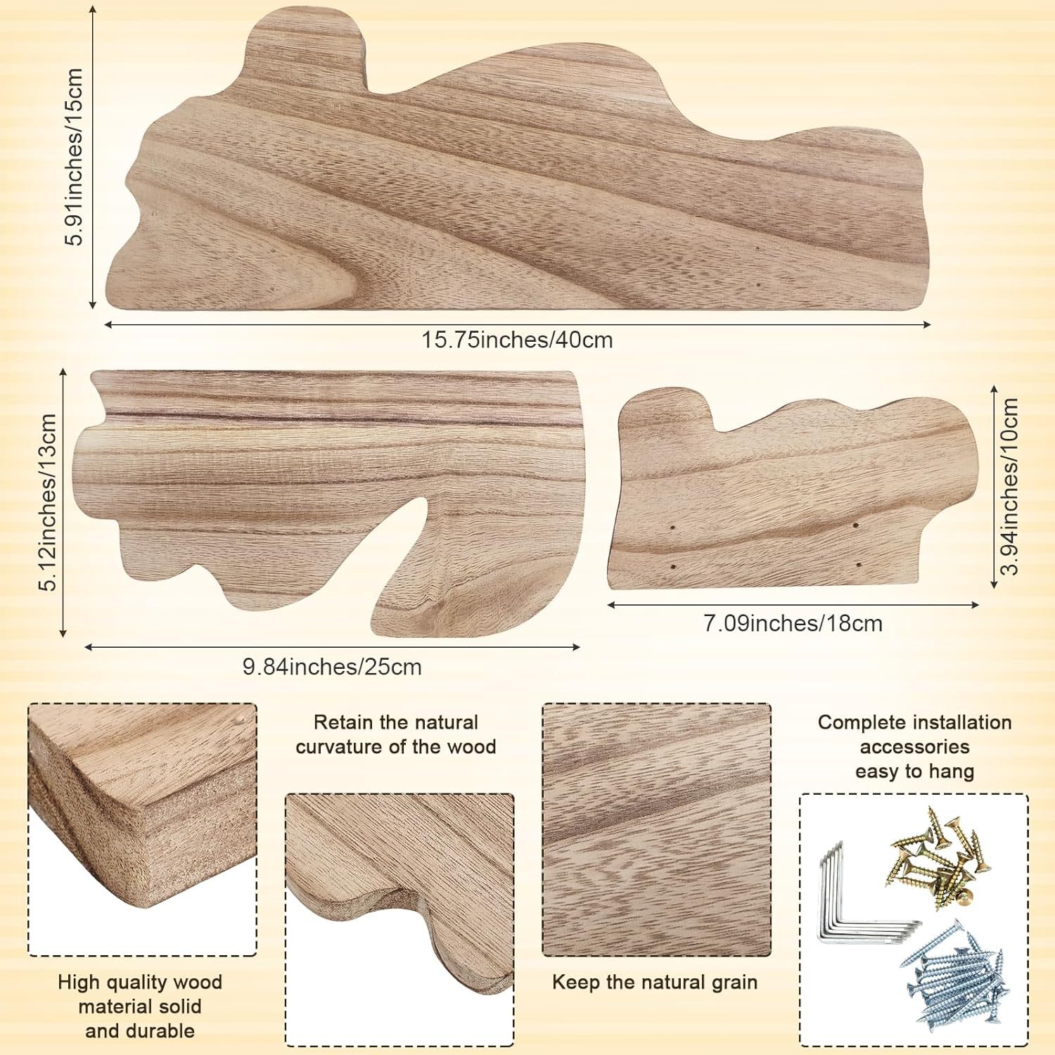 나무 물결 모양의 가장자리 플로팅 선반 금속 브래킷이있는 나무 선반 벽걸이 형 디스플레이 선반 농가 빈티지 벽 선반