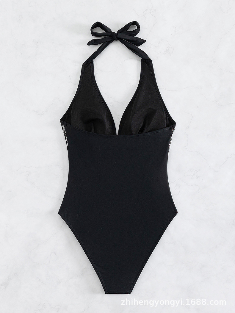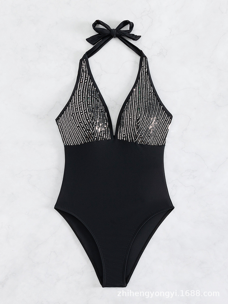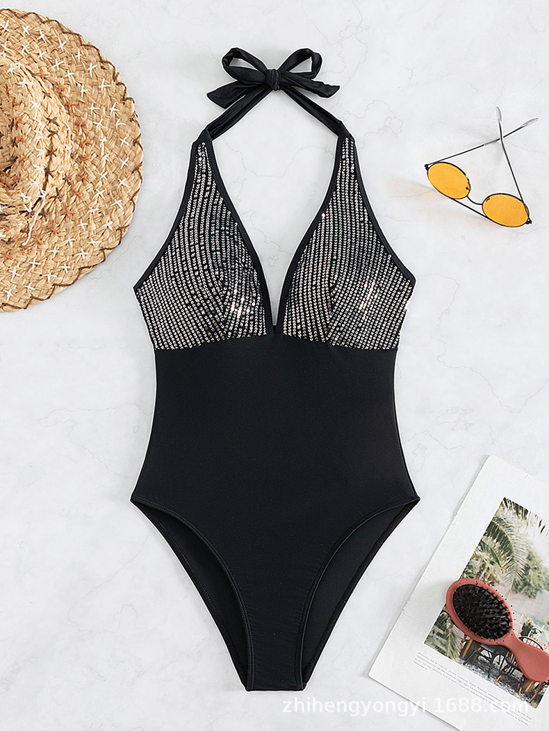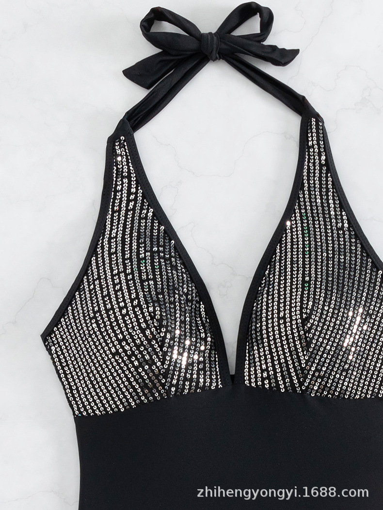 여성을 위한 새로운 원피스 수영복, 유럽과 미국의 원피스 홀터넥 스팽글 섹시한 백리스 대외 무역 비키니 수영복 재고 있음스토어 가기
