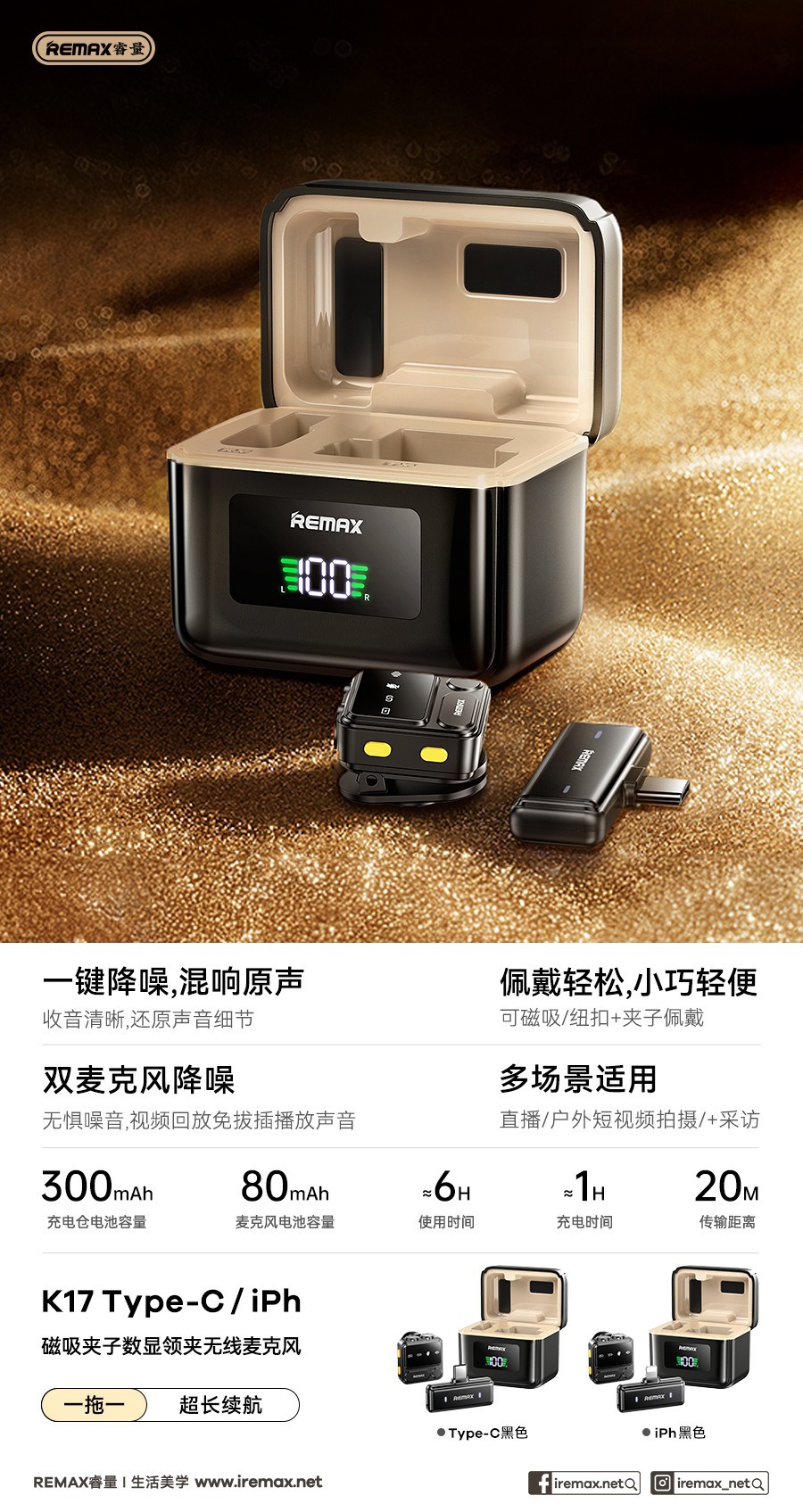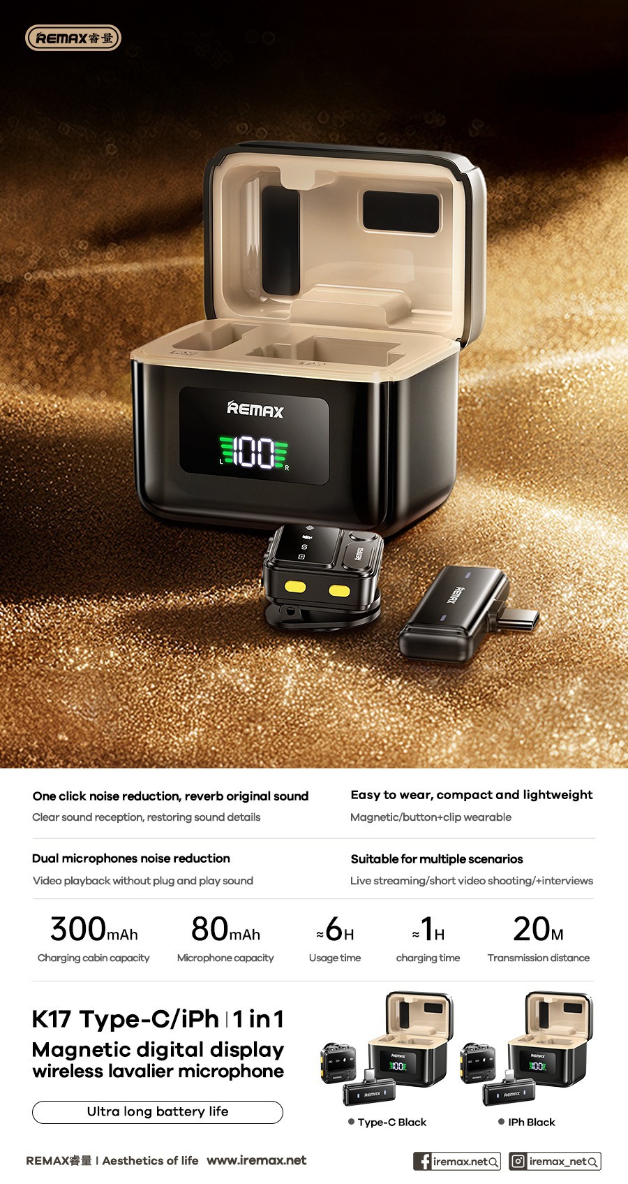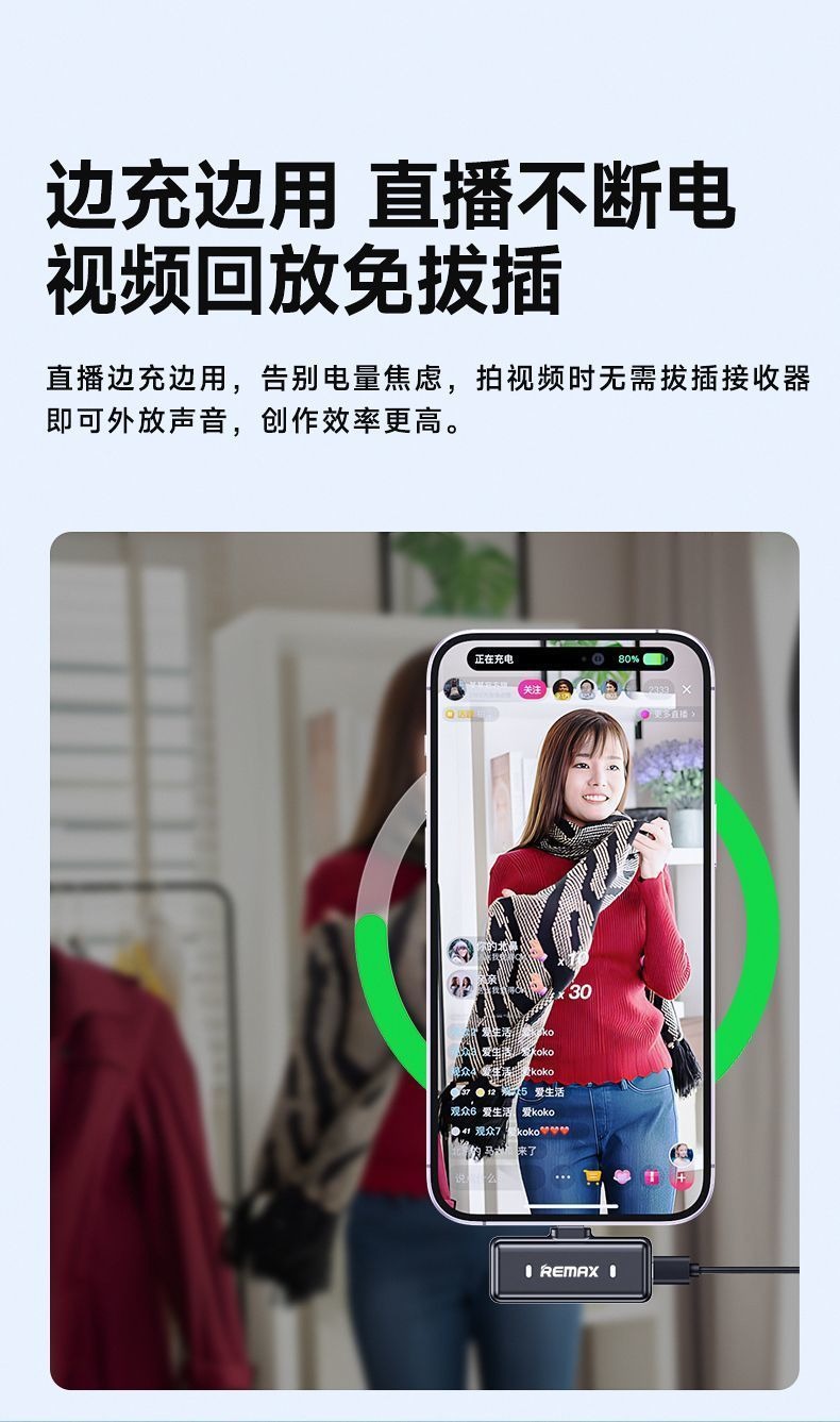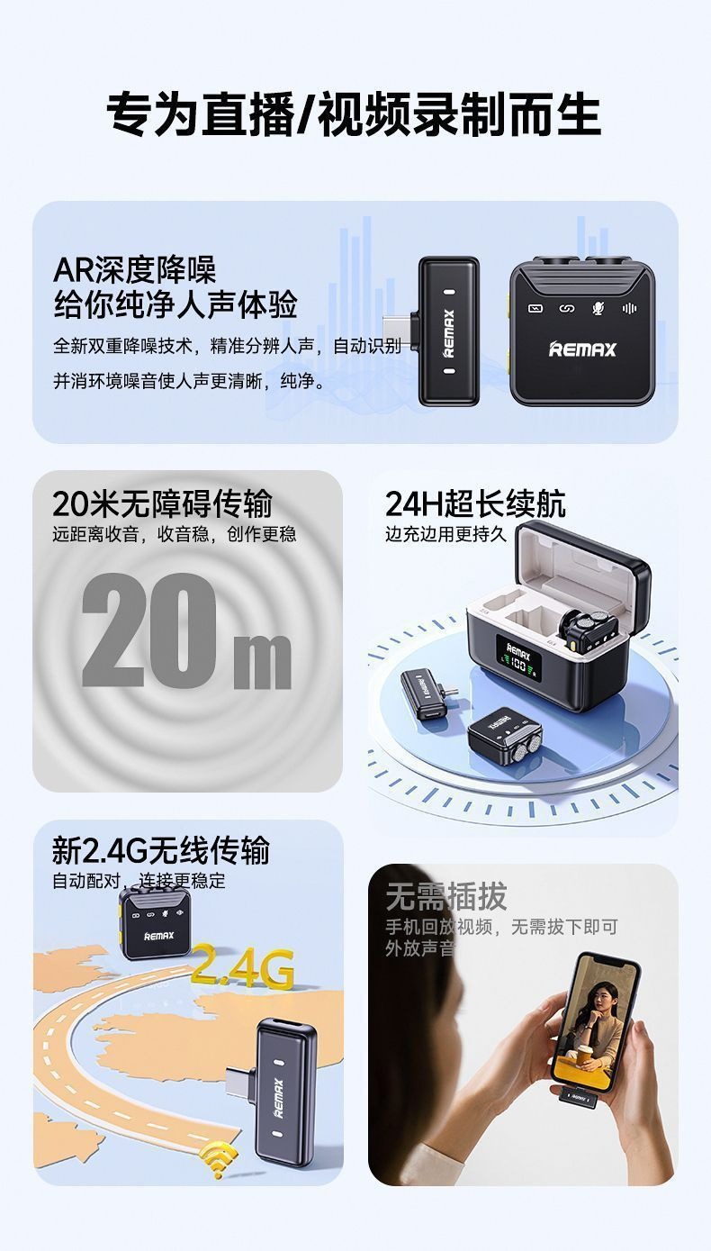 Remax 자기 칼라 클립 이중 소음 감소 무선 마이크 라이브 방송 긴 배터리 수명 전원 디스플레이 마이크스토어 가기