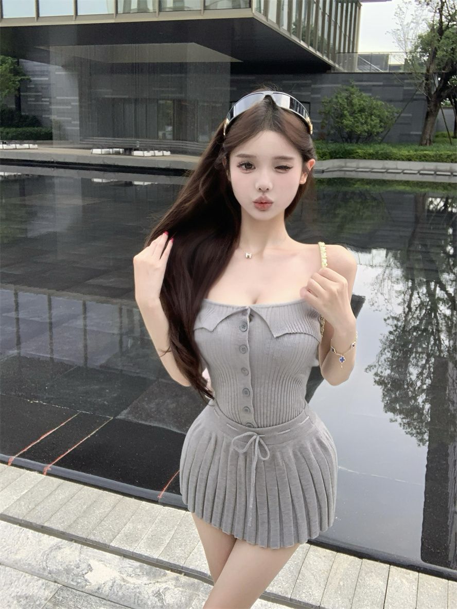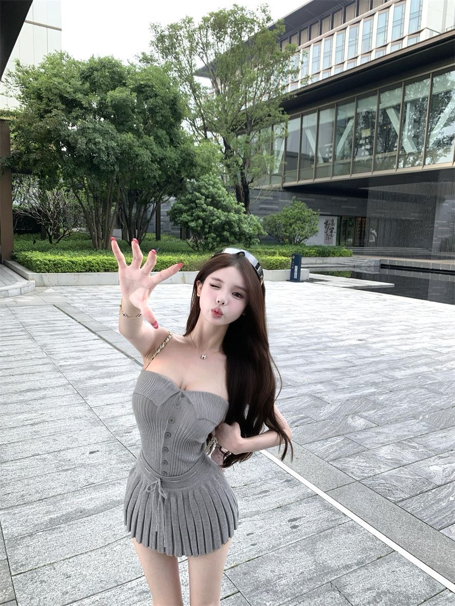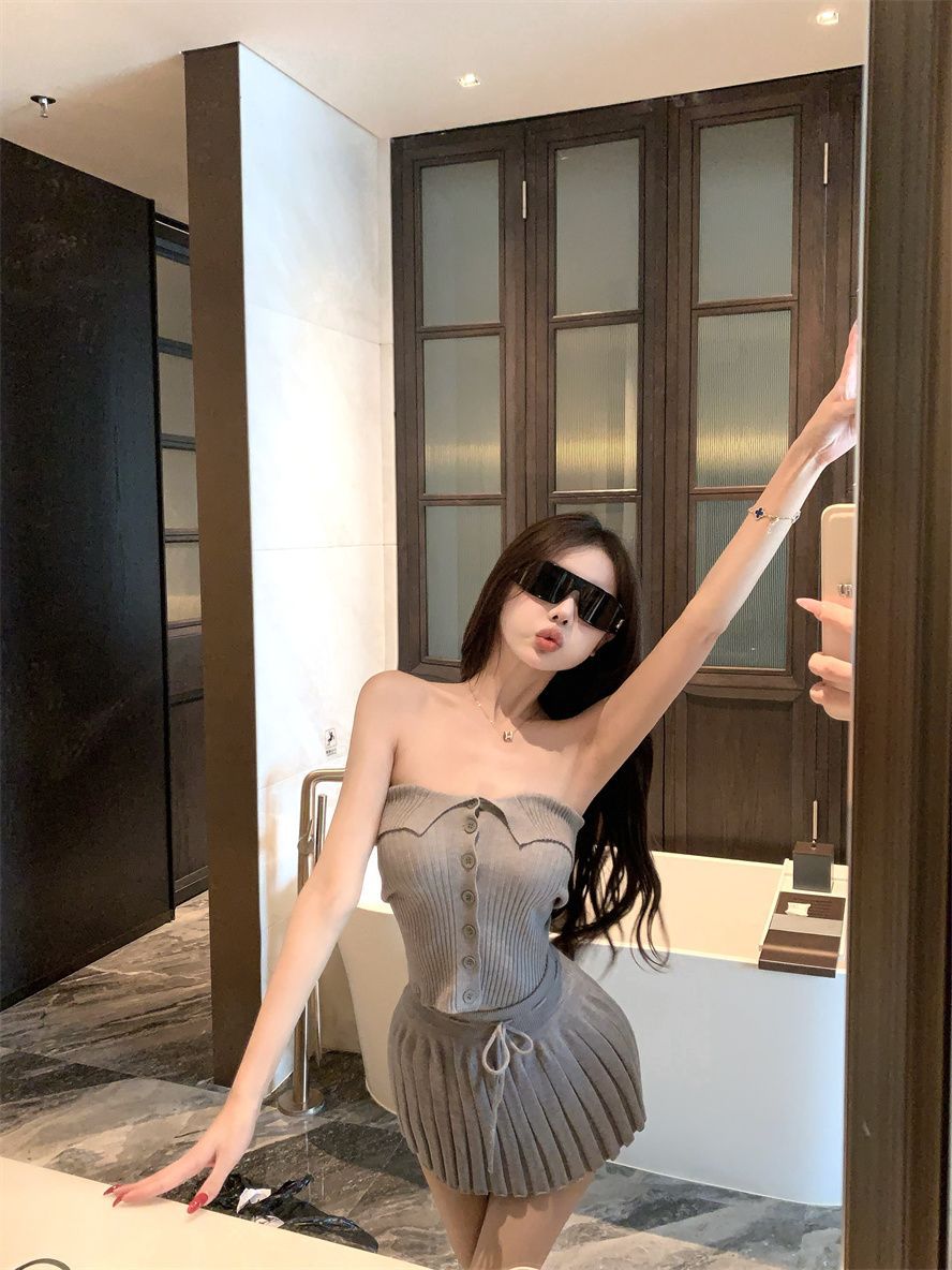 순수한 욕망 스타일 회색 아름다운 뒤 니트 튜브 탑 여성 여름 캐주얼 정장 주름 스커트 짧은 치마 투피스 세트스토어 가기