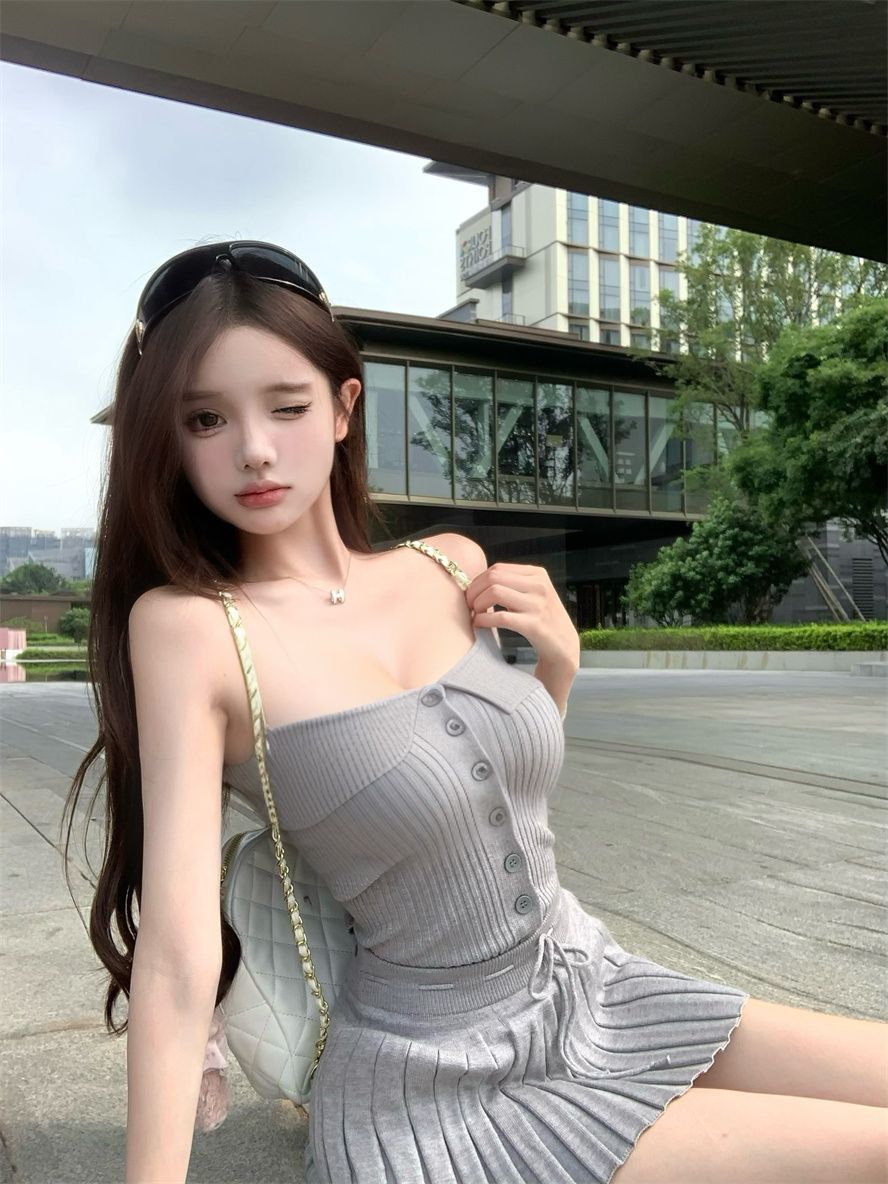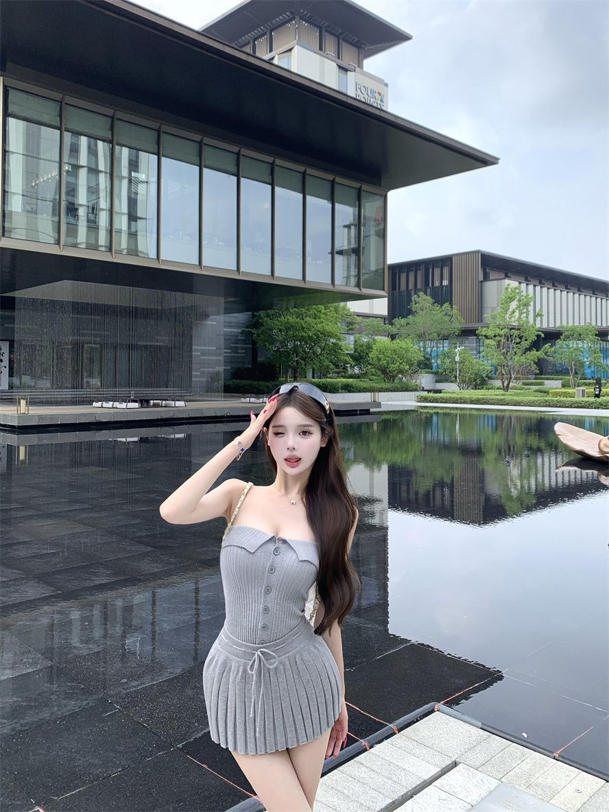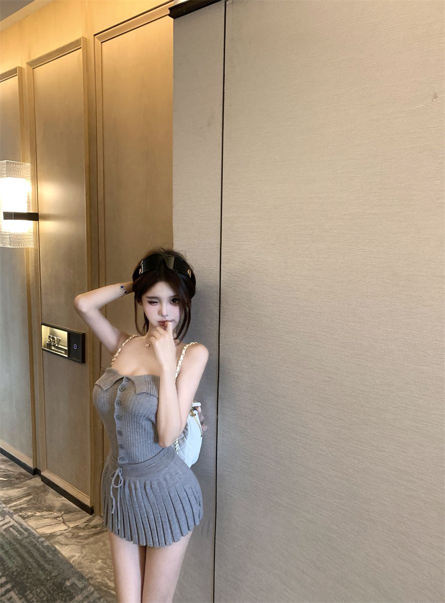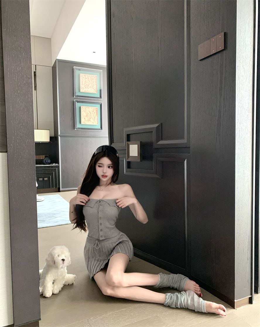순수한 욕망 스타일 회색 아름다운 뒤 니트 튜브 탑 여성 여름 캐주얼 정장 주름 스커트 짧은 치마 투피스 세트스토어 가기