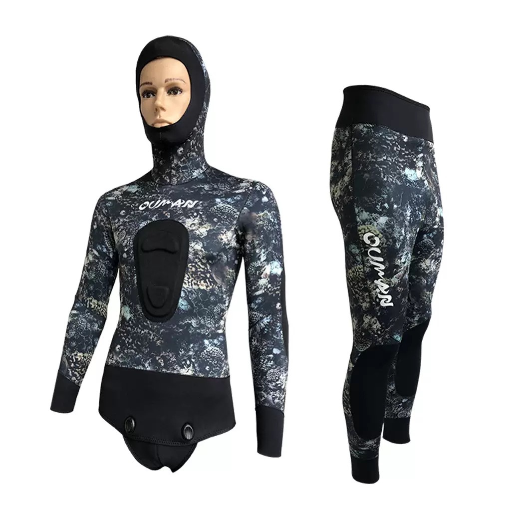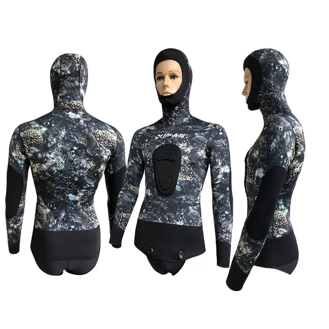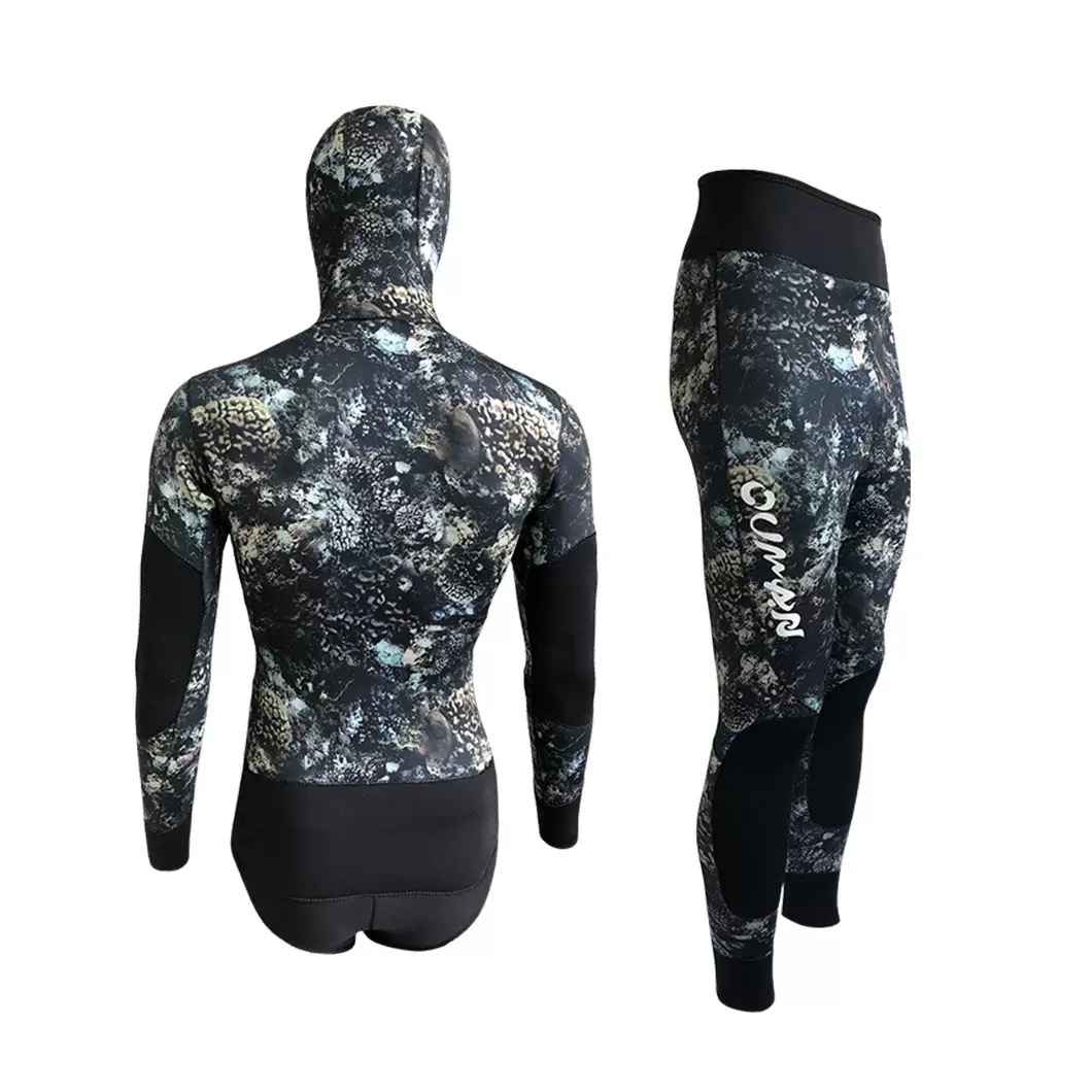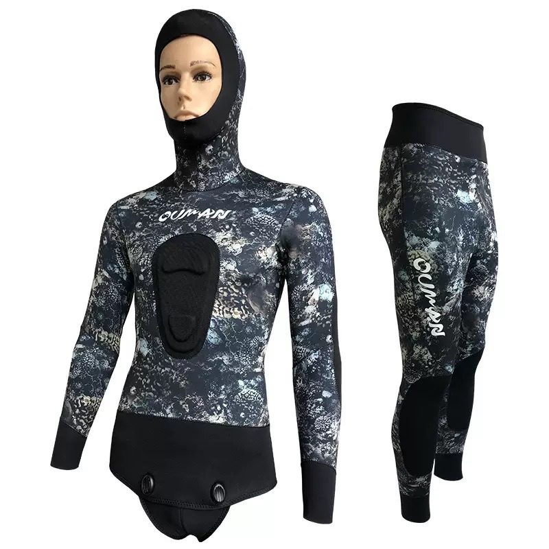 네오프렌 잠수복 5MM 위장 스플릿 투피스 잠수복 후드 방한 및 따뜻한 잠수복