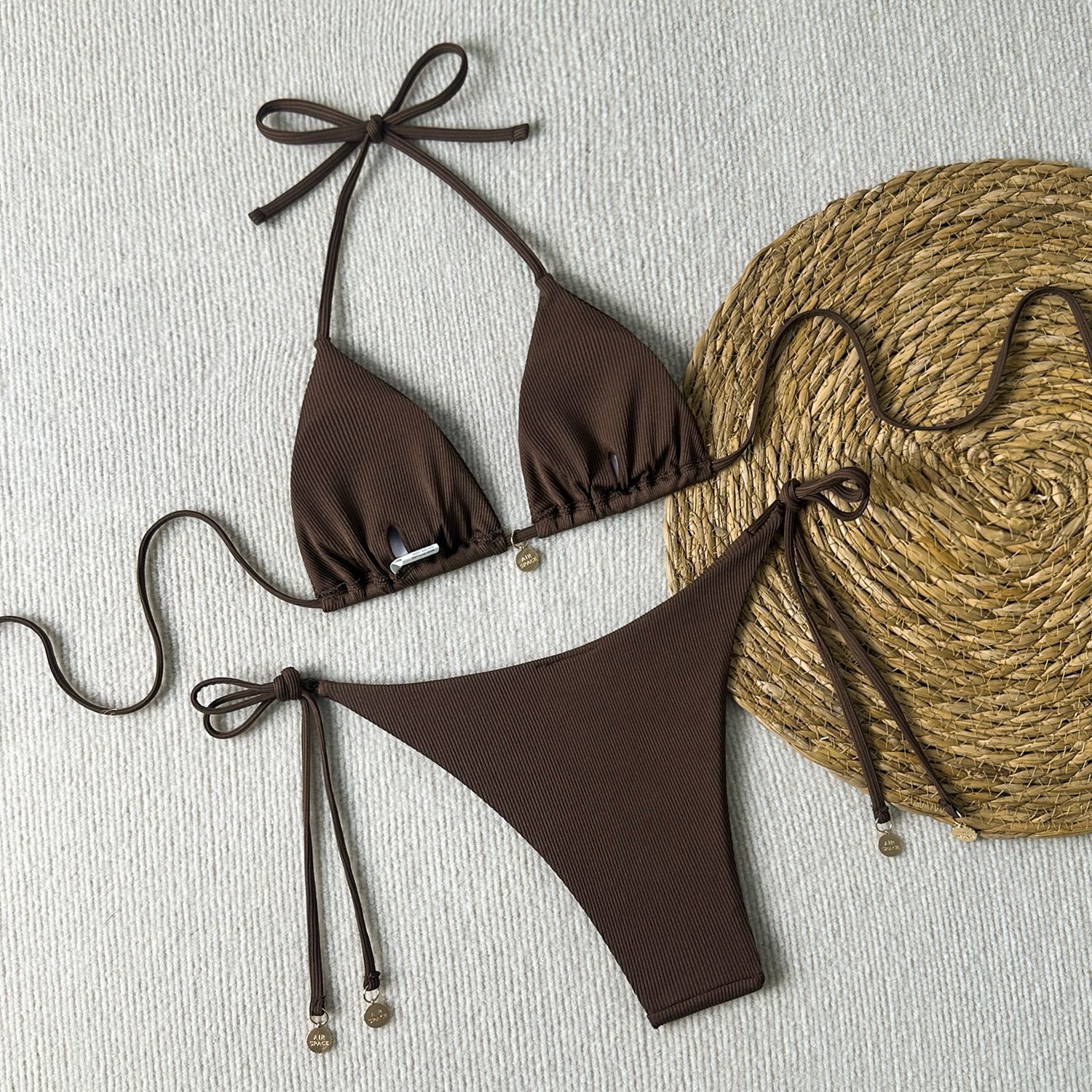 Spot 유럽과 미국의 새로운 대외 무역 솔리드 컬러 레이스 업 홀터넥 투피스 비키니 비키니 스플릿 수영복 여성용 크로스 보더스토어 가기