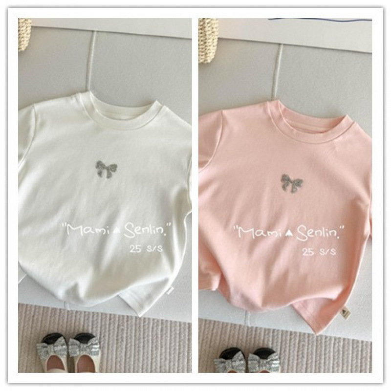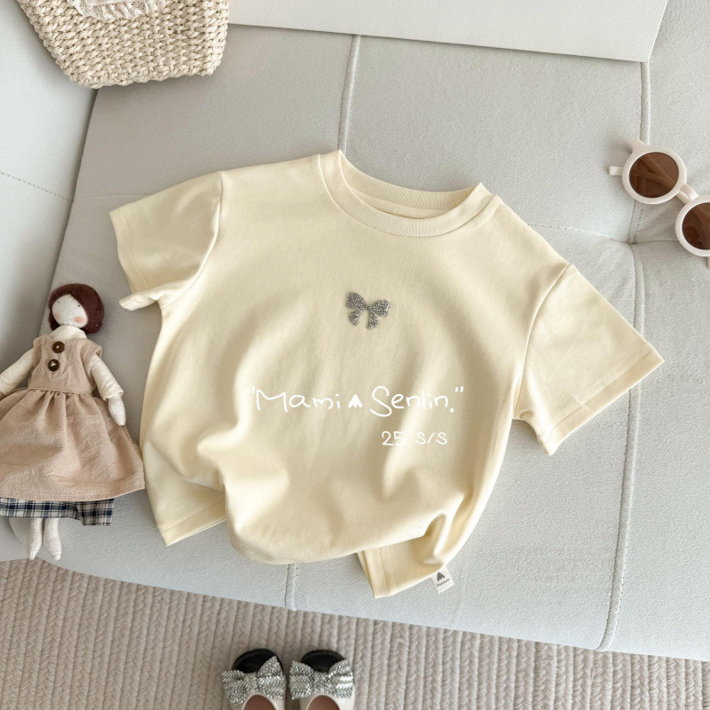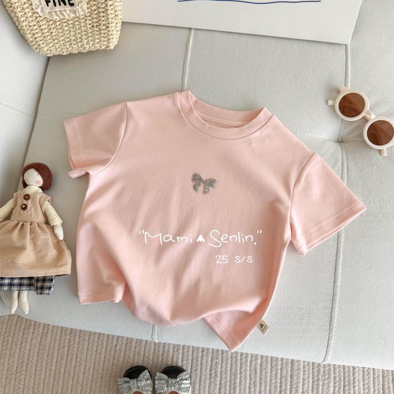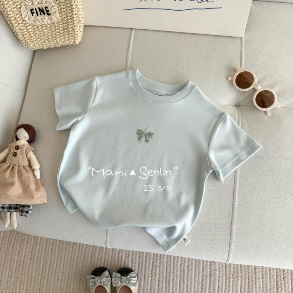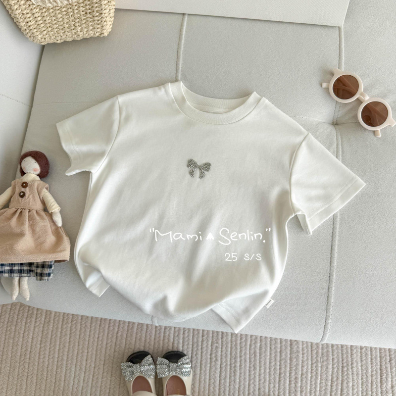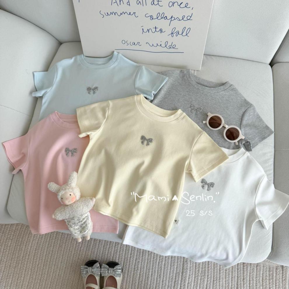 여아 티셔츠 반팔 여름 신작 보우 핫 다이아몬드 티셔츠 세련된 베이비 여름 코튼 탑 어린이 다용도
