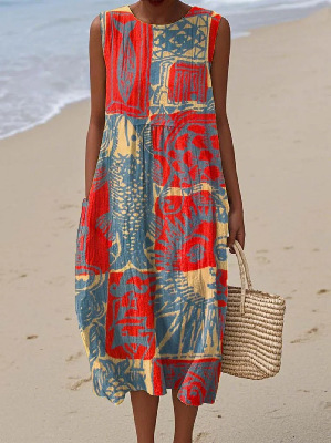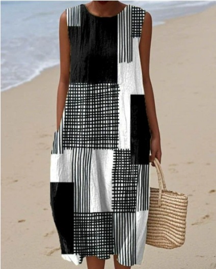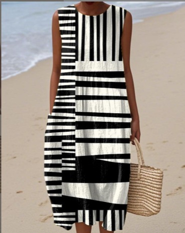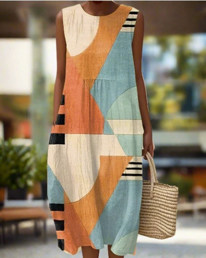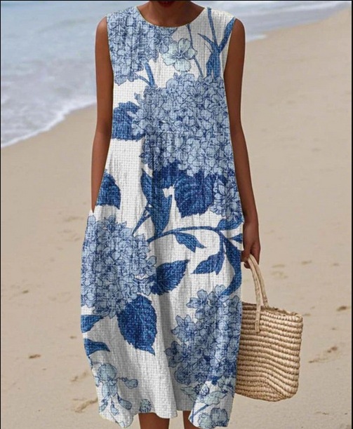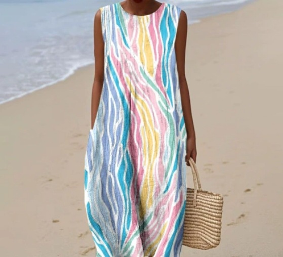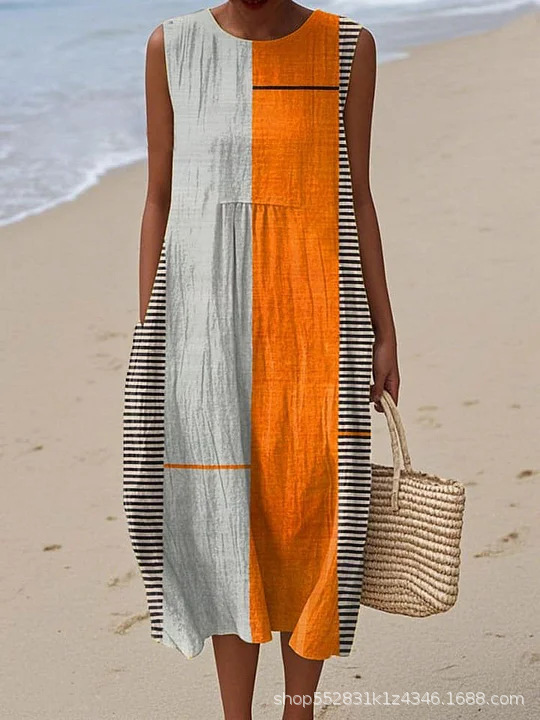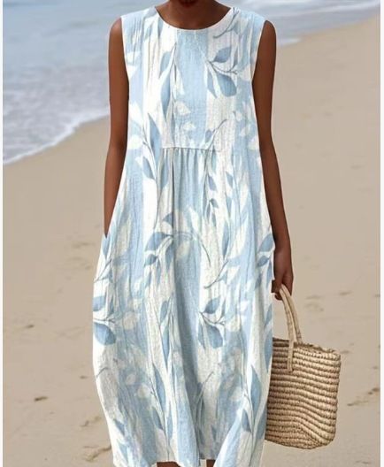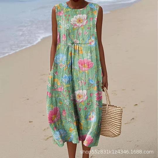 2025 유럽과 미국의 봄 여름 새로운 스타일 민소매 캐주얼 프린트 기질 롱 스커트 드레스 슬림하고 신선한 캐주얼 스커트