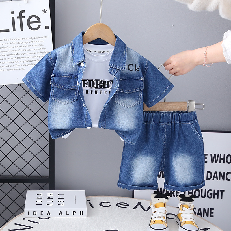 소년 반팔 2025 여름 신작 소년 옷깃 문자 더블 포켓 워시 데님 셔츠 반팔 3 피스 세트스토어 가기