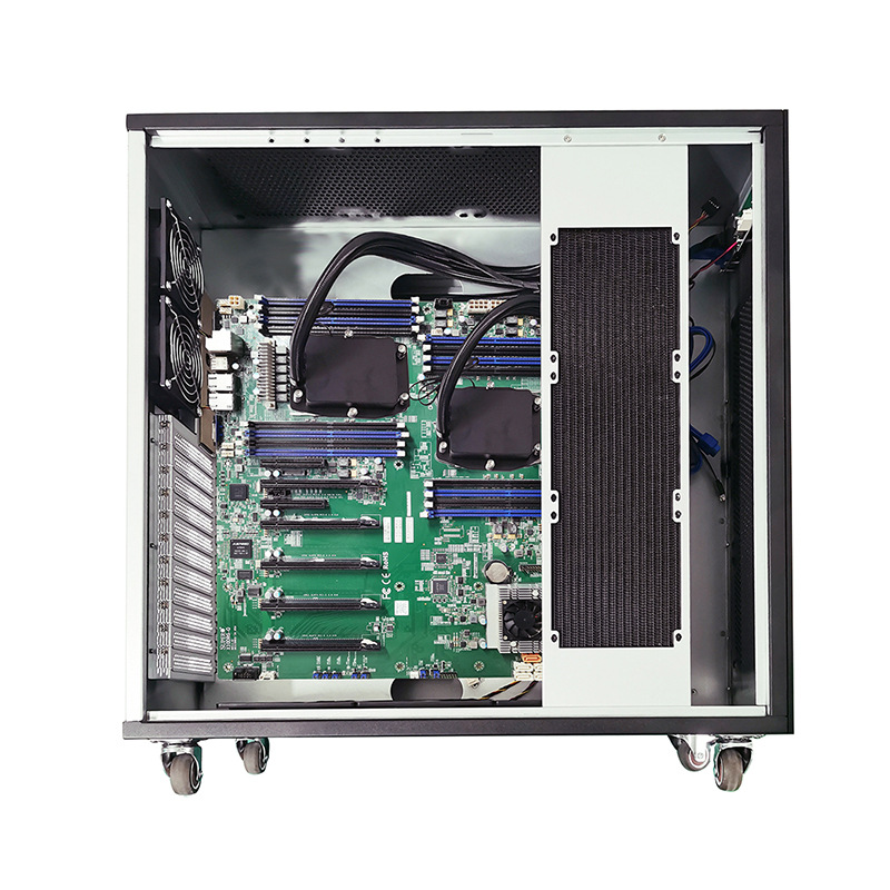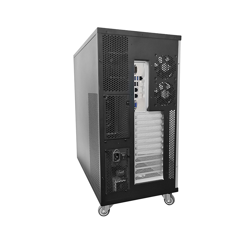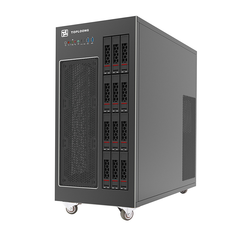拓普龙塔式机箱尺寸为高530mm*宽275mm*深555mm,前置12盘位热插拔3.5"兼容2.5",内置4个2.5",12位硬盘 MINI SAS-HD背板(12GB) SGPIO报错功能,后置2个8公分风扇,内置2个8公分风扇,底部3个12公分风扇。 前面板3个12公分风扇位可安装360冷板,顶部3个12公分风扇位可安装360冷板,左侧3个12公分风扇位可安装360冷板,11个全高PCI/PCIE扩展槽位,竖插,能最大程度满足人工智能等新兴领域的开发与应用,适用于HPC、大数据分析、3D 图形应用、视频解码、深度学习、科学计算等应用场景。