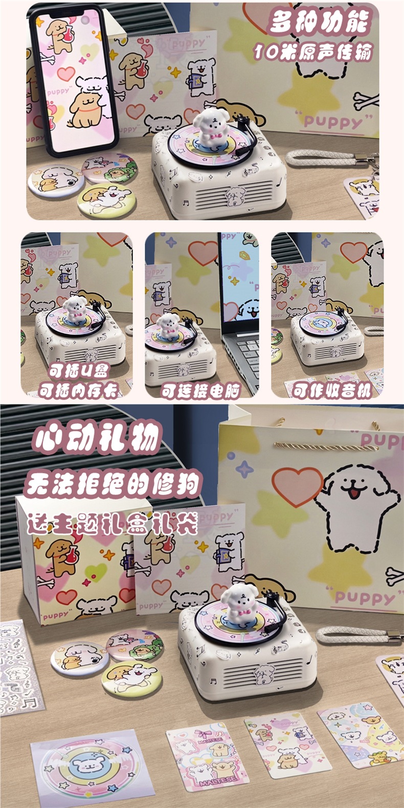 • 밀 한 개가 포함된 고급스러운 장식품 모델) 귀여운 강아지 스피커 + 스티커*2 + 선물 가방 + 귀여운 강아지 장식품 + 주변 장치