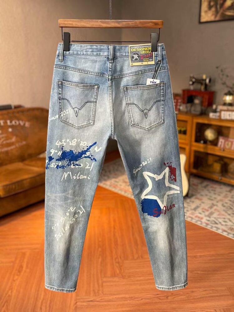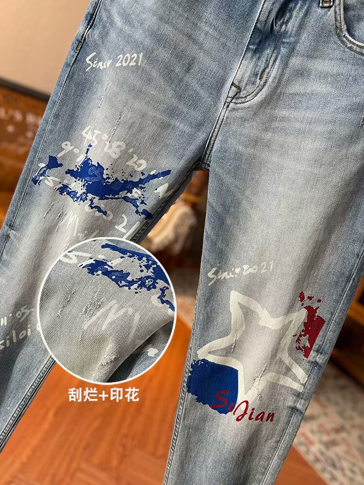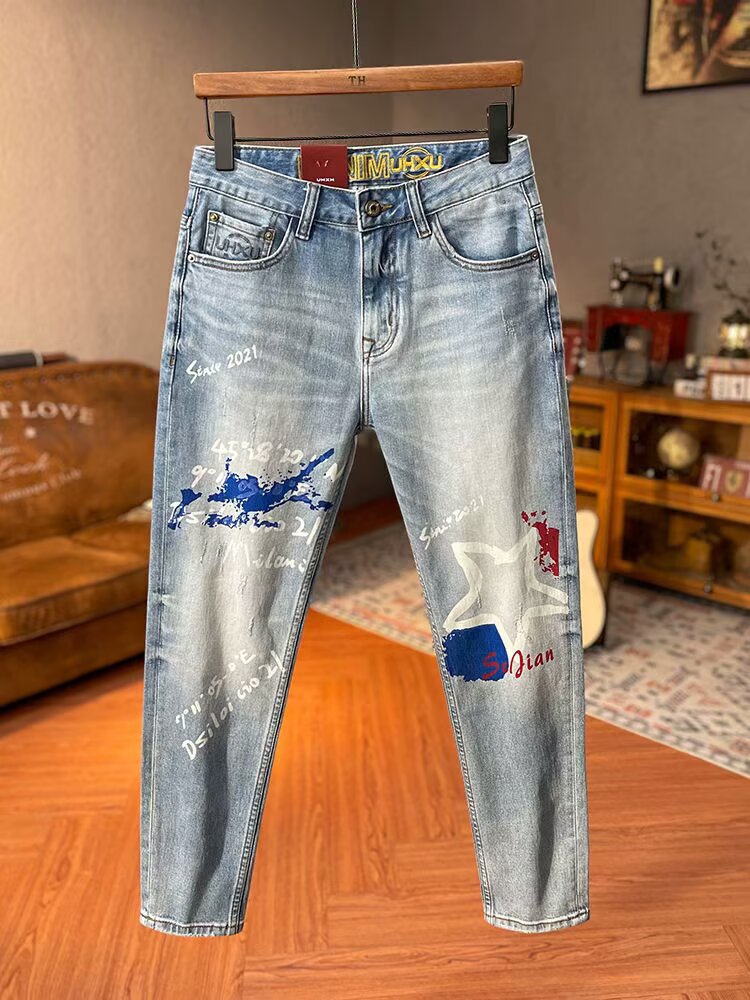 남성용 맞춤형 디자인 워싱 청바지, 고급 프린트 트렌디 아메리칸 하이 스트리트 다용도 슬림핏 디자인 바지