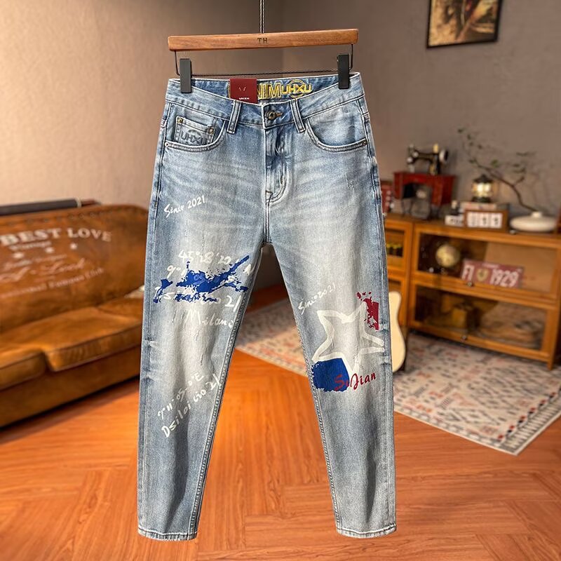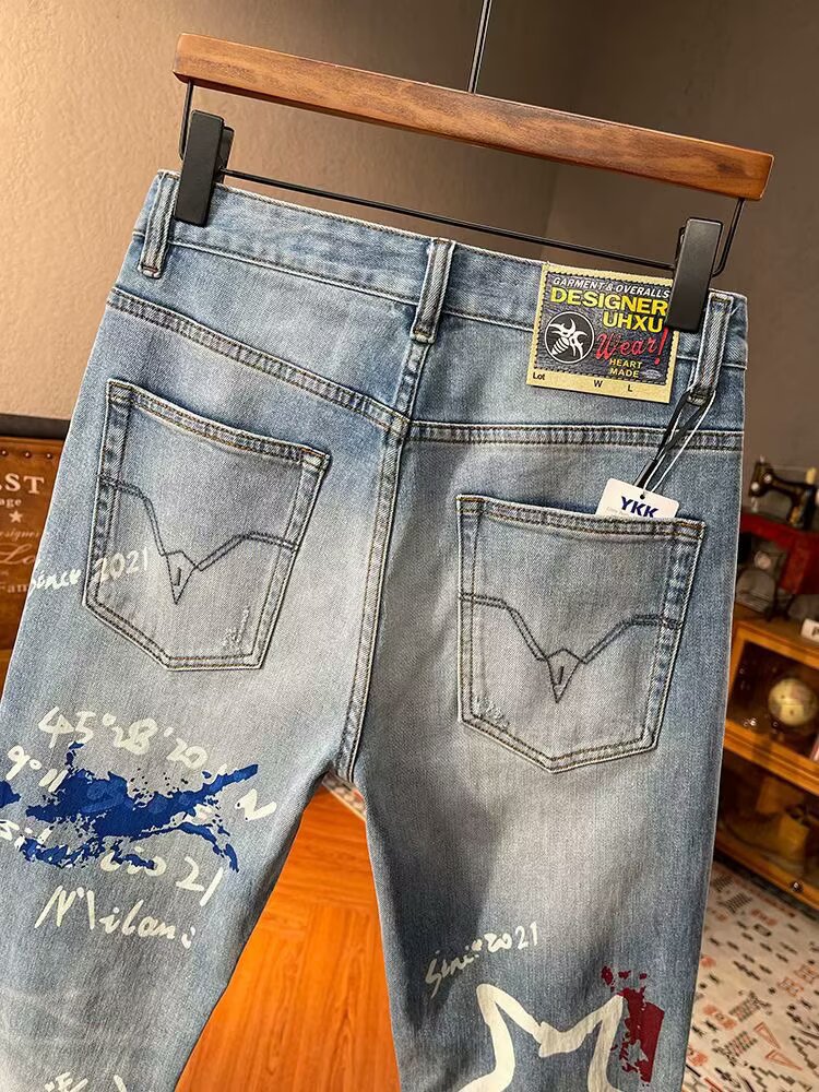 남성용 맞춤형 디자인 워싱 청바지, 고급 프린트 트렌디 아메리칸 하이 스트리트 다용도 슬림핏 디자인 바지스토어 가기