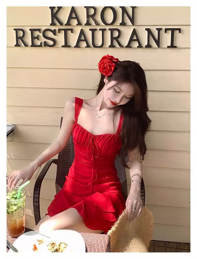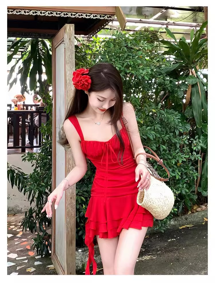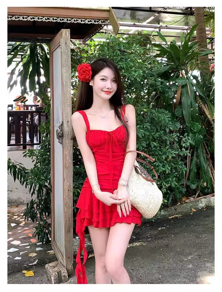 해변 휴가 스타일 불규칙한 디자인 레드 비키니 서스펜더 원피스 스커트 수영복으로 허리를 슬림하게 만들어줍니다.